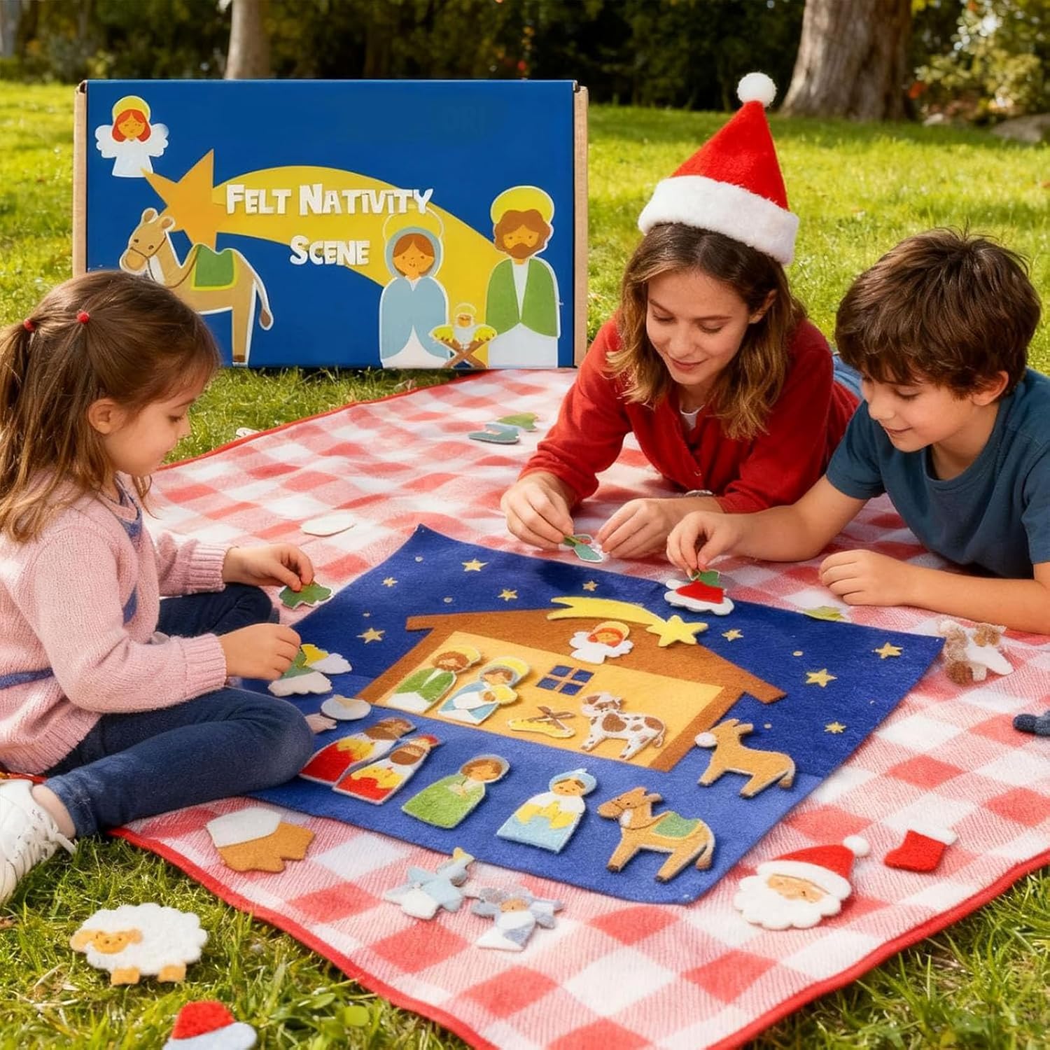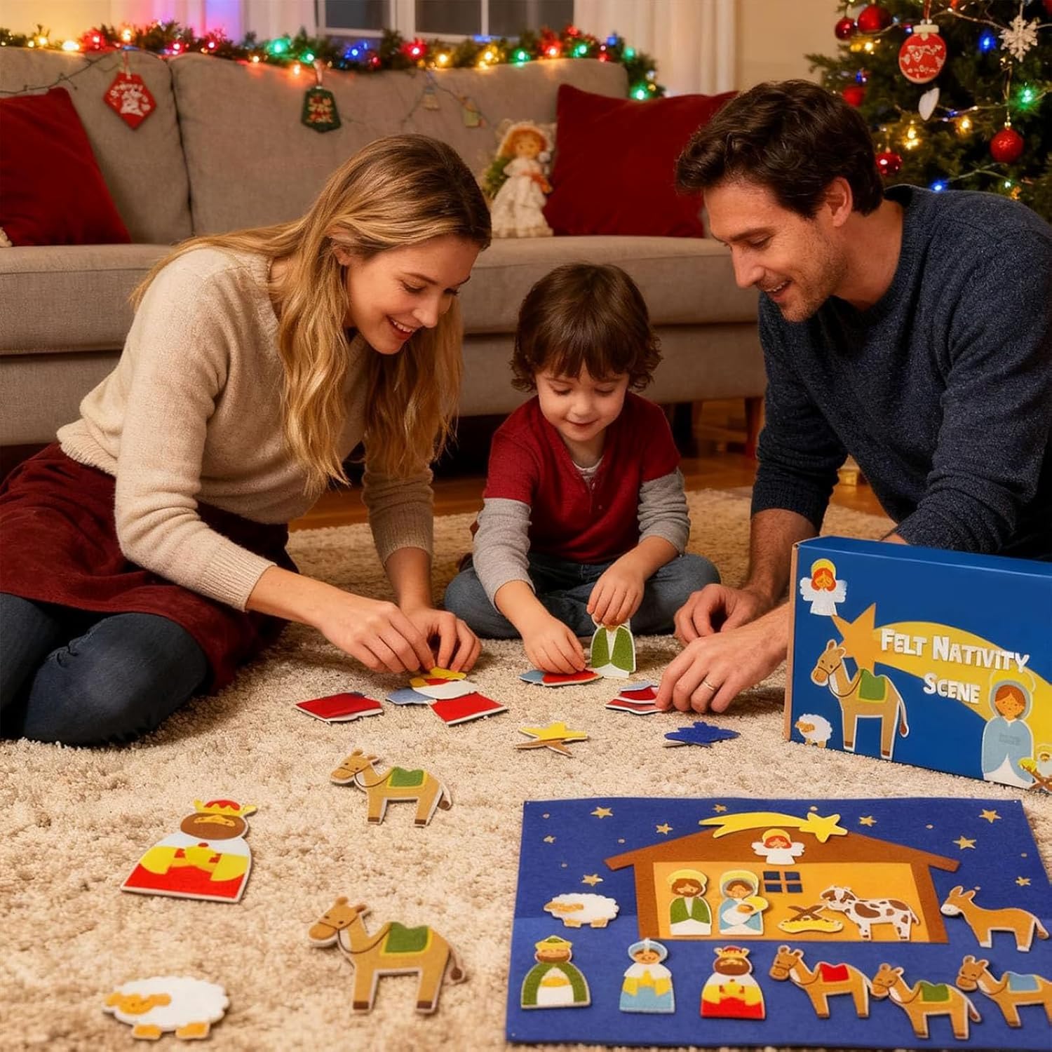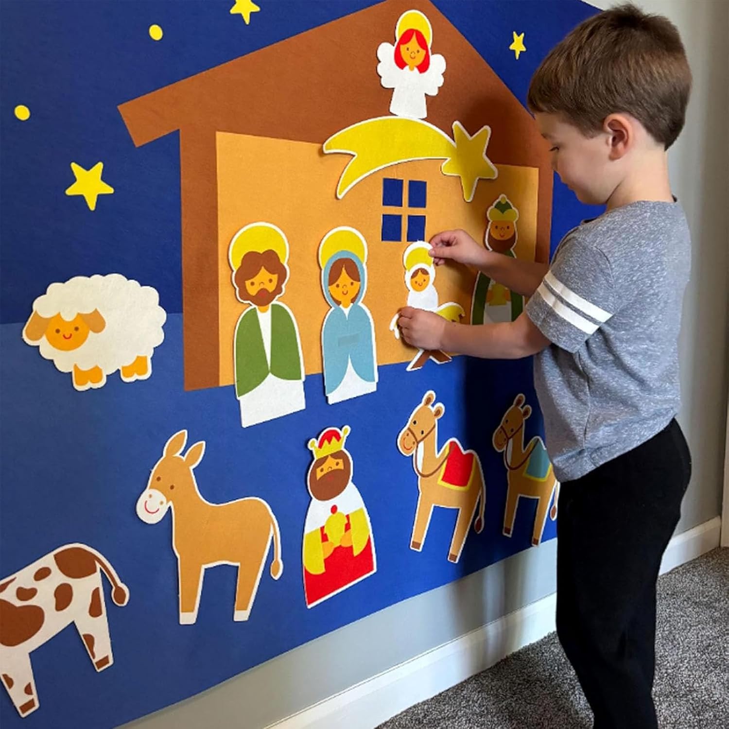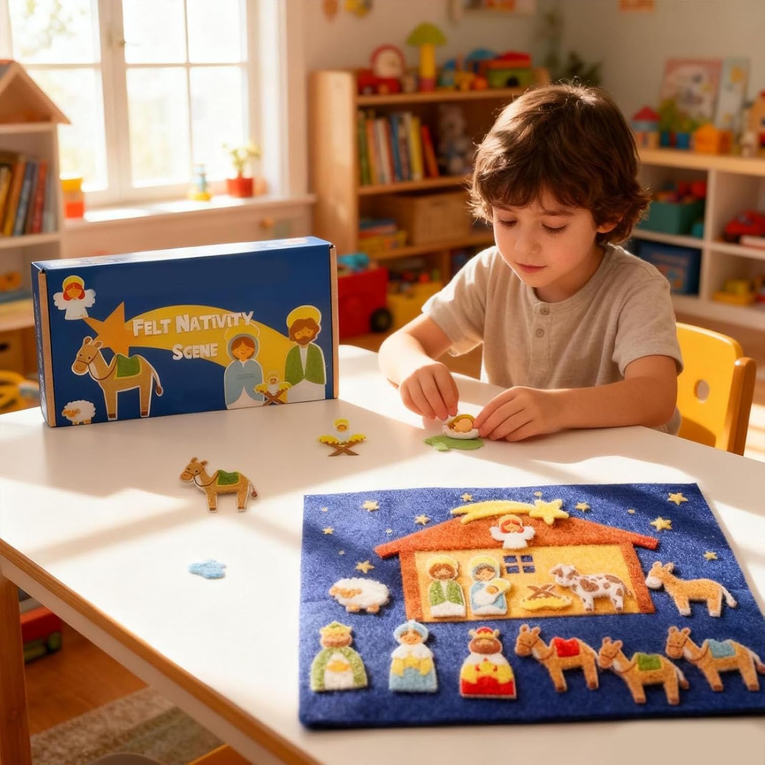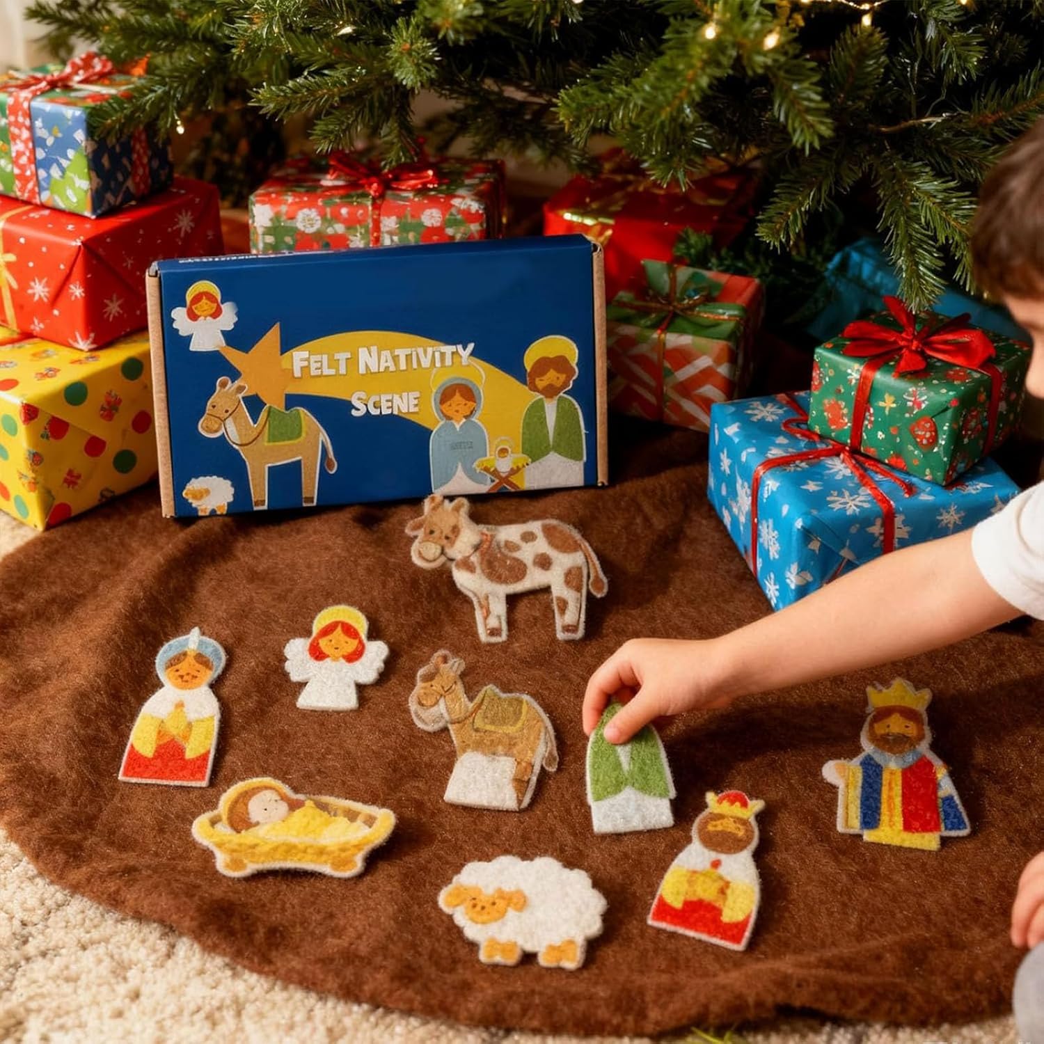 Attività natalizia coinvolgente per bambini: dai vita alla storia della natività! I tuoi nipoti adoreranno disporre le statuine in feltro del presepe, creando un'esperienza natalizia divertente e interattiva che stimola l'immaginazione. Design vivace e sicuro per i bambini: presenta elementi in feltro di alta qualità dai colori vivaci con dettagli affascinanti che catturano l'attenzione dei bambini. Tutti i pezzi sono adatti ai bambini e privi di spigoli vivi, il che li rende perfetti per le manine dei più piccoli, che possono giocarci in tutta sicurezza. Installazione senza problemi: niente colla, niente problemi! Basta posizionare le statuine in feltro sullo sfondo stabile e dare inizio al divertimento: è un'attività facile e pratica, perfetta per le manine dei più piccoli. Set completo all-in-one: include statuine in feltro resistenti raffiguranti la Sacra Famiglia, i Re Magi, il pastore, l'angelo, gli animali e lo sfondo della stalla. Tutto si ripone facilmente nella custodia inclusa, per maggiore praticità e organizzazione. Perfetta per iniziare una tradizione natalizia: crea preziosi ricordi di famiglia mentre nonni e nipoti allestiscono il presepe insieme anno dopo anno. È un regalo di Natale ideale che unisce fede, divertimento e legame familiare in un'unica attività significativa.