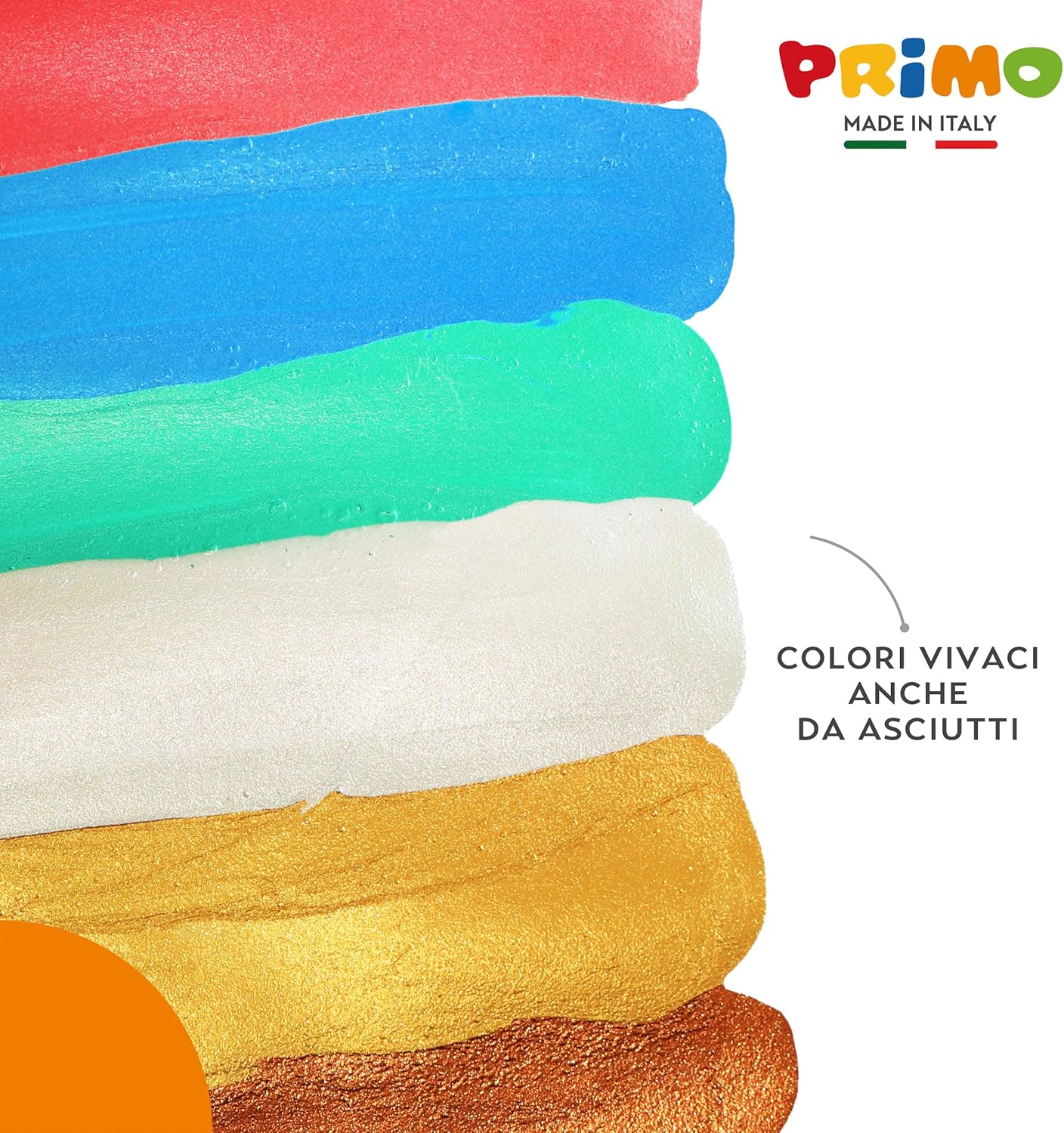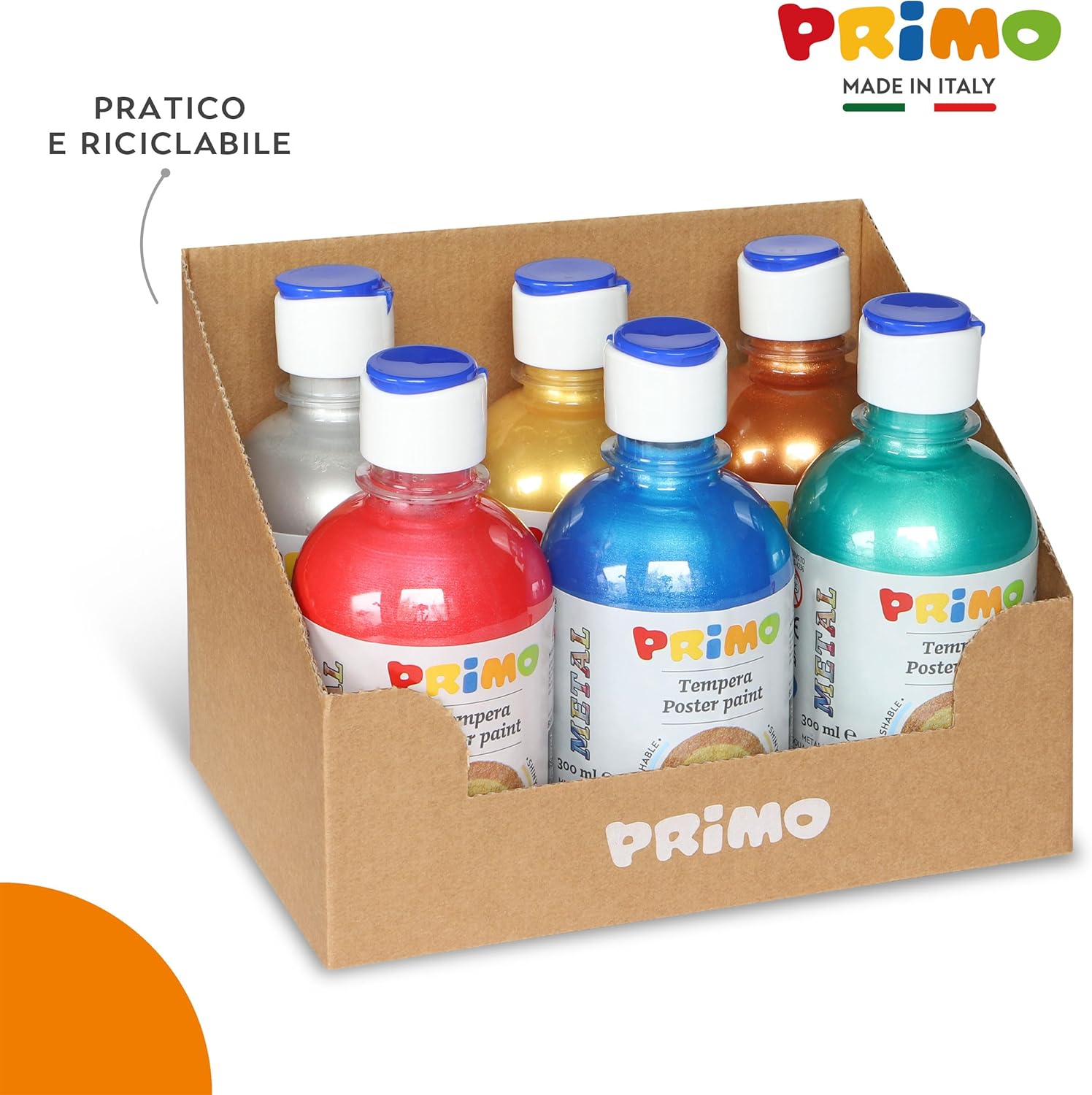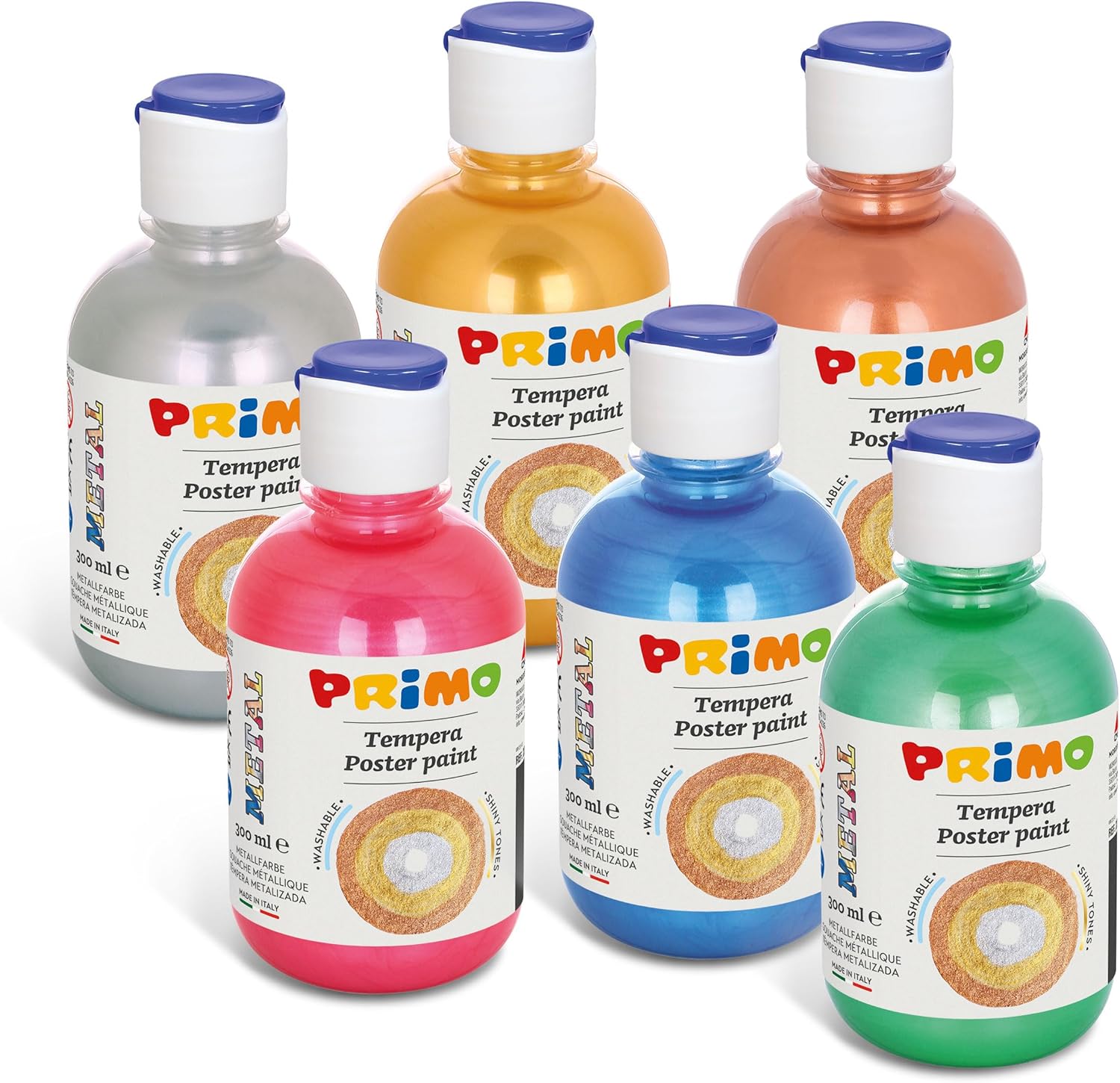 TEMPERE LAVABILI AD ACQUA: Prodotto a base d’acqua realizzato con energia pulita in confezioni riciclabili e riutilizzabili. Compatibile con tutti i prodotti ad acqua delle linee PRIMO PER LAVORETTI ARTISTICI ED EFFETTI CREATIVI: Queste tempere offrono effetti cromatici brillanti che aggiungono un tocco di lucentezza e raffinatezza ai progetti artistici. I colori consentono stesure coprenti e sovrapposizione di strati, garantendo una pennellata uniforme e ottimi risultati di brillantezza e vivacità dei toni per effetti speciali e metallizzati VERSATILE PER STOFFA, VETRO E ALTRE SUPERFICI: Prodotto utilizzabile su una vasta gamma di superfici, tra cui carta, cartoncino, legno, stoffa, vetro, terracotta, metallo e plastica. Possono essere fissate con vernice o fissativo idoneo per garantire una maggiore durabilità e resistenza nel tempo USO FACILITATO E ANTISPRECO CON TAPPO DOSATORE: Il prodotto è di prima qualità e pronto all'uso in bottiglie dotate di tappo dosatore per una distribuzione controllata, precisa e uniforme del colore. Rimuovere subito le macchie secondo istruzioni. Rimuovere il sottotappo di sicurezza prima dell’uso PRIMO BY MOROCOLOR, QUALITÀ MADE IN ITALY: I colori fanno parte della nostra tradizione di famiglia, iniziata nel 1933 con un gessetto bianco da lavagna. Da oltre 90 anni trasmettiamo l'equilibrio perfetto tra creatività e responsabilità con prodotti per bambini e artisti di alta qualità, sicuri e sostenibili, coniugando tradizione e innovazione e promuovendo il valore del Made in Italy