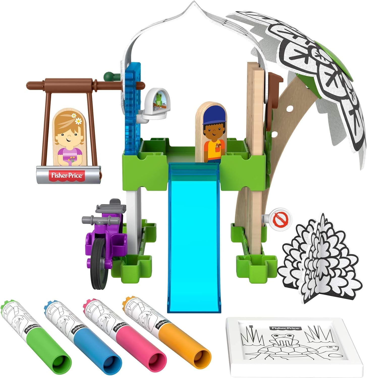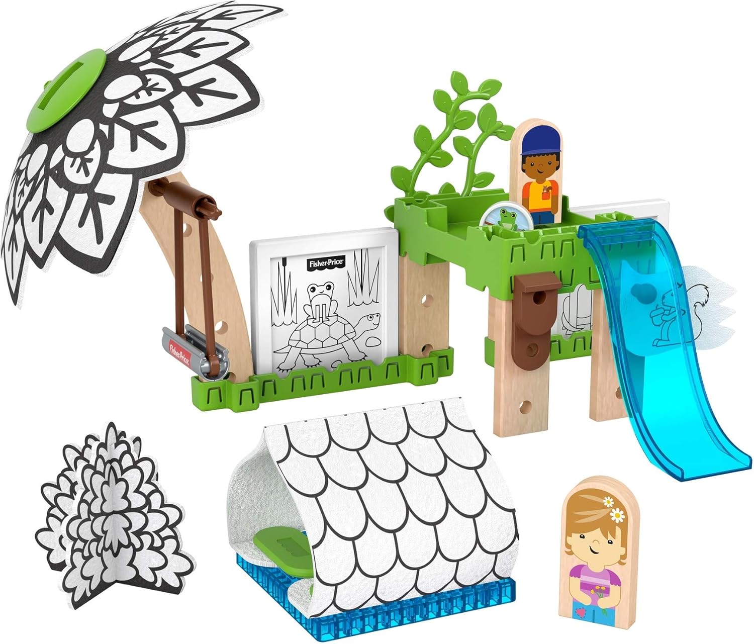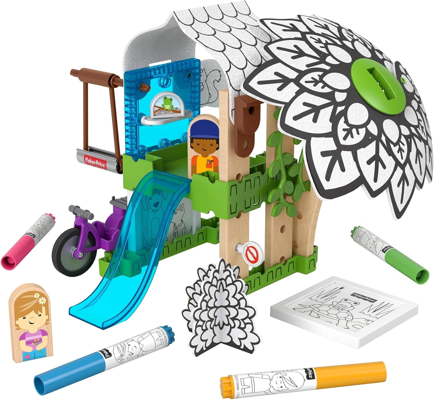 I love the Wonder Makers Design System. They've just come out with a new variation that adds a craft-element to the system - the fabric is white with black markings, and can be colored with the included markers, and then washed and colored again! I tried the new coloring fabric, and it washed more thoroughly and easily than I expected - I figured there would be some residue, but actually it came out very clean after less than a minute with rinsing it under cold water while rubbing it a little with my fingers. The four markers included are nice and bright with good rich colors - blue, pink, green, and yellow. It's recommended to only use the included markers, so I did not try other markers to see if they would wash out. The colors bled just slightly into each other, but the resulting look was still nice and was attractive. They show that you can also color the white wall panels, but they note that those are not washable. While the walls themselves are made from plastic, the color-able parts are paper-covered, so they can't be washed. About the rest of the playset - the new design system is really cool. Wonder Makers was introduced in 2019 and I have been impressed with the playability and quality of the sets. The pieces are easy to connect, they stay connected for playing, and then when you're ready to take them apart, they come apart with a gentle tug. The Treehouse is fun to build and has plenty of accessories to play with, including some elements specifically for this set, like colorable walls and fabric. The instructions are clear and mostly pictures, with some tips in words. There are small pieces, so the set is intended for ages 3+. The instructions start out showing how to create a simpler shrubbery, then moves on to building the treehouse.. The instruction sheet includes two additional ideas for what you can build. Whether you play with this set on its own or together with others, there are plenty of ways to use the pieces to build different things. The boy and girl figures and the track pieces are natural wood. Some pieces are rubber or plastic. The pieces are all well-made. I like that many of the pieces can be used in multiple ways. For example, even the treehouse floor piece, which could have been very single-purpose, looks equally reasonable as a wall, floor, ceiling, roof, and more. I think it's cool how the people figures are painted with the person facing forward on one side, and facing sideways on the other side, so that they can be used in different ways. Some of the vehicles available in this system have the slot for the figure facing forward and some in profile, so it's cool that they thought of this. The boy is painted with a orange and yellow shirt with a squirrel in his shirt pocket. One side of the wooden boy figure shows him facing forward and the other side in profile. The girl is painted with a bouquet of flowers in her hand. The primary theming is on the accessories, so that the fundamental building blocks are essentially theme-neutral, and can be easily combined with other sets for larger building possibilities. Overall, this new design system is well thought out and a great new way to build. I really like it. It brings to mind the great toys of my youth that were very open-ended - Tinker Toys, Erector Sets, etc. I think this will be a classic.