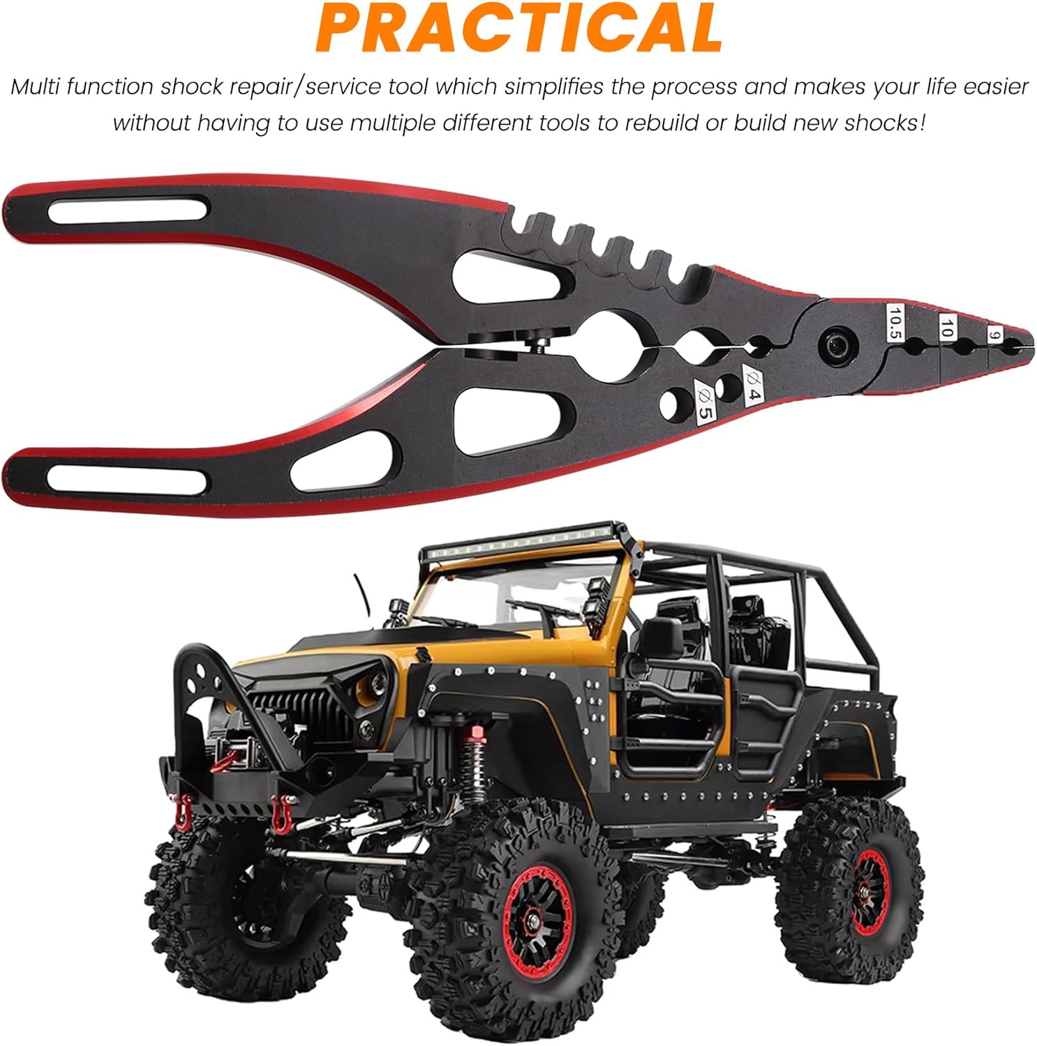 Strumento multifunzionale per la riparazione/manutenzione degli ammortizzatori che semplifica il processo e ti rende più facile poiché non è necessario utilizzare diversi strumenti per ricostruire o costruire nuovi ammortizzatori! Più pezzi graduati consentono di misurare lunghezze diverse per garantire che tutti e quattro gli ammortizzatori siano uguali. Oltre agli ammortizzatori sono presenti fori da 4 mm e 5 mm che fungono da supporti per i connettori a saldare.