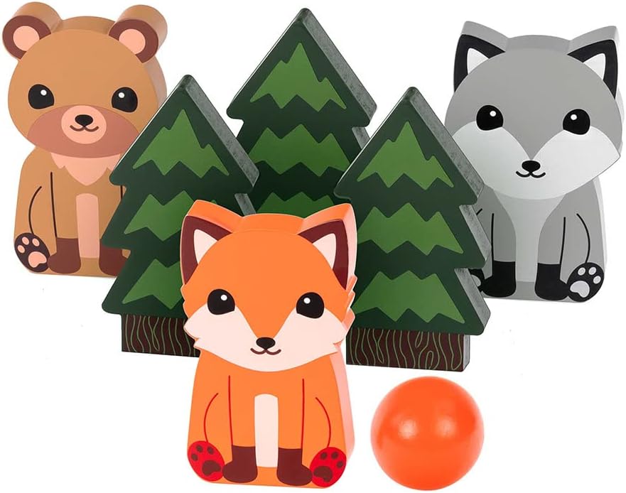 Posizionali e abbattili per ore di divertimento nel bosco Include 6 birilli, 1 palla e istruzioni Posiziona i birilli degli animali tra i birilli sugli alberi per creare la tua scena nel bosco Viene fornito con una pratica custodia Ideale per giocare al chiuso o all'aperto