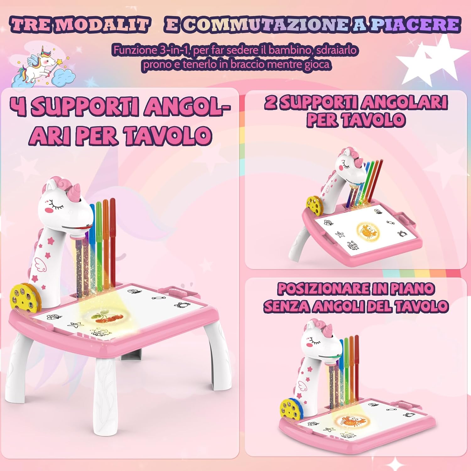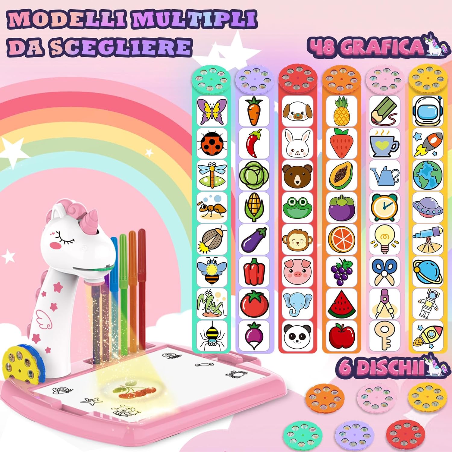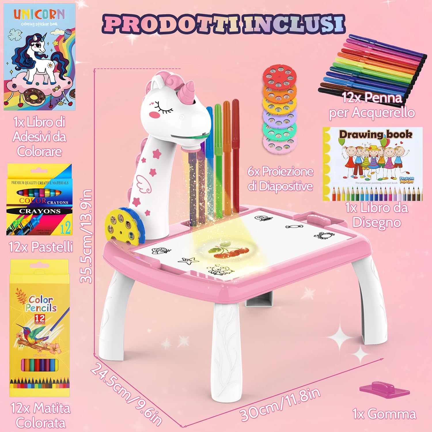 Tavolo Proiettore Disegno Bambini: Incoraggia i tuoi bambini a diventare piccoli artisti con questo tavolo da disegno a proiezione! Il proiettore regolabile offre infinite possibilità creative, con 48 immagini vivaci da ricalcare e colorare. Perfetto per sviluppare la creatività, i bambini possono esplorare l'arte in modo pratico e fantasioso Design sicuro e resistente: Questo proiettore disegno bambini è realizzato con materiali di alta qualità e di lunga durata. I bordi lisci e la luce delicata offrono tranquillità ai genitori. I bambini possono divertirsi per ore senza rischio di infortuni, concentrandosi completamente sulla loro creatività Facile da Usare: Guarda la creatività del tuo bambino prendere vita con un semplice gesto! Basta inserire la diapositiva nel proiettore, ruotare lentamente il disco fino a che l'immagine è chiara, e lasciare che inizi la creazione. Con il proiettore rotante a 360° e l'altezza regolabile, i bambini possono cambiare facilmente i disegni e esplorare la loro vena artistica in modo divertente e gratificante Sviluppo delle Competenze: Questo tavolo da disegno a proiezione bambini non è solo divertente, ma è anche un prezioso strumento educativo. Disegnando, i bambini sviluppano naturalmente competenze fondamentali come la coordinazione occhio-mano e la concentrazione, esplorando colori, motivi e forme. I genitori possono unirsi a loro per trascorrere del tempo prezioso in famiglia Niente più Disordine: Mantieni lo spazio creativo ordinato! Questo proiettore disegno bambini include scomparti integrati per diapositive e strumenti di disegno. È la soluzione perfetta per mantenere organizzati i materiali artistici, permettendo ai bambini di trovare tutto ciò di cui hanno bisogno e imparare a riporre i loro strumenti dopo aver completato il loro capolavoro
