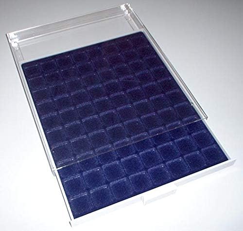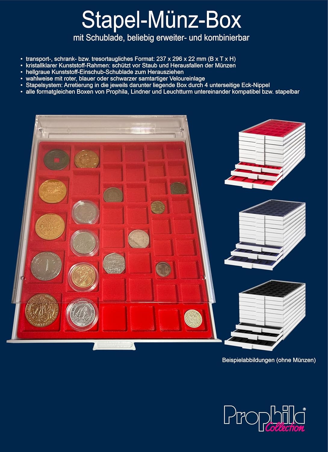 Portamonete con struttura in plastica trasparente, inserto in plastica grigia (cassetto) e inserto in velluto blu con 80 scomparti angolari. Adatto per monete fino ad un diametro di 24 millimetri. Formato: 237 x 296 x 22 mm. Completamente combinabile con Lighthouse, Lindner ...