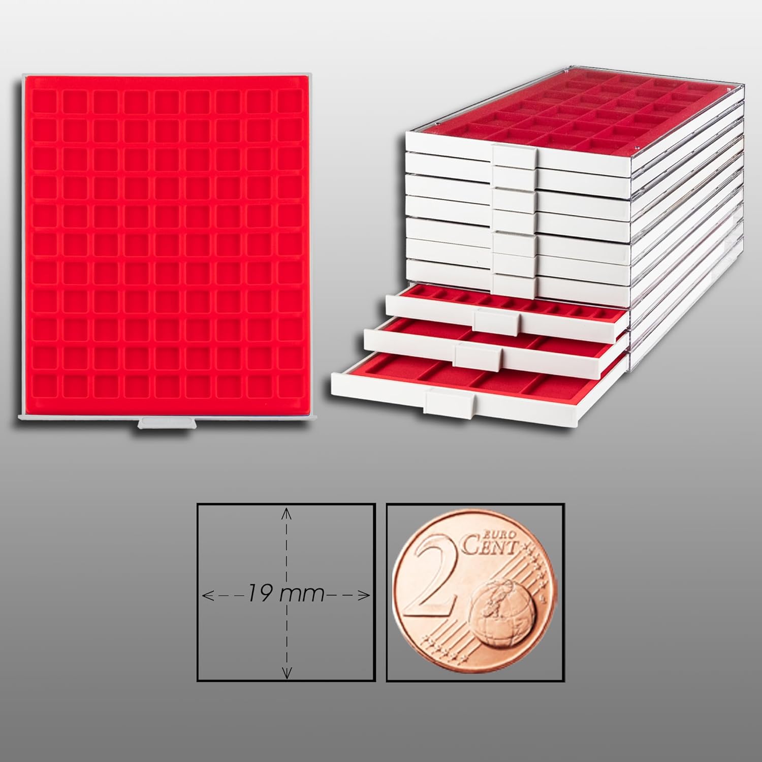 Portamonete con struttura in plastica trasparente, inserto in plastica grigia (cassetto) e inserto in velluto rosso con 99 scomparti angolari. Adatto per monete fino ad un diametro di 19 millimetri. Formato: 237 x 296 x 22 mm. Completamente combinabile con Lighthouse, Lindner ...