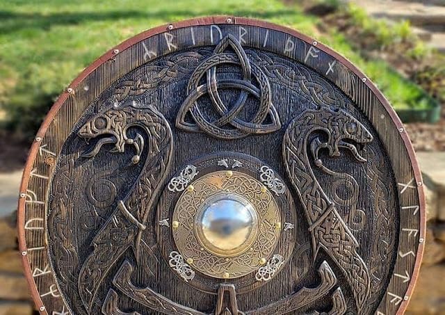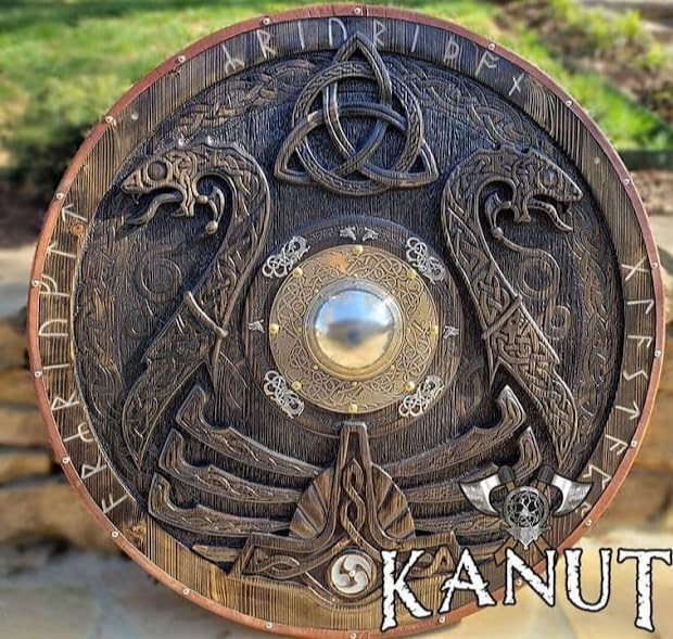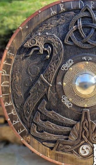 Design impeccabile: questo scudo è meticolosamente realizzato per emulare gli iconici scudi vichinghi del passato, con dettagli intricati e un design ispirato a fonti storiche autentiche. Finitura marrone intenso: lo scudo vanta una finitura marrone scuro che aggiunge un tocco di eleganza rustica a qualsiasi spazio, evocando il fascino robusto dell'antica artigianato norreno. Dimensioni autentiche: misura 61 cm di diametro, questo scudo è perfettamente dimensionato per gli adulti, offrendo un impressionante pezzo da esposizione che attira attenzione e ammirazione. Costruzione durevole: realizzato con materiali di qualità durevole, questo scudo è costruito per durare, garantendo che rimanga una parte importante del tuo arredamento per gli anni a venire. Decorazione versatile: sia esposto con orgoglio su una parete o incorporato in composizioni decorative a tema, questo scudo vichingo aggiunge un'aria di mistica e avventura a qualsiasi stanza.