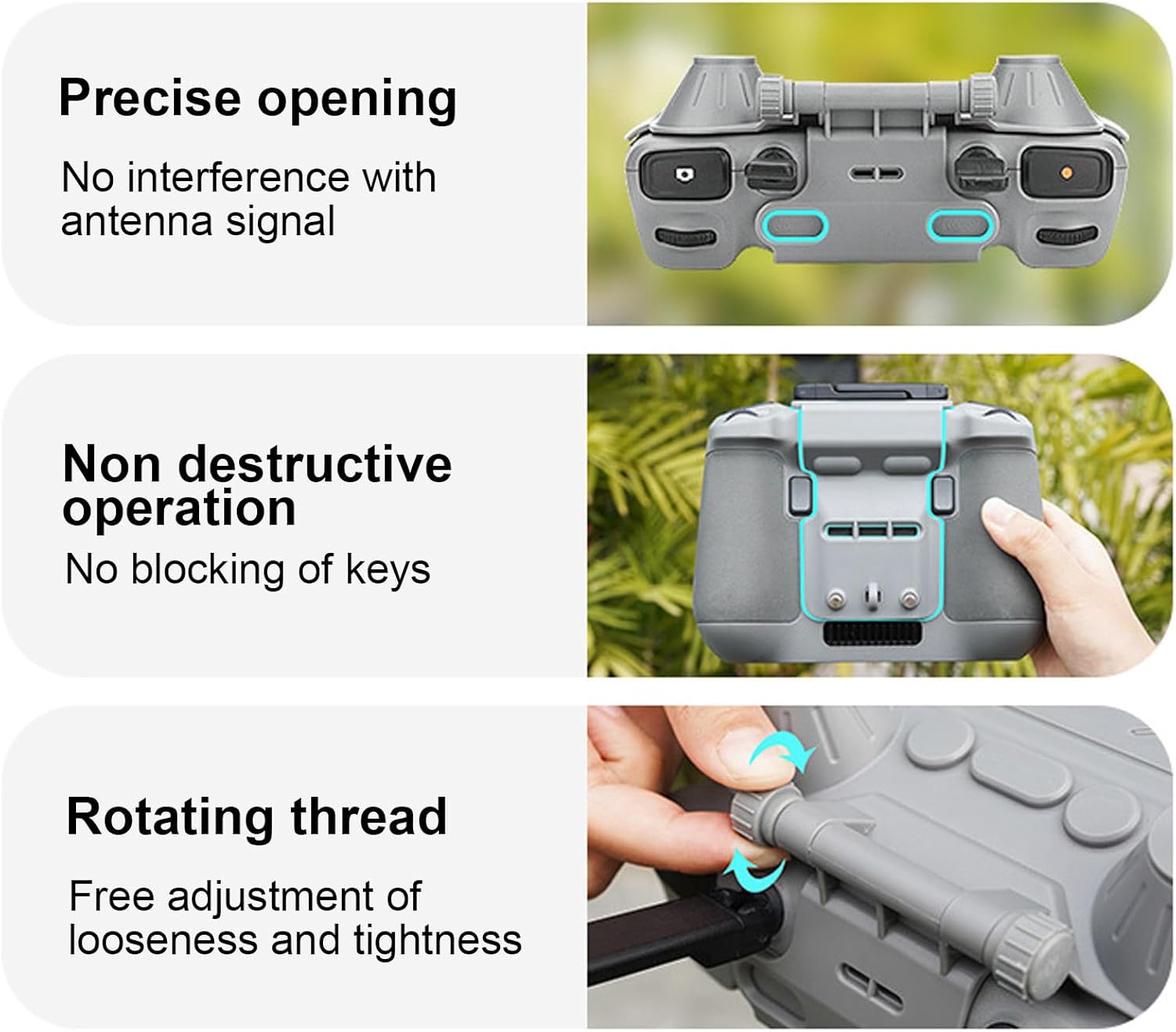 Parasole: quando si scattano foto aeree in ambiente con forte illuminazione, può bloccare efficacemente il riflesso dello schermo e migliorare la visibilità dello schermo. Angolo regolabile: il parasole del controller può essere regolato su diverse angolazioni, offrendo flessibilità e garantendo una visibilità ottimale in varie condizioni di illuminazione. Design pieghevole: il parasole con telecomando presenta design pieghevole, che lo rende compatto e comodo da trasportare e riporre quando non in uso. Installazione semplice: la protezione per lo schermo del parasole del controller può essere facilmente installata sul telecomando, consentendo una configurazione rapida e senza problemi. Maggiore durata: il parasole con telecomando è progettato per resistere alle condizioni esterne, garantendo prestazioni anche in ambienti difficili.