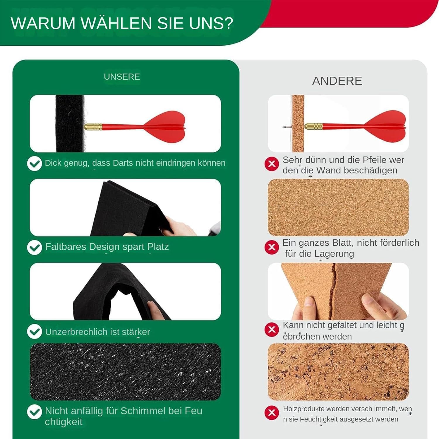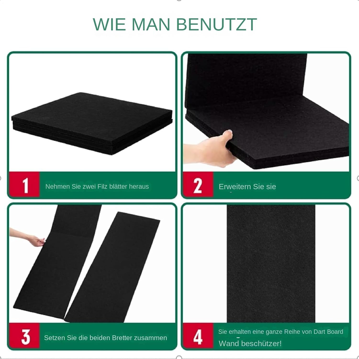 Montaggio senza utensili: montaggio diretto su diversi materiali da parete senza fori o attrezzi speciali, ideale per appartamenti in affitto e stanze hobby grazie al metodo di installazione facile da usare. Design di sicurezza migliorato: previene efficacemente i danni alle pareti con una protezione completa, aumenta la sensazione di gioco allineando con precisione le proporzioni standard delle tabelle per un uso coerente. Pratica gestione dei cuscinetti: grazie al meccanismo pieghevole intelligente, la protezione da parete può essere riposta in nicchie per risparmiare spazio, rimane indeformabile dopo l'uso e soddisfa facilmente i requisiti di accesso frequenti grazie alla facilità d'uso Efficace assorbimento degli urti: l'eccellente materiale in feltro assorbe l'energia d'impatto delle freccette in modo ottimale. Crea uno strato protettivo affidabile che previene efficacemente danni superficiali come graffi o forature. Fissaggio facile: fissaggio facile e veloce grazie al nastro biadesivo. La protezione da parete per bersaglio aderisce saldamente alla parete, senza la necessità di strumenti complicati.
