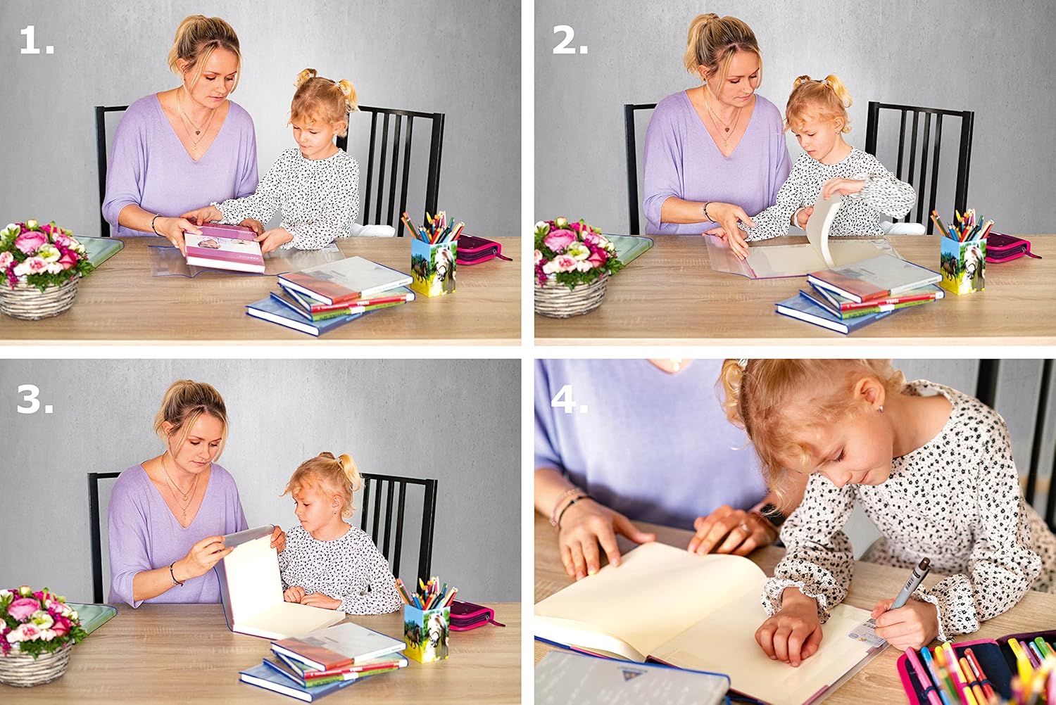 Grazie alla seconda patta i libri possono essere inseriti in modo semplice e veloce, senza plastificanti Custodia trasparente in polipropilene (PP), con bordo blu Bordi saldati robusti, senza colla, non aderisce ai libri, senza PVC, senza plastificanti