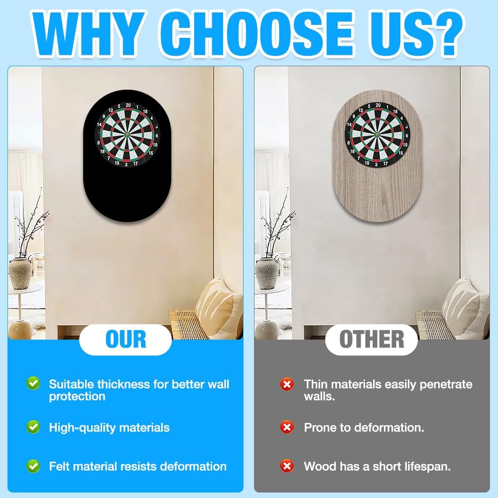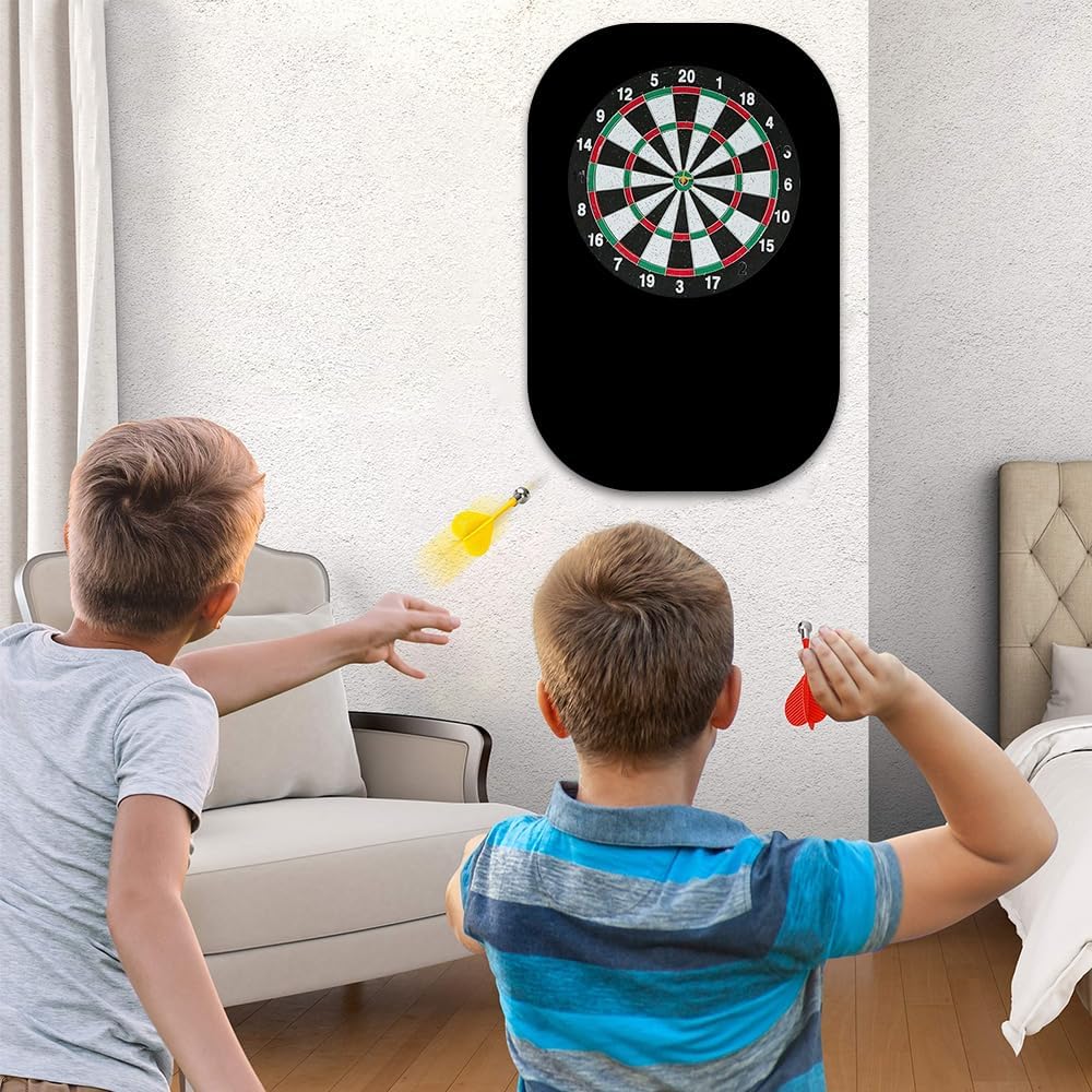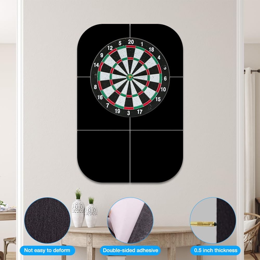 Copertura extra large per la protezione della parete: questa protezione da parete per bersaglio da 60 x 90 x 1,2 cm offre un'ampia copertura per catturare le freccette vaganti e proteggere le pareti da segni indesiderati. È un aggiornamento essenziale per qualsiasi configurazione di freccette, ideale sia per giochi occasionali che per competizioni serie. Materiale in feltro durevole: le nostre protezioni da parete per bersaglio sono realizzate in feltro ad alta densità spesso, resistente agli urti e progettate per sopportare un uso frequente delle freccette con punta in acciaio. Aiuta a prolungare la durata delle freccette mantenendo intatta la parete. Nessun attrezzo, nessuna foratura – Retro autoadesivo: dimentica il montaggio complicato: questo anello per bersaglio per freccette presenta un forte retro autoadesivo. Basta staccare e attaccare al muro. Non sono necessarie viti, nastro o hardware. Design elegante e salvaspazio: con uno spessore di soli 1,2 cm, questa protezione da parete per bersaglio per freccette si trova a filo dietro la tavola, offrendo una protezione discreta ma affidabile. Leggero e facile da riposizionare quando necessario. Ideale per qualsiasi set di freccette: a casa, in un pub o in un club, questo anello per freccette è un regalo premuroso per qualsiasi fan delle freccette. È una delle protezioni da parete per bersaglio più pratiche e facili da usare disponibili, mantenendo il tuo spazio di gioco pulito e nitido.