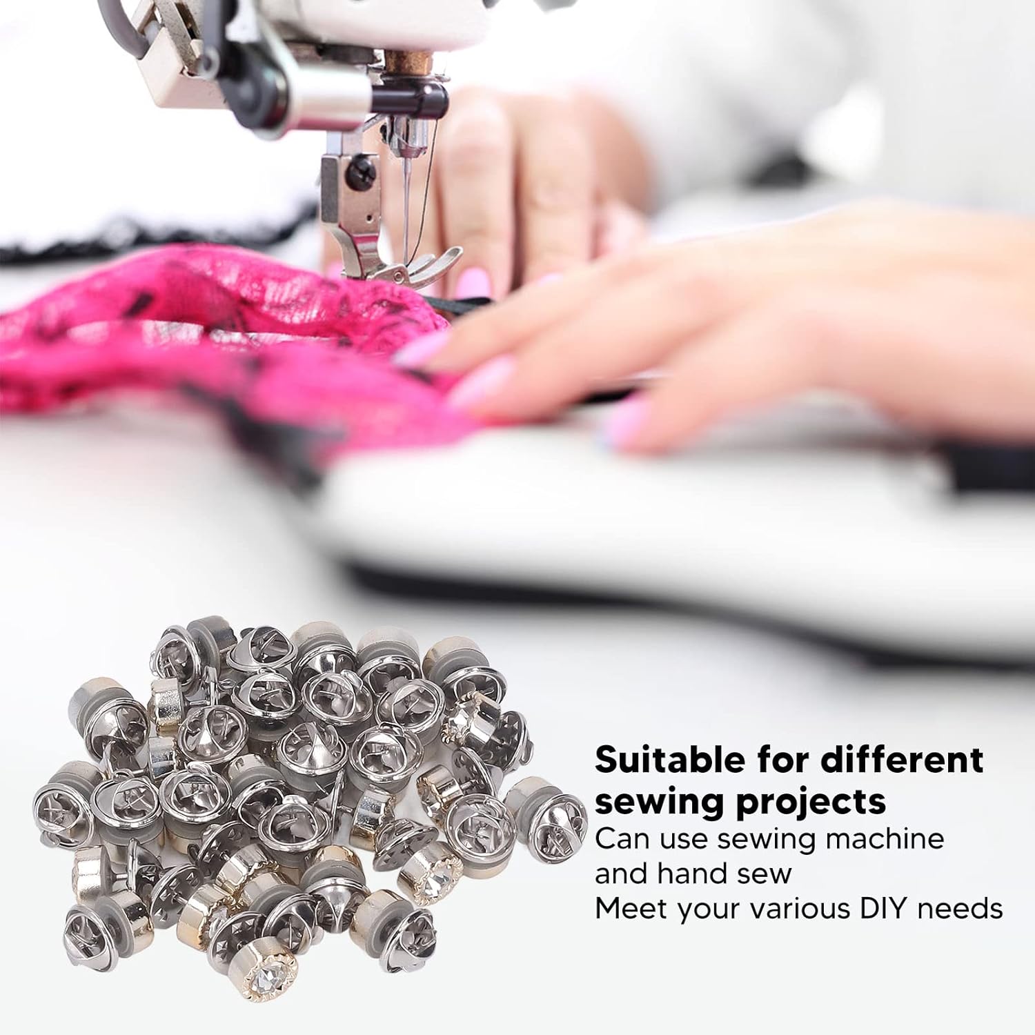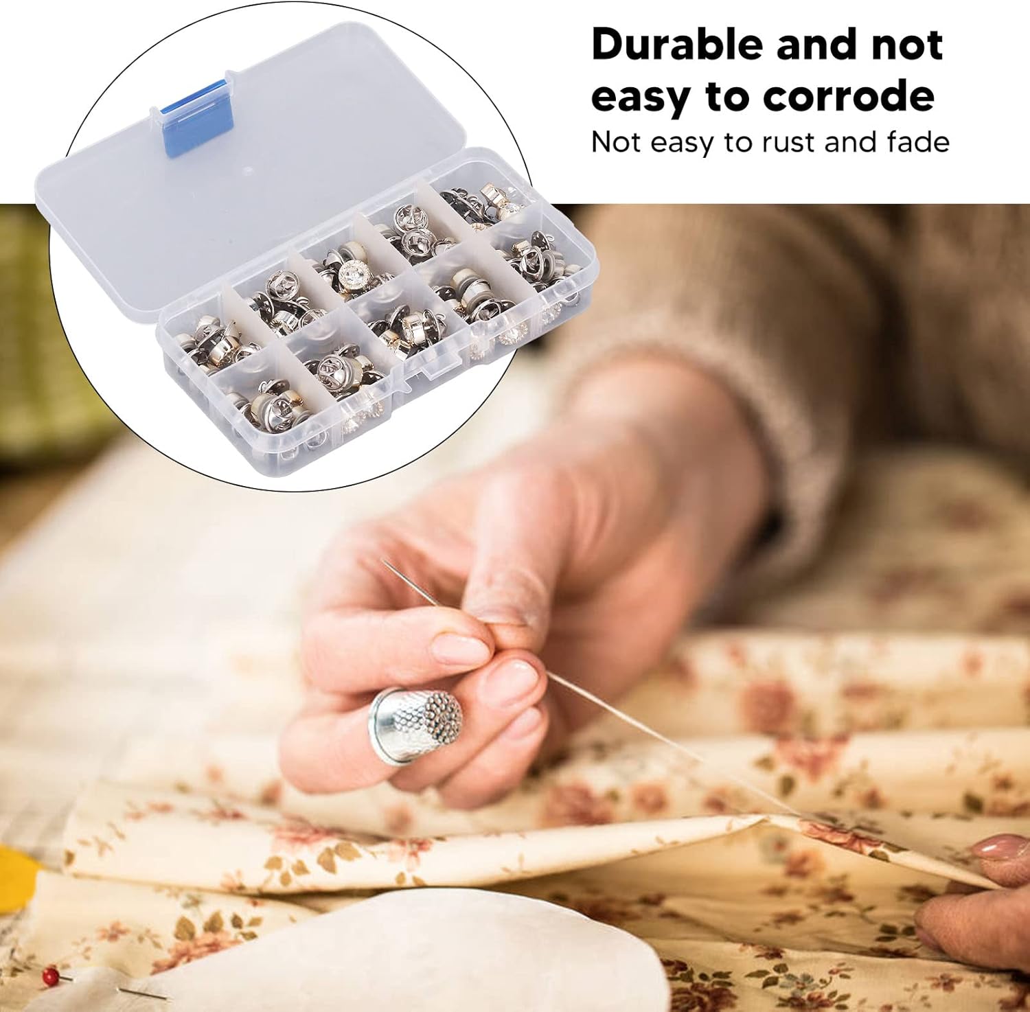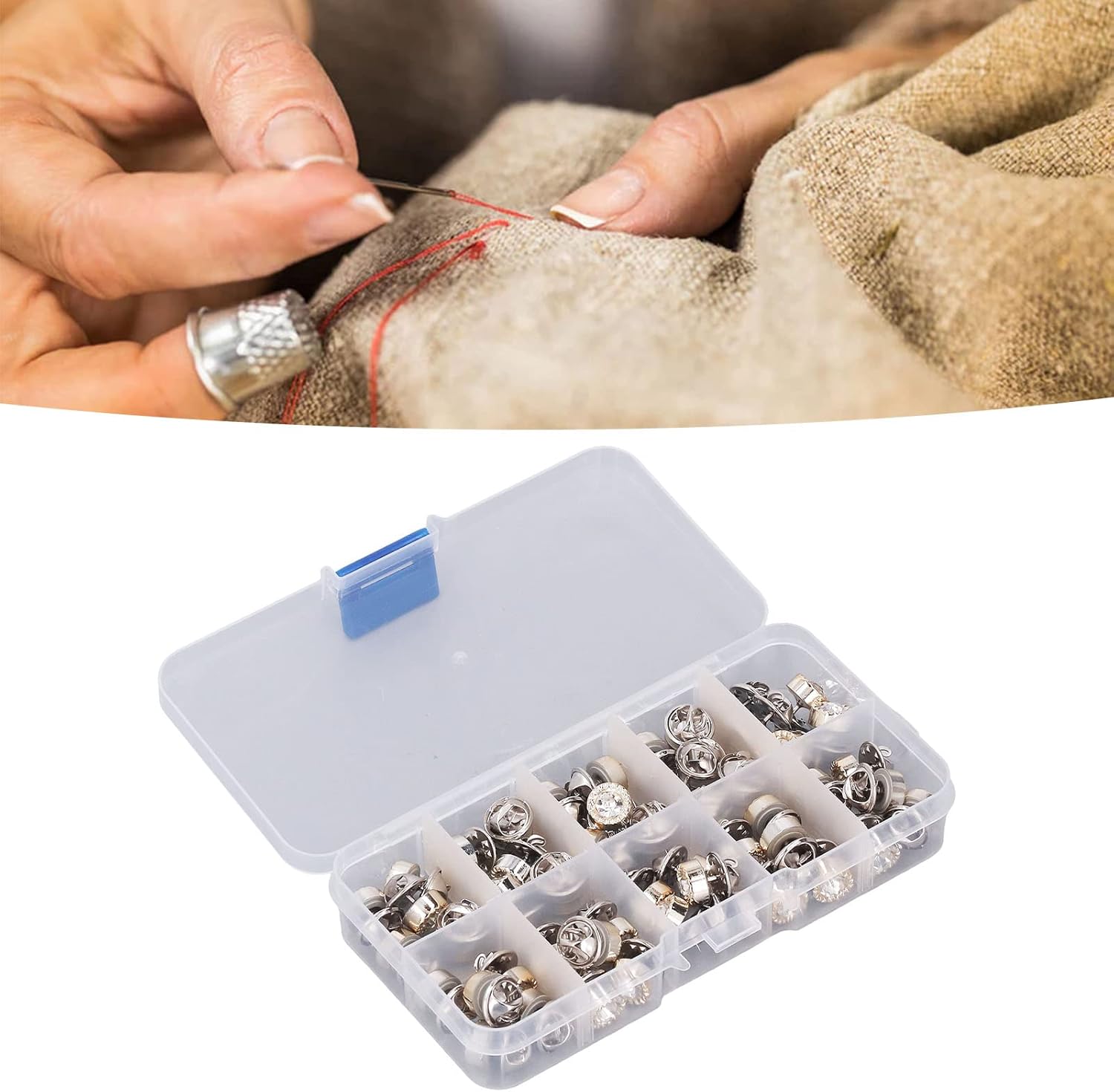 Opzione di progettazione a doppia forma: offre due forme distinte in un pacchetto per applicazioni decorative versatili; Design intelligente, comodo e pratico, bell'aspetto Materiale: combinazione di materiali di plastica e ferro resistono alla ritenzione del colore; Mantiene l'integrità strutturale attraverso ripetuti cicli di uso e lavaggio; Fornisce prestazioni affidabili in varie applicazioni di cucito e condizioni ambientali Metodo dell'applicazione: non richiede strumenti specializzati o apparecchiature di punzonatura per l'installazione; Compatibile con tecniche di cucitura a mano e cucitura a macchina; Necessità di martelli o strumenti complessi, rendendolo accessibile Utilità di riparazione completa: metodo per riparare camicie, pantaloni, abiti, gonne e maglioni; Funziona perfettamente con più tipi di tessuto tra cui materiali e indumenti più pesanti Applicazione versatile: supporta vari progetti tra cui elaborazione in pelle, accessorio e design tessile; Sia per riparazioni funzionali che per abbellimenti artistici; Tre scatole di archiviazione compartimentate incluse per la gestione dei componenti