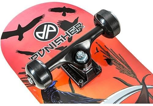 Tavola da skateboard completa di alta qualità, doppia kickboard, realizzata in 80 x 19,7 cm, 7 strati in acero canadese leggermente concavo, con profilo della tavola per skateboard per il miglior controllo durante la guida, le curve e le acrobazie. Cuscinetti per ruote ad alta velocità Punisher ABEC-7. Cuscinetti rialzati in PE e cuscini in poliuretano con stampa del logo della tavola da skateboard Punisher. Truck e basi in alluminio Punisher da 5" per carichi pesanti e ruote in PU da 54 x 36 mm con grafica della tavola da skateboard Punisher grafica accattivante a colori su un lato e nastro adesivo per carichi pesanti 80 AB sull'altro. Nessun assemblaggio richiesto