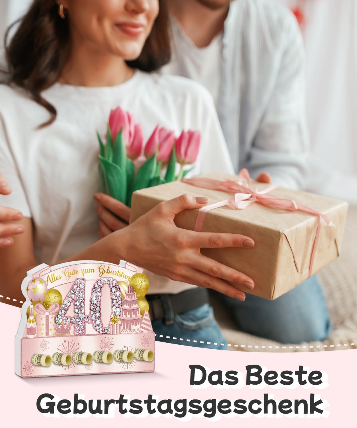 Con funzione scomparto per denaro: aperture rotonde per banconote o auguri personali Design rosa e oro: strass scintillanti ed elementi festivi per un'atmosfera elegante Uso versatile: adatto come decorazione da tavolo, presentazione di torte o idea regalo creativa Stabile e leggero: facile da montare, riutilizzabile e salvaspazio Per donne e ragazze, adatto per compleanni, anniversari e feste di famiglia