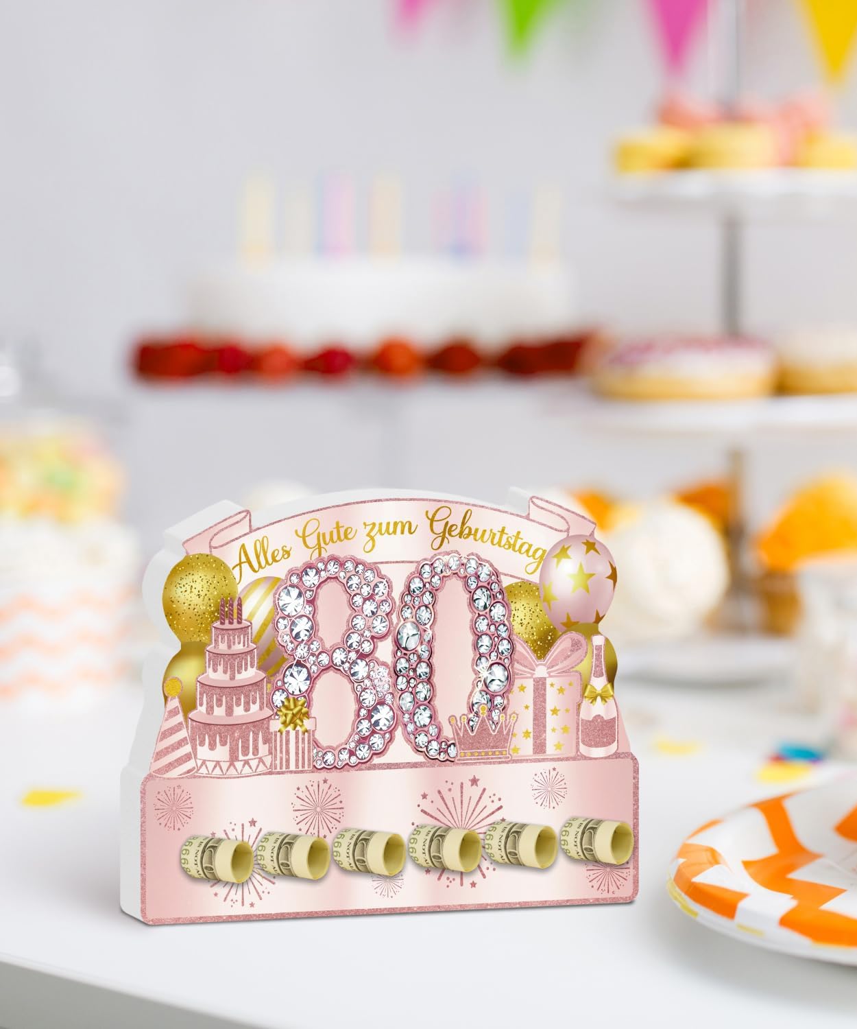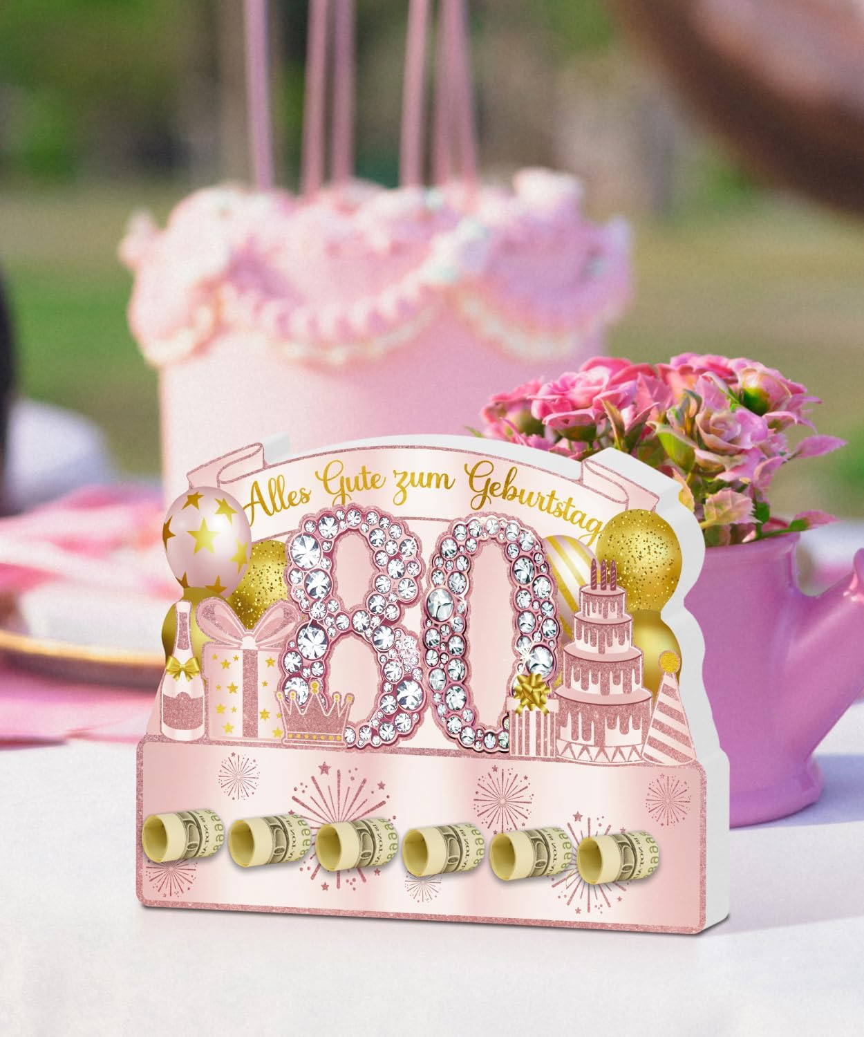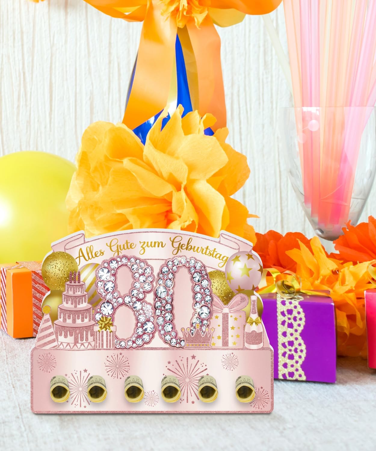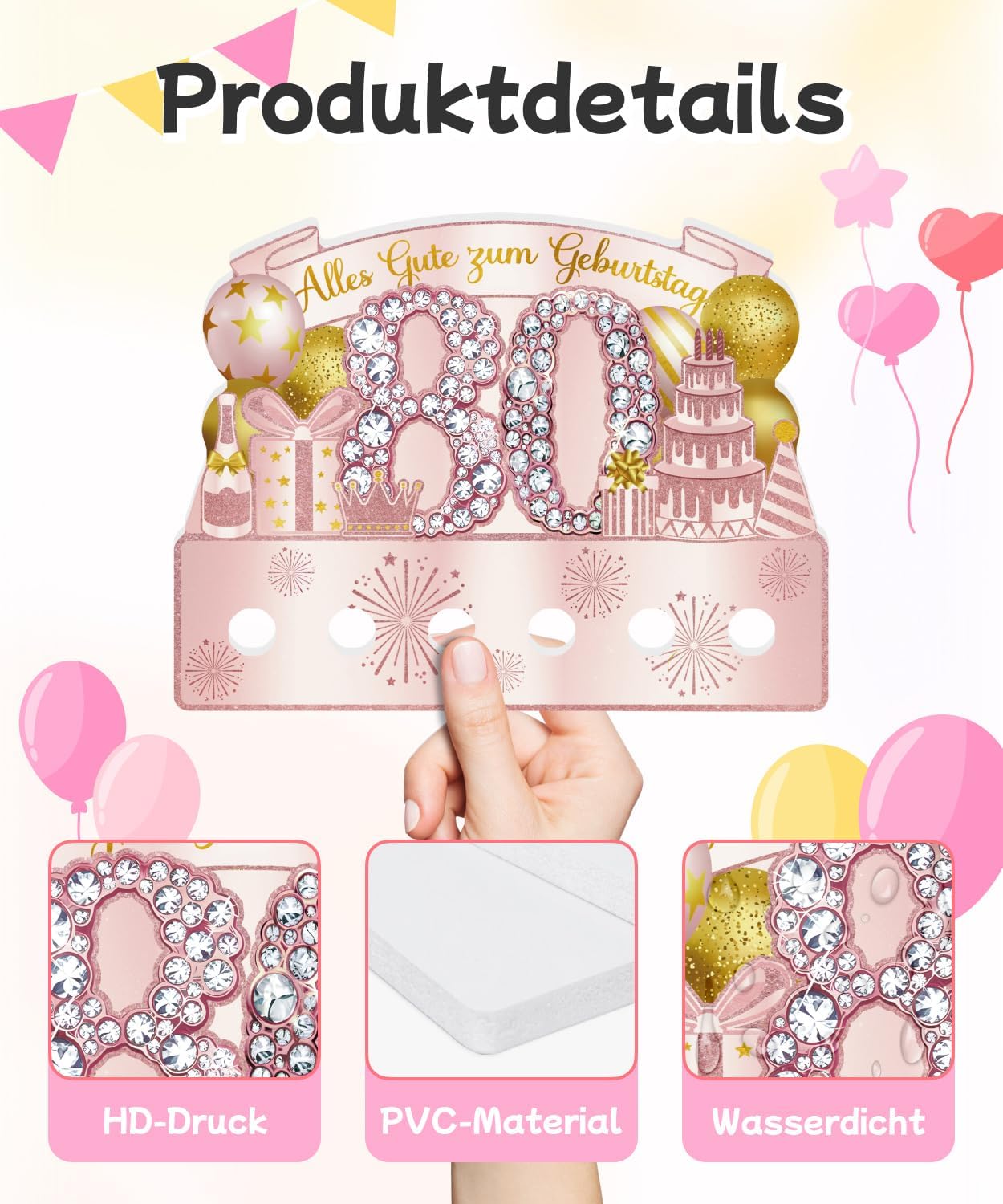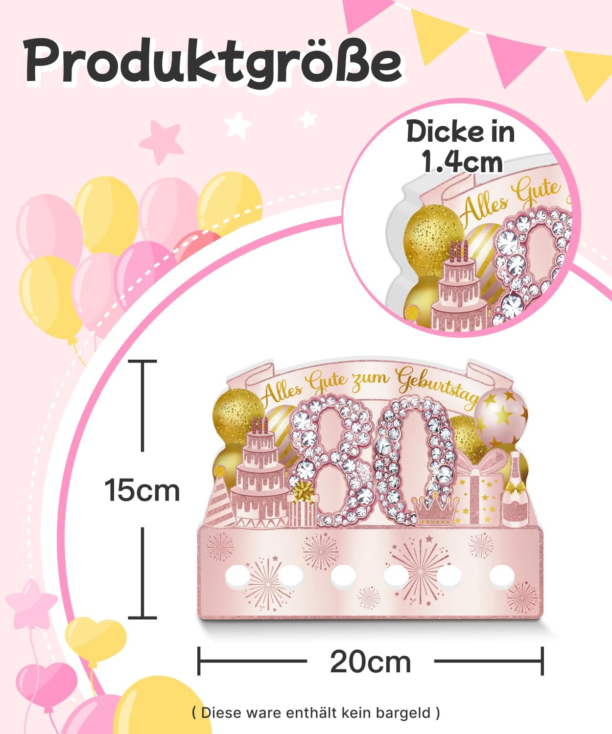 Effetto festivo anni '80: il grande "80" con strass scintillanti, corona rosa, palloncini, regalo e torta - elegante e cordiale Saluti inseribili: le aperture rotonde inferiori consentono di inserire mini carte o note personali Materiale di alta qualità: realizzato in robusto PVC, durevole, indeformabile e riutilizzabile per diverse occasioni Pronto all'uso senza sforzo: non necessita di montaggio – immediatamente montabile e decorativo Meraviglioso per feste femminili: ideale per compleanni rotondi di nonne, madri, zie o amiche anziane