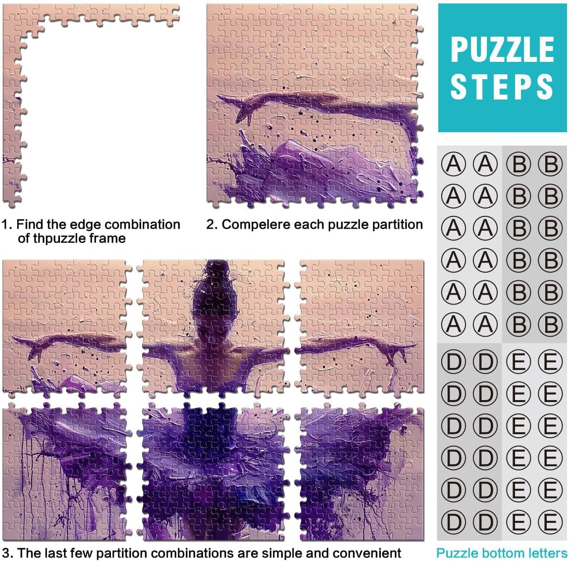 Puzzle 1000 pezzi per adolescenti Ballerina viola Il puzzle è confezionato in un sacchetto con coulisse e viene fornito con una bella scatola regalo e un poster regalo a grandezza naturale. Dimensioni finali 50x70cm 【Materiale di alta qualità】Realizzato in legno riciclabile di alta qualità, atossico, inodore e privo di polvere. La tecnologia di taglio di precisione garantisce che ogni pezzo del puzzle si adatti perfettamente, offrendoti la migliore esperienza. 【Design unico】: Utilizziamo una tecnologia di taglio di precisione per garantire che ogni pezzo del puzzle si adatti perfettamente senza polvere. Ogni pezzo del puzzle è stampato con inchiostro antiriflesso e atossico. La guida per le lettere sul retro del puzzle fornisce un ulteriore aiuto e rende il puzzle più facile da risolvere. 【Rilassamento e sollievo dallo stress】: I puzzle artistici sono un modo prezioso per godersi del tempo di qualità a casa. Assemblare un puzzle da 1000 pezzi può migliorare l'umore, potenziare le capacità cognitive e migliorare la memoria a breve termine. 【Supporto】 Se riscontri che al tuo puzzle manca un pezzo, non esitare a contattarci e lo sostituiremo con un puzzle con la stessa immagine senza domande o condizioni.