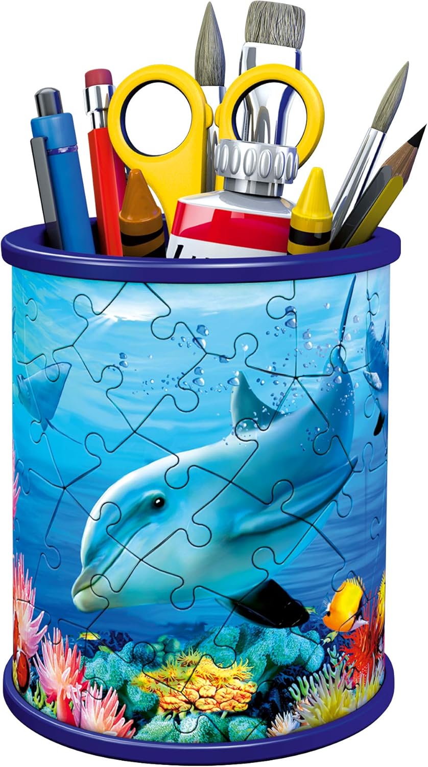 Puzzle nella terza dimensione! L'idea regalo perfetta per gli appassionati di delfini dai 6 anni in su. Parti in plastica di alta qualità con tecnologia Easyclick per un adattamento preciso - stabile, senza colla. Da 54 pezzi di puzzle in plastica di alta qualità e 3 accessori viene creato pezzo per pezzo un pratico portapenne con il motivo del mondo sottomarino: una vera attrazione e la decorazione perfetta su ogni scrivania. Attività ideale dal successo garantito, grazie alle istruzioni illustrate e colorate e ai pezzi del puzzle numerati. Promuove il pensiero spaziale e le capacità motorie fini Sia per ragazzi o ragazze, bambini o adulti - Puzzle 3D divertente e pratico aiuto per riporre adulti e bambini dai 6 anni in su Livello di difficoltà 2/5; Altezza del portapenne finito ca. 9,5 cm, diametro ca. 7,7 cm