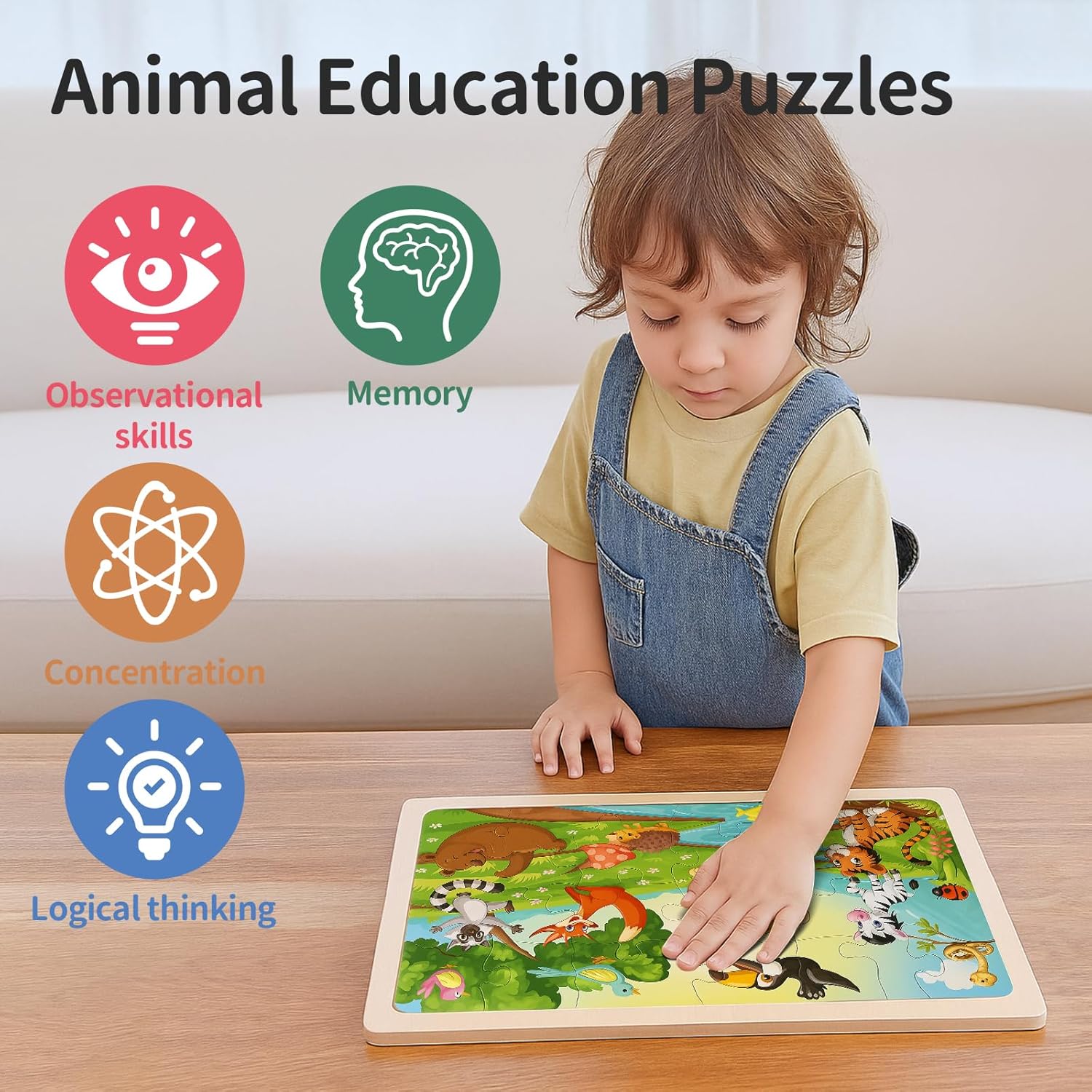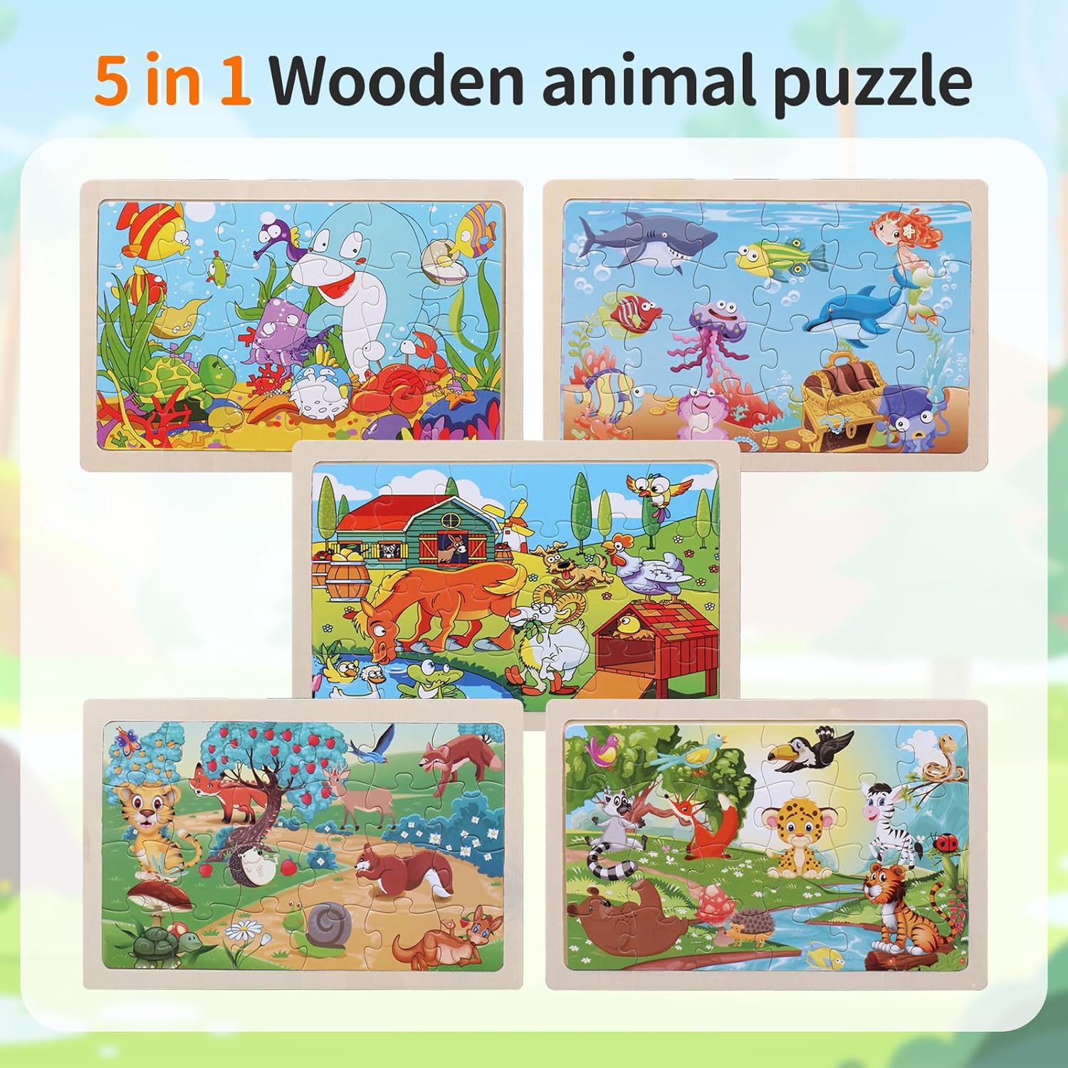 Puzzle in Legno per Bambini: Questo puzzle bambini 3 anni contiene 5 puzzle, ognuno dei quali contiene 24 pezzi di puzzle in legno resistenti e colorati, che misurano 22,5 x 15 cm. Il set di puzzle include 5 affascinanti temi: Animali del fiume, Animali del frutteto, Animali della fattoria, Mondo sottomarino e Animali sottomarini Sicuro e Resistente: Questo puzzle bambini è realizzato con tecnologia di taglio di precisione e legno di alta qualità. Ogni pezzo del puzzle è accuratamente lucidato per garantire la sicurezza delle mani dei bambini durante il processo di creazione del puzzle. Questa squisita fattura garantisce la qualità e la durata del puzzle, permettendo ai bambini di divertirsi con il puzzle in un ambiente sicuro Colori Vivaci: Questo giocattolo puzzle bing utilizza colori vivaci per rappresentare vividamente splendidi scenari naturali, attirando l'attenzione dei bambini Difficoltà Moderata, Più Interessante: Il design di 24 puzzle animali pezzi rende questo puzzle versatile. È uno strumento eccellente per i bambini per esercitare la coordinazione occhio-mano, coltivare la pazienza e la concentrazione. La difficoltà media non frustrerà i bambini, ma darà loro un grande senso di realizzazione dopo aver risolto il puzzle Regalo Perfetto: Questo puzzle legno bambini è adatto a bambini e bambine di 3, 4 e 5 anni ed è un regalo fantastico per i compleanni dei bambini, Natale, scuola materna, Capodanno, Ringraziamento, inizio della scuola materna, Pasqua e altre festività