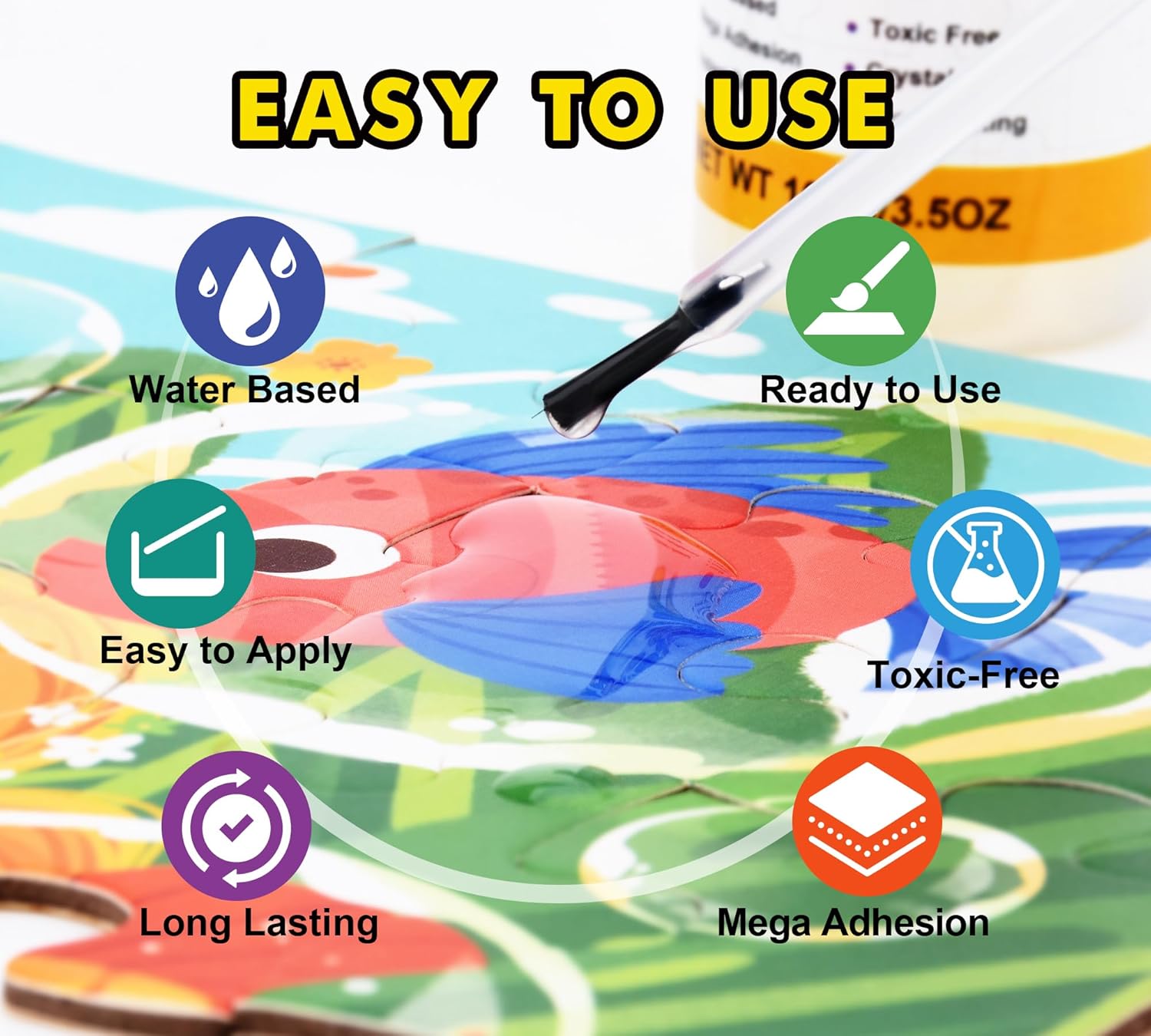 Protezione duratura e miglioramento visivo La nostra colla puzzle utilizza una formula trasparente per formare uno strato protettivo solido sulla superficie del puzzle, prevenendo efficacemente lo sbiadimento, i graffi e l'allentamento dei detriti e migliorando la saturazione del colore e la chiarezza dei dettagli. La formula di aggiornamento a base d'acqua assicura che non diventi gialla o scurita dopo l'essiccazione e mantenga la freschezza dei lavori per lungo tempo. È adatto per progetti artistici multimateriali come legno, pittura con diamanti, ecc. Sicuro ed ecologico: l'adesivo puzzle con una formula a base d'acqua è atossico e inodore. Il puzzle ha superato il test delicato sulla pelle e può essere utilizzato in modo sicuro con bambini (oltre 3 anni) e adulti. La formula ecologica soddisfa le esigenze dell'interazione genitore-figlio e dell'artigianato scolastico, tenendo conto della sicurezza e del divertimento creativo. Facile da usare e con polimerizzazione efficiente: colla puzzle con una spazzola speciale, applicata uniformemente in una direzione per ottenere una finitura senza bolle, 30 minuti di tempo di asciugatura e 2 ore di asciugatura rapida per legami duraturi. La colla puzzle da 200 ml di grande capacità supporta più progetti, non sono necessarie competenze professionali e i principianti possono ottenere un effetto di risparmio economico a livello professionale. Compatibilità creativa multisena: oltre al fissaggio del puzzle, la nostra colla puzzle è adatta anche per scene fai da te come pittura con diamanti, arte della carta, pittura a cornice fatta a mano, decorazione da taglio di carta, ecc. Una forte adesione può ricevere permanentemente le opere montate, i display di supporto o il montaggio del telaio e diventare un complemento indispensabile per gli appassionati di toolbox. Garanzia di qualità: forniamo assistenza post-vendita come ristampa di accessori mancanti e trattamento delle perdite e promettiamo rimborsi/scambi incondizionati se non sono soddisfatti. Se avete domande sulla nostra colla puzzle, potete contattarci in qualsiasi momento!