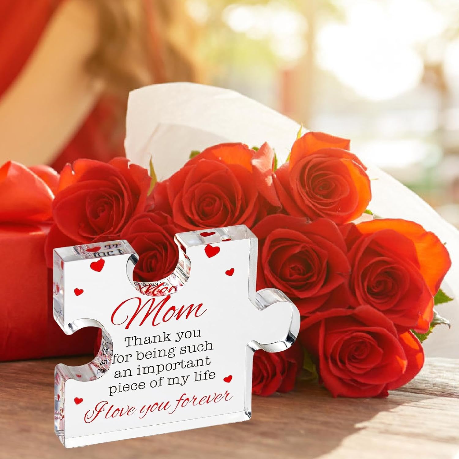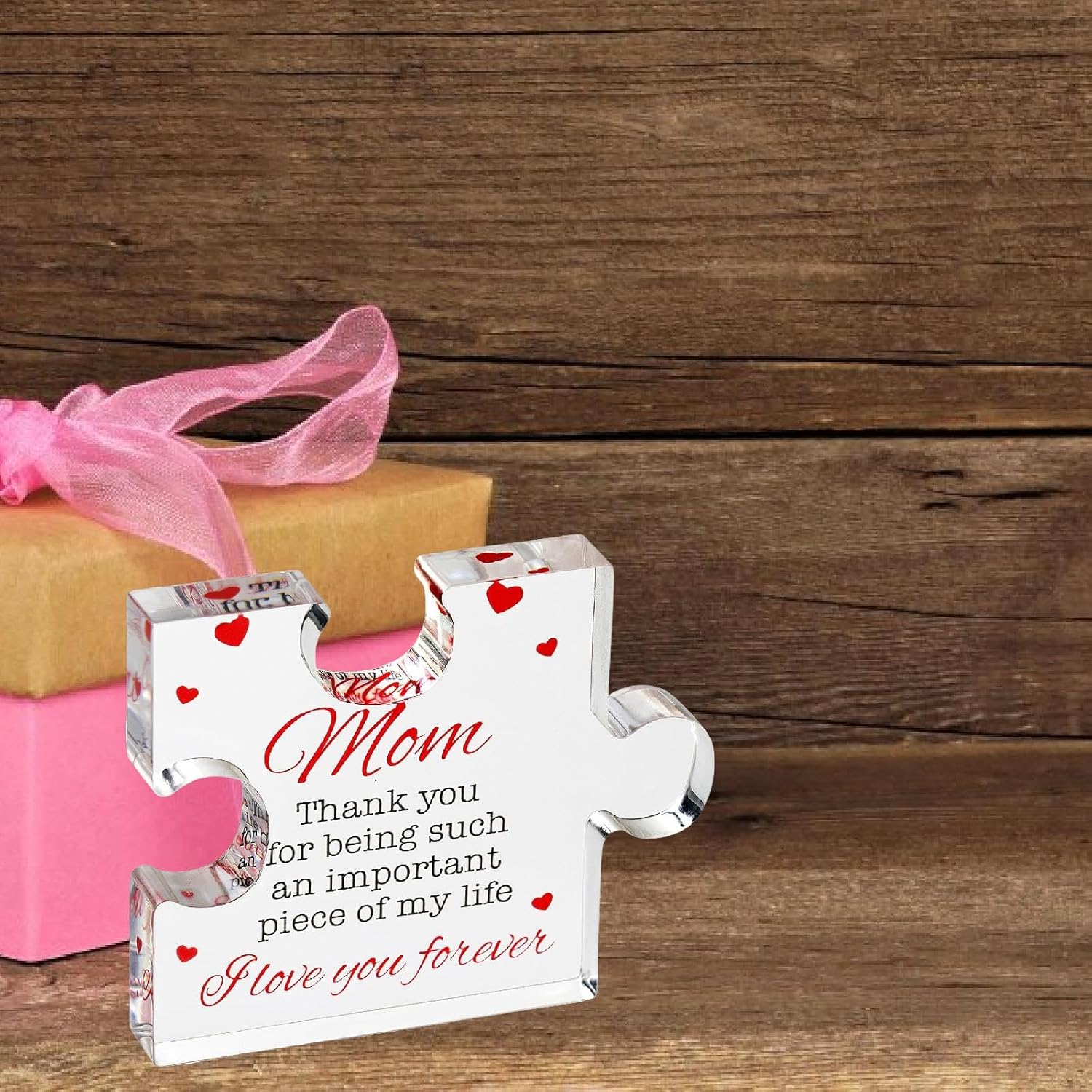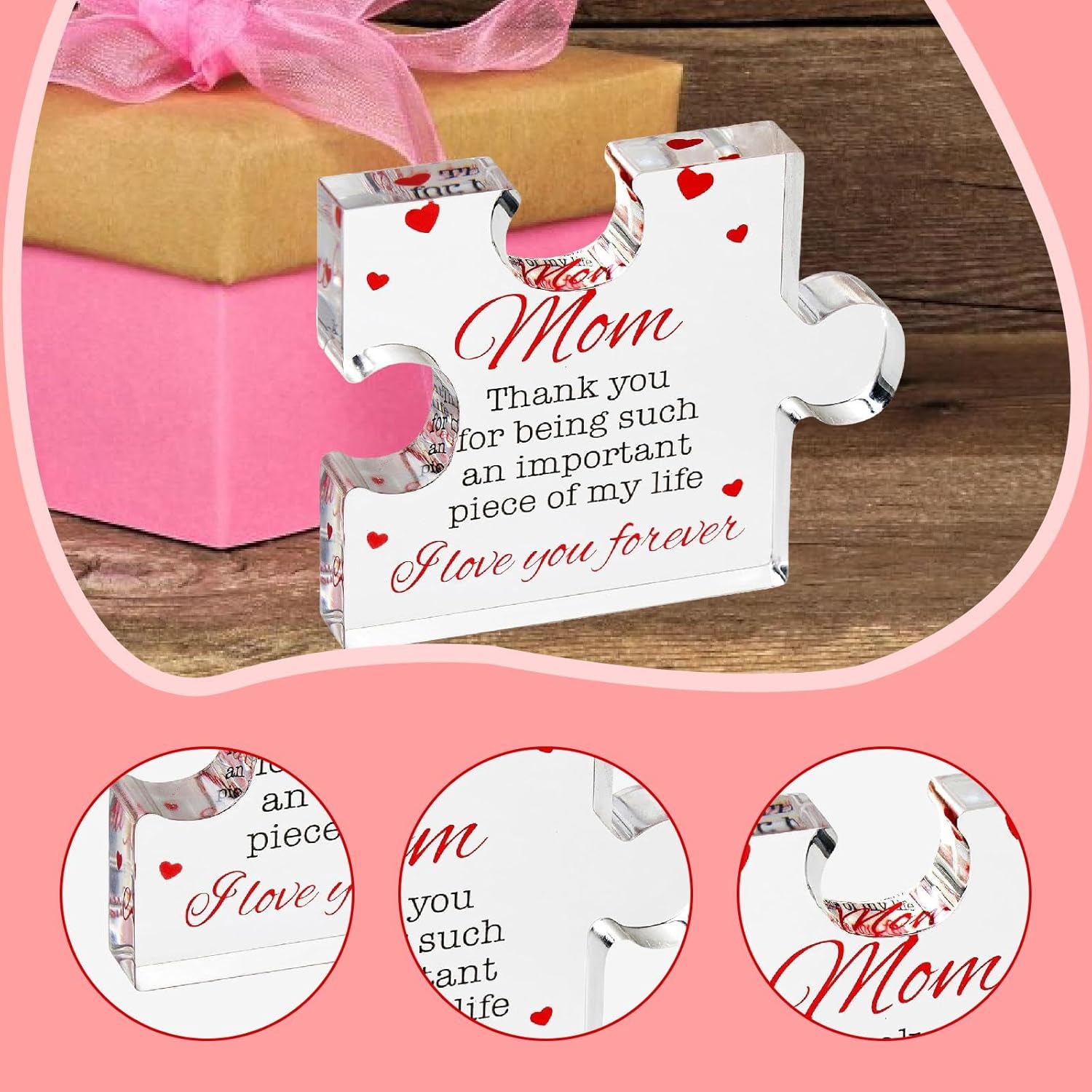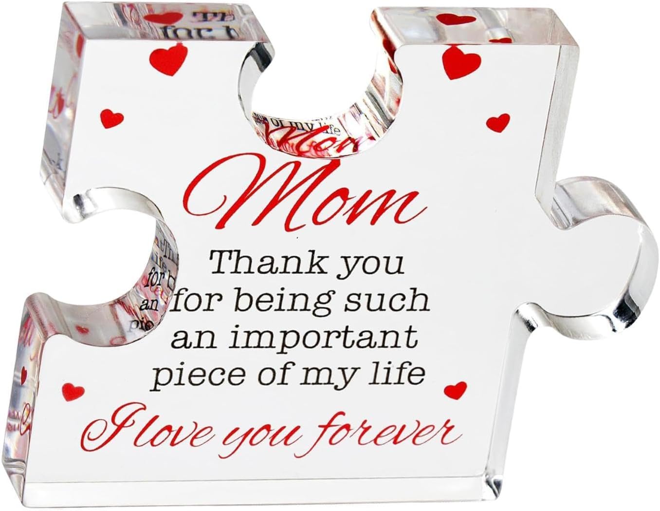 【Regalo】: Blocco puzzle acrilico inciso, regalo sentito per da parte di figlia, figlio o papà 【Design puzzle 】: realizzato in una forma di puzzle creativa, per commemorare occasioni speciali 【Materiale acrilico】: realizzato in acrilico trasparente che offre un aspetto sofisticato, robusto per un uso a lungo termine 【Decorazione per la casa affascinante】: il pezzo del puzzle in acrilico inciso è l'arredamento ideale per la casa e l'ufficio per la festa del, il compleanno, il Ringraziamento 【Messaggio sentito】: Contiene le toccanti parole "Mamma, grazie per essere una parte così importante della vita. Ti amerò ", rendendolo un modo significativo per esprimere gratitudine a tua madre