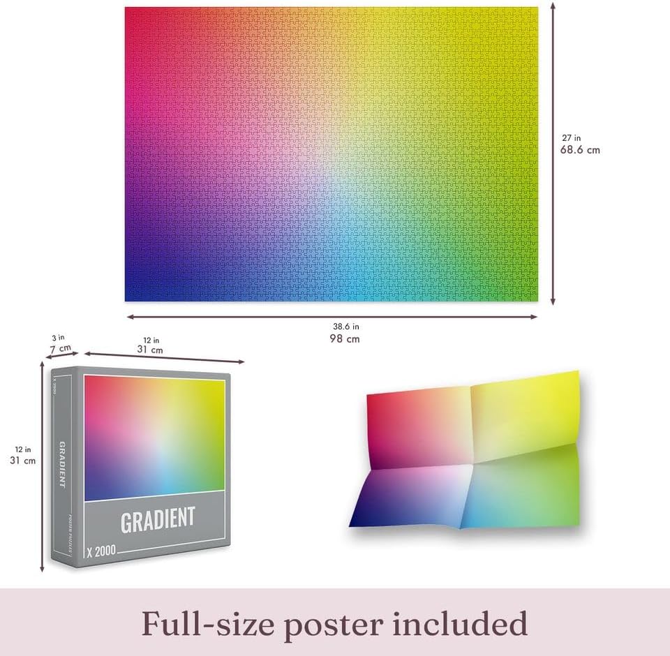 PIÙ GRANDE È MEGLIO: abbiamo aumentato notevolmente le dimensioni del nostro puzzle a gradiente incredibilmente popolare per prolungare la gioia ancora più a lungo. Questo divertente puzzle da 2000 pezzi per adulti è largo quasi un metro. DESIGN MODERNO ED ELEGANTE: il nostro puzzle arcobaleno da 2000 pezzi presenta lo stesso incredibile spettro di colori del nostro classico puzzle sfumato, con 2000 pezzi di altissima qualità che si incastrano perfettamente. ORE DI DIVERTIMENTO: come tutti i nostri puzzle da 2000 pezzi, questo puzzle multicolore ti regalerà ore di felicità. Produciamo i nostri puzzle in Europa, in modo sostenibile, per garantire un'esperienza puzzle perfetta. QUALITÀ PERFETTA: il nostro puzzle sfumato più grande e migliore è composto da 2000 pezzi tagliati sapientemente, rifiniti con un rivestimento opaco in lino per ridurre i riflessi fastidiosi. Pensiamo che adorerai l'esperienza, così come il puzzle completato. POSTER GRATUITO: per aiutarti a completare il puzzle, includiamo un poster gratuito a grandezza naturale che mostra la dimensione esatta del puzzle completato. Utilizziamo solo carta certificata FSC.