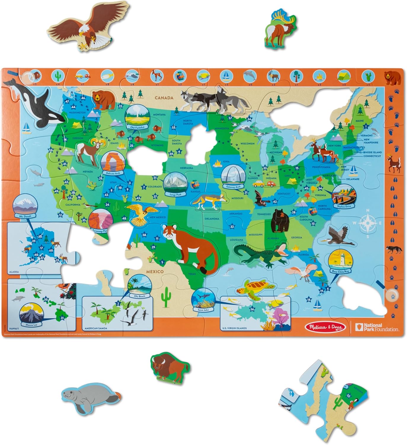 Assembla 45 robusti pezzi di puzzle jumbo in cartone per completare una mappa colorata degli Stati Uniti, con le posizioni di 63 parchi nazionali e molti degli animali e importanti caratteristiche del parco Educativo e divertente: include alcuni pezzi a forma di animali e una guida ai puzzle con ID di parchi e animali e cerca e trova risposte in inglese e spagnolo; Ottimo per sviluppare capacità motorie e capacità di risoluzione dei problemi; promuove la concentrazione e il gioco indipendente. Il puzzle finito misura 91,4 x 61 cm (36" x 24"). I pezzi sono conservati in una robusta scatola con maniglia incorporata. La collezione National Park Foundation è progettata per ispirare i bambini a scoprire la meraviglia dei parchi nazionali americani; Melissa & Doug è orgogliosa di sostenere la National Park Foundation con una donazione minima di milioni di dollari in 3 anni per proteggere i nostri parchi per le generazioni presenti e future. Un grande regalo per ragazzi e ragazze dai 3 ai 5 anni per un gioco pratico e senza schermo; Prodotto realizzato con materiali certificati FSC che supportano la silvicoltura responsabile; si applica solo al nuovo inventario (FSC C156584)