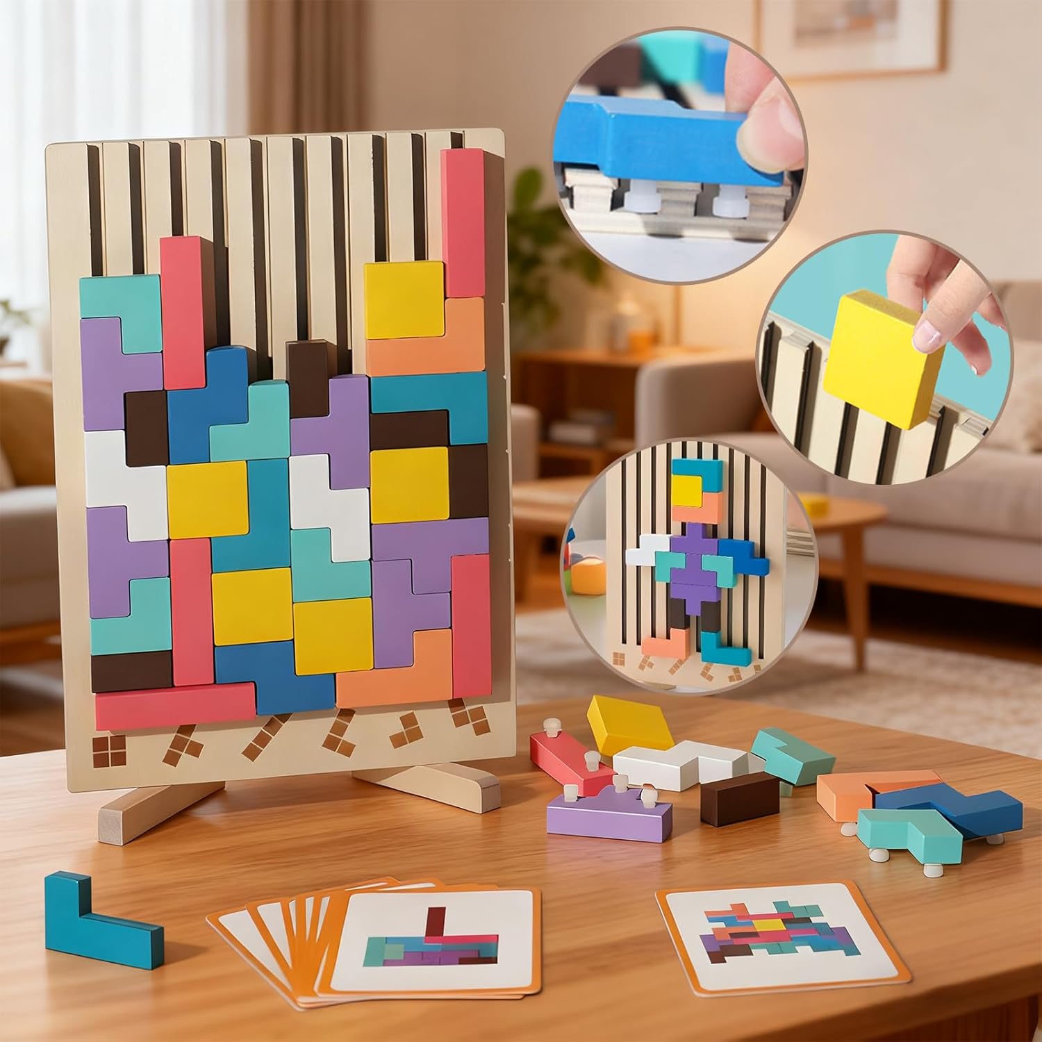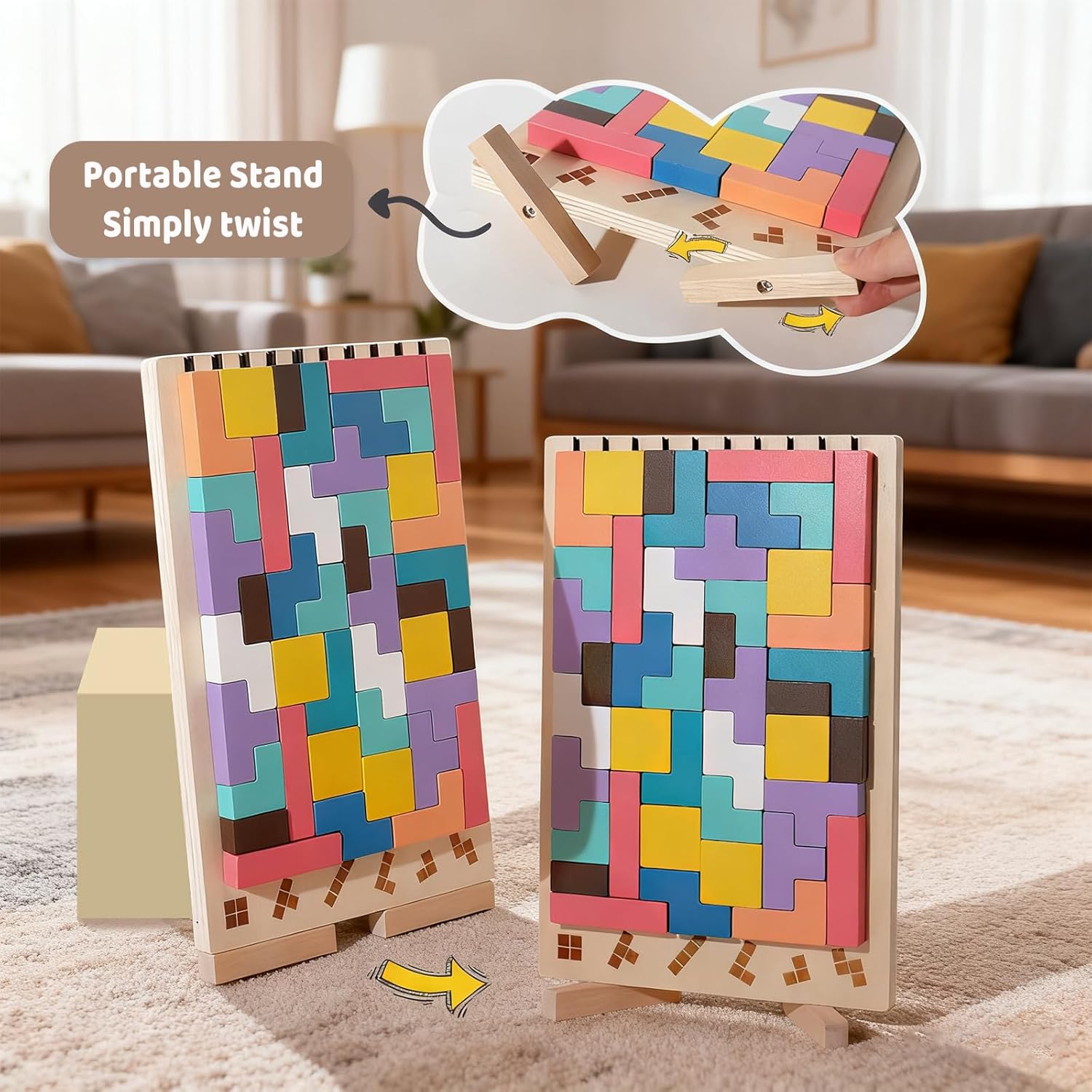 【Giocattolo Educativo Tetris】Il set di gioco Tetris contiene 40 blocchi di legno colorati e il gioco viene fornito con 10 carte sfida double-face. Non solo è possibile giocare ai giochi con i blocchi russi, ma anche impilare i blocchi e costruire scene come robot, alberi, piramidi, ecc. per allenare le capacità di ragionamento del bambino. 【Materiali di alta Qualità】Questo gioco di puzzle impilabile in legno è realizzato in legno sicuro con una superficie liscia, è sicuro e affidabile. La struttura robusta e resistente e la colorazione atossica e innocua garantiscono un gioco sicuro e lo rendono perfetto per giocare a lungo. 【Supporto Portatile】Questo gioco di impilamento Tetris in legno Montessori ha un supporto sul retro. È possibile aprire facilmente il supporto e posizionarlo su una superficie piana come un tavolo o il pavimento per giocare facilmente. 【Pensiero Spaziale e Cromatico】I colori vivaci consentono ai bambini di giocare a lungo con i giocattoli per neonati senza stancarsi. Con la combinazione di diversi colori e forme geometriche, il puzzle in legno è un giocattolo di alta qualità per allenare la coordinazione occhio-mano, la concentrazione e il pensiero logico dei bambini. 【Regalo Ideale】Questo puzzle in legno Tetris Montessori è adatto a bambini dai 3 anni in su ed è perfetto come regalo di compleanno, regalo per la festa dei bambini, regalo di Pasqua o regalo di Natale per i vostri amati bambini.