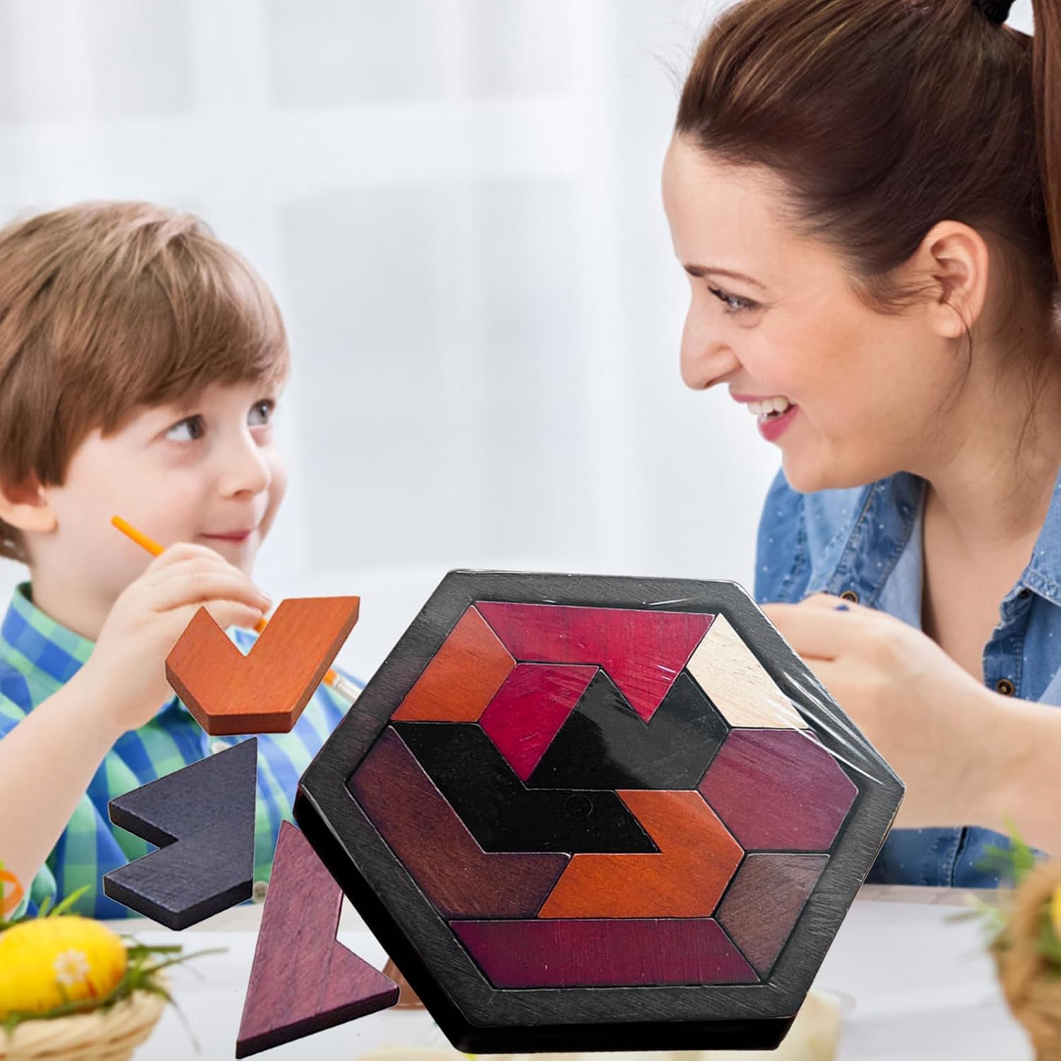 【Trascorrere il bambino genitoriale insieme】 Tangram puzzle, aiutare genitori e bambini a giocare insieme, aiuta a trascorrere il t-empo genitore-figlio e a migliorare la relazione genitore-figlio. 【Migliorare la capacità di riflessione】 I puzzle di Tangram per i bambini non solo rendono felici i bambini di giocare, ma aiutano anche a esercitare e migliorare la loro cognizione delle forme, il loro coordinamento, la loro mano-a occhio, la loro capacità pratica, la loro capacità di riflessione e la loro immaginazione spaziale. 【Materiale di alta qualità】 Il puzzle di legno è realizzato in legno di alta qualità, che è accuratamente lucidato, senza scaglie o bara affilate, e non danneggerà le mani del bambino. 【Pratico per il trasporto】 È possibile trasportare facilmente il puzzle d-ell'esagono tangram in modo che i tuoi figli possano giocare in qualsiasi momento perché è leggero e p-iccolo per viaggi a lunga distanza e viaggi in aereo. 【Regali meravigliosi】 I puzzle di tangram in legno sono meravigliosi giocattoli per bambini e bambini piccoli. È adatto per regali di compleanno, regali di Natale, regali per le vacanze o regali di Capodanno.