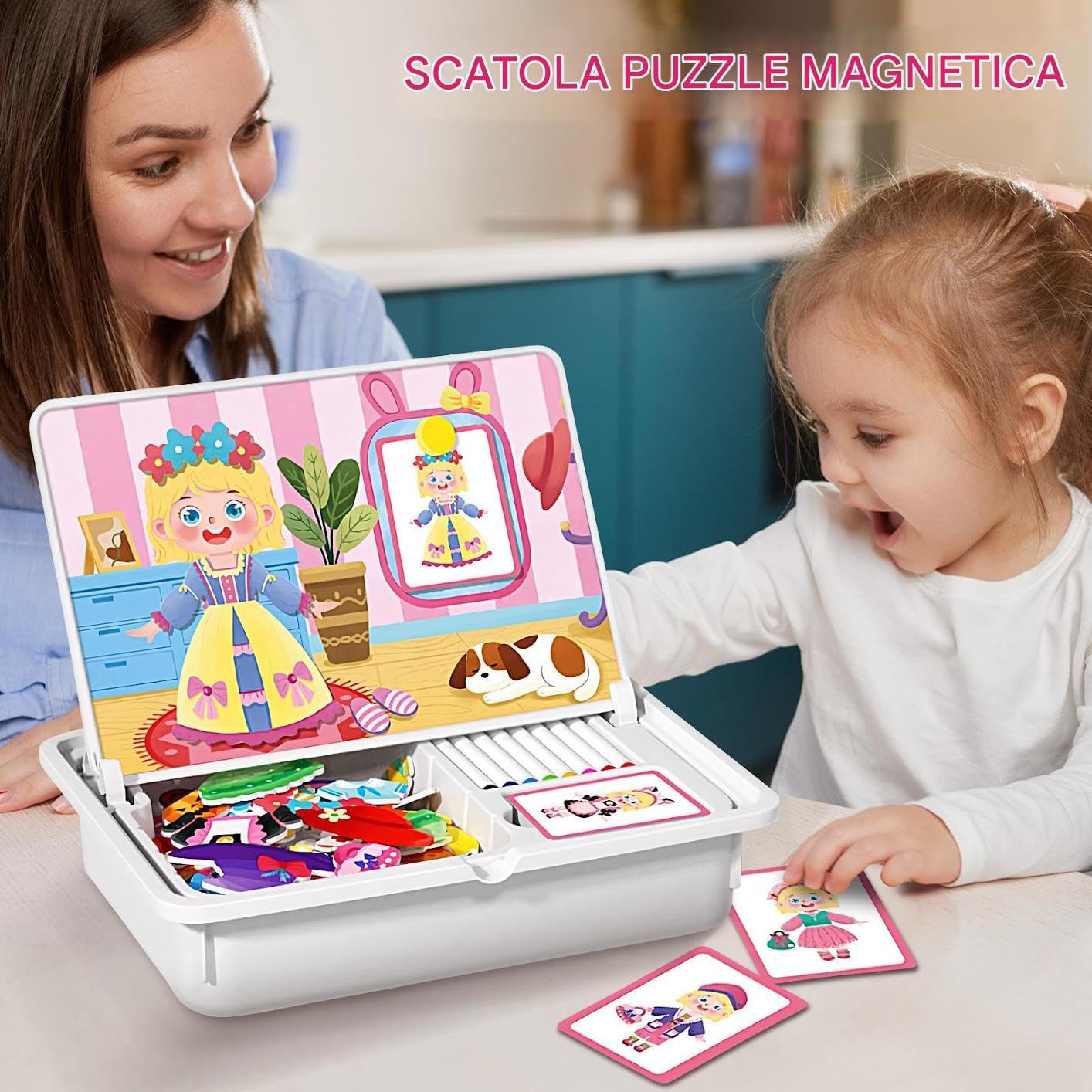 Design Forme: Incorpora le del design e forme utilizzando schemi di colore stratificati, promuove le capacità di abbinamento cromatico e l'interesse immaginativo mentre i bambini interagiscono con i pezzi del puzzle in ambienti di gioco educativo Bordi Lisci per Sicurezza: Questo puzzle magnetico in legno è realizzato con bordi privi di schegge e levigati per una cura delicata a pelle, prevenendo o fastidi durante il gioco quotidiano dei bambini o nelle attività familiari con puzzle stimolanti e coinvolgenti per tutti Divertimento all'aperto: Questo giocattolo magnetico di bambole in legno ha una scatola compatta che garantisce facilità di conservazione durante i viaggi, ideale per intrattenere i bambini nei sedili posteriori 'auto durante lunghi tragitti, mantenendo l'ordine e coinvolgendo in attività creative Strumento Apprendimento Interattivo: Facilita sfide di vestizione con set di carte tematiche, offrendo un modo divertente per stimolare la creatività e affinare la coordinazione occhio-mano, aiutando lo sviluppo a percezione spaziale e ispirando ore di gioco immaginativo. Rafforzamento Legami: Combinando modalità individuali e collaborative, questi puzzle ispirano processi di pensiero creativo mentre costruiscono legami emotivi durante attività familiari o di gruppo, rendendoli ideali per esperienze condivise e momenti di qualità