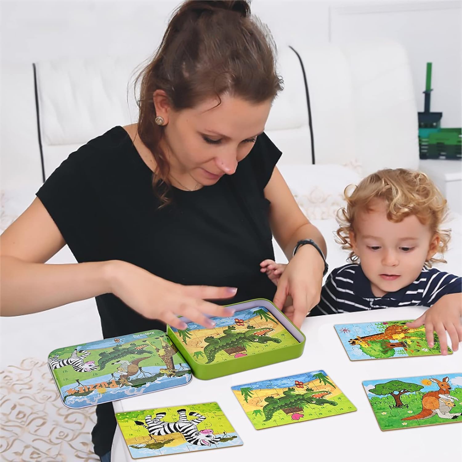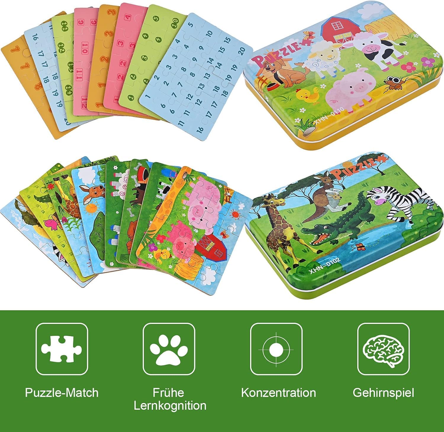 Stile innovativo: il piccolo puzzle per bambini dai 2 anni in su presenta squisite forme di animali: canguro, coccodrillo, zebra, giraffa, pecora, maialino, mucca e cucciolo, in modo che il bambino possa imparare a giocare e conoscere gli animali del gioco. Squisito set di puzzle per bambini: puzzle per bambini da 1 anno in su con 8 disegni di animali, divisi in 9 pezzi, 12 pezzi, 15 pezzi e 20 pezzi di puzzle avanzati. Ogni pezzo è indipendente, dal piccolo al grande, dal piatto al profondo, passo dopo passo. Il mini puzzle viene fornito in una pratica scatola di metallo che consente di riporlo facilmente. Colori vivaci: i mini puzzle migliorano il riconoscimento dei colori del bambino. Ricco di forme e fantasie per soddisfare il piacere dei bambini. Alta qualità: i puzzle per bambini sono realizzati con pannelli di legno di alta qualità, nessuna sbavatura non ti farà male alle mani, motivi chiari, nessun riflesso che può proteggere meglio gli occhi del tuo bambino ed è una buona scelta per i giocattoli per bambini dai 2 anni in su. Giocattoli dai 2 anni: i puzzle in legno dai 2 ai 5 anni sono giocattoli da viaggio per bambini, piccoli regali e regali a sorpresa per bambini in età prescolare, piccoli regali. Può aiutare i bambini a sviluppare la coordinazione occhio-mano, l'abilità cognitiva, l'abilità operativa, l'abilità di pensiero e la capacità di apprendimento. I puzzle ad incastro in legno dai 2 anni possono essere molto adatti come piccoli regali per neonati, ragazzi e ragazze per i compleanni dei bambini, Natale, Festa dei bambini e altre festività.