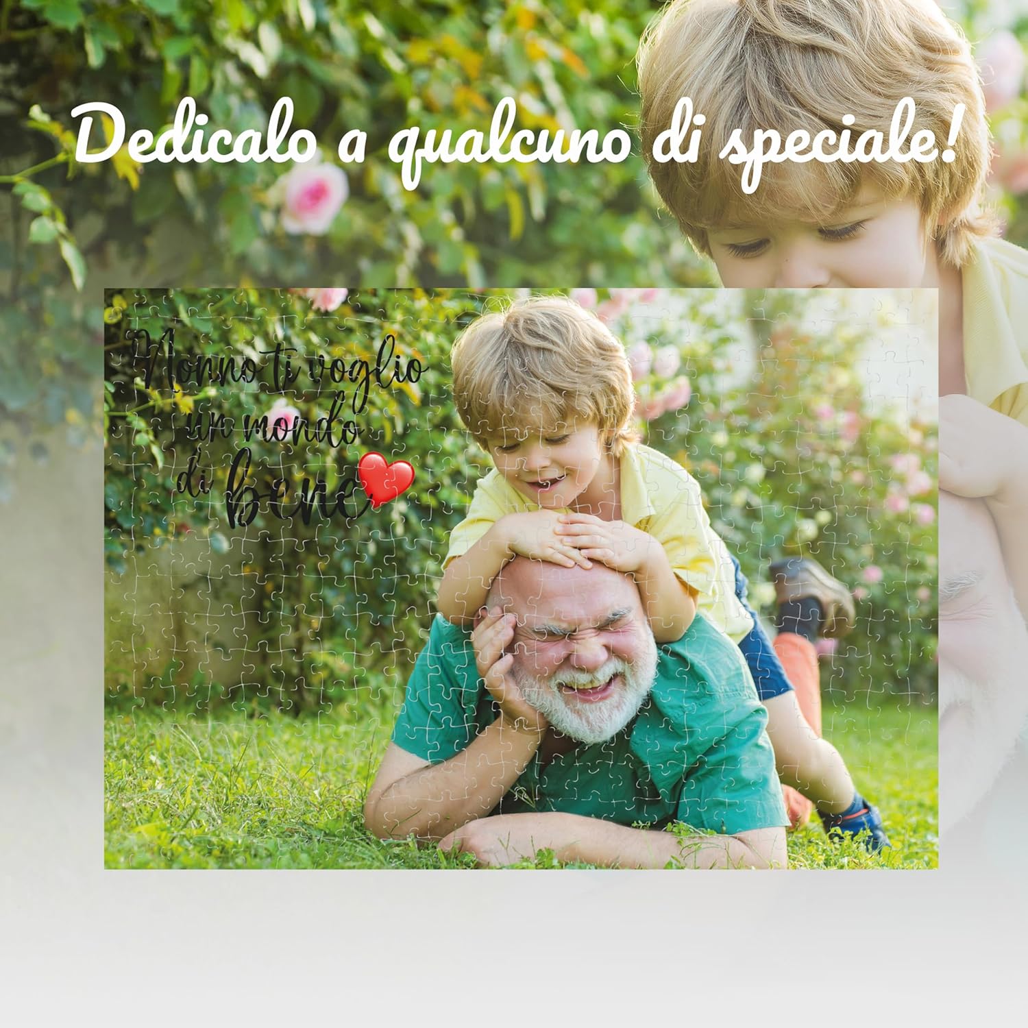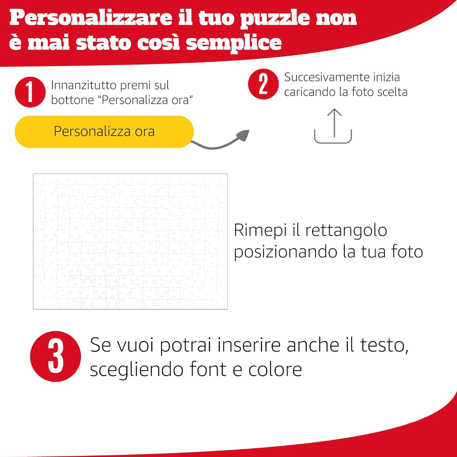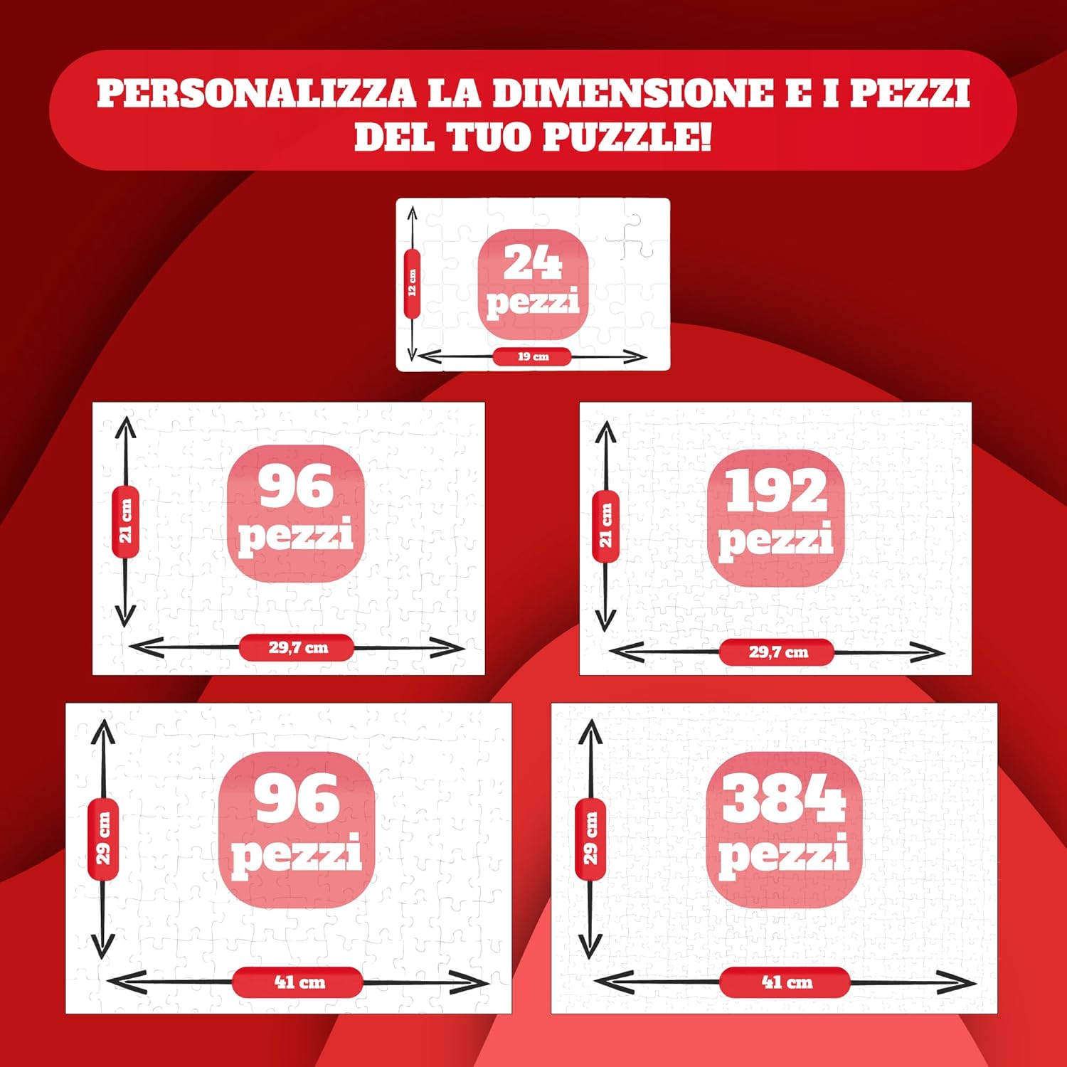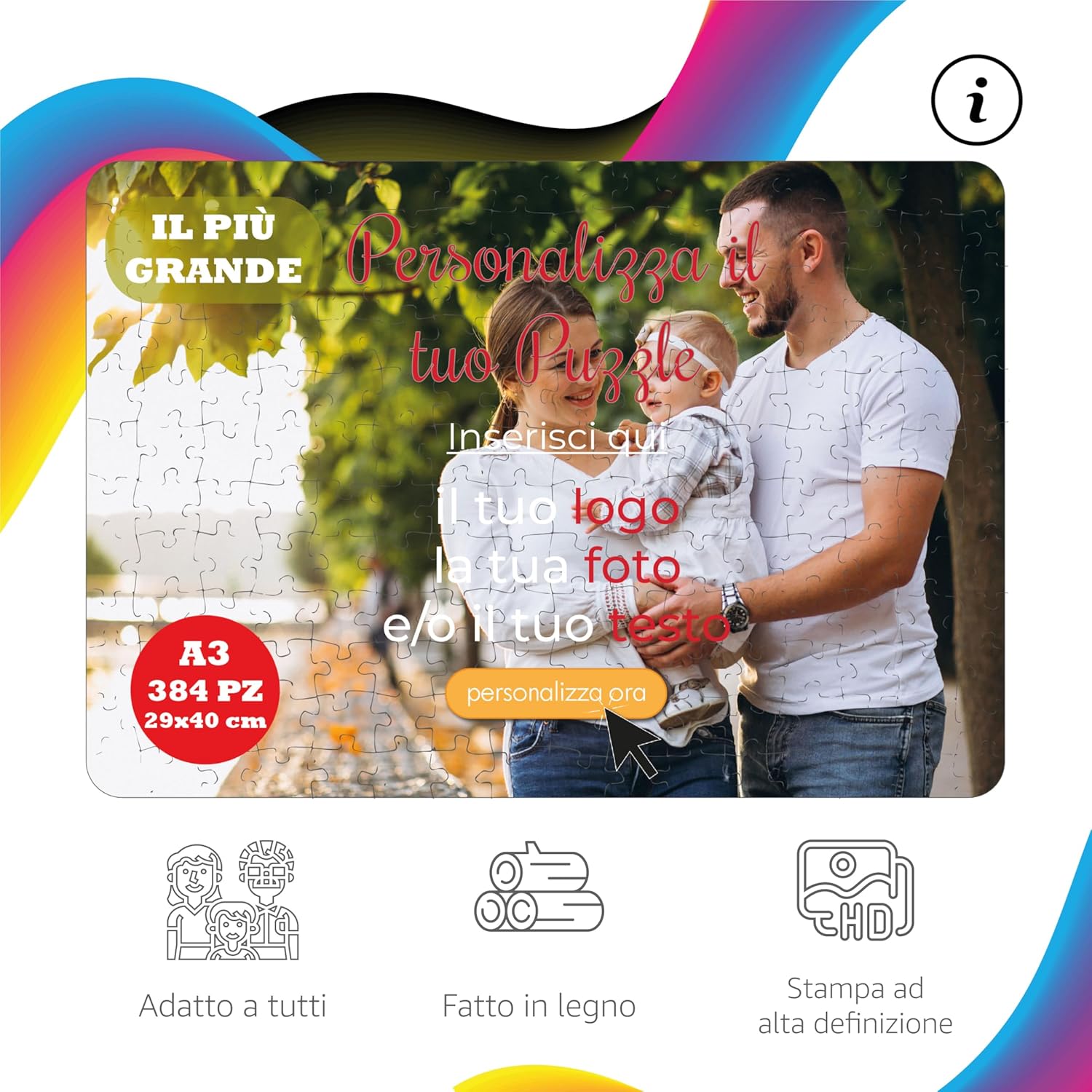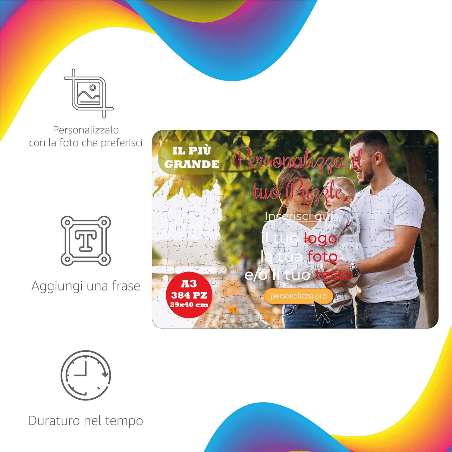 STAMPA DI ALTA QUALITA’: Dai vita ai tuoi ambienti con colori brillanti! Personalizza il tuo spazio con i nostri puzzle fotografici e crea atmosfere uniche e divertenti scegliendo tra tante immagini. PERSONALIZZA CON FOTO: Realizza un puzzle personalizzato con la tua foto del cuore e rendi ancora più speciali i tuoi momenti di svago. SCEGLI IL FORMATO CHE PREFERISCI: Disponibili diversi formati di puzzle, perfetti per soddisfare le tue preferenze e il livello di difficoltà che desideri. REGALO PERFETTO: Un puzzle personalizzato è la scelta ideale per compleanni, anniversari, San Valentino, Natale feste o qualsiasi altra occasione speciale, per un pensiero unico e originale. COMPONIBILE: Puzzle per sfide entusiasmanti: per i veri appassionati, proponiamo versioni fino a 384 pezzi, perfette per chi ama cimentarsi in costruzioni di immagini complesse e stimolanti.