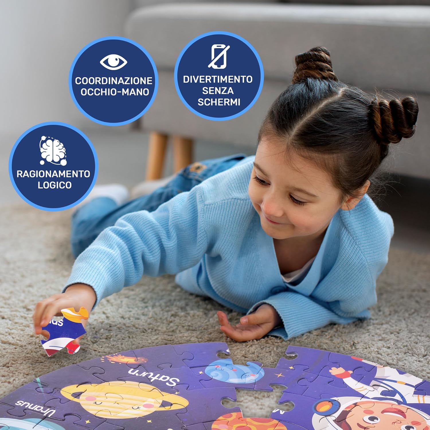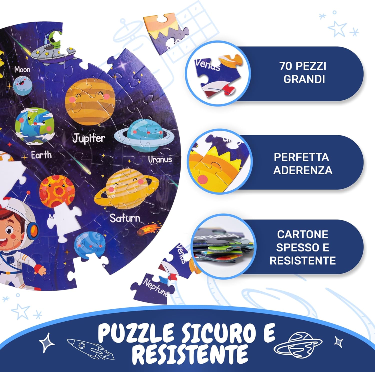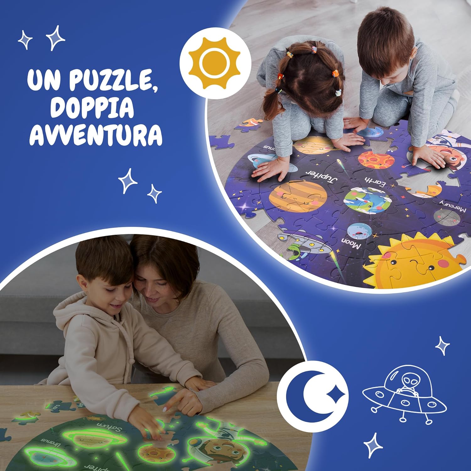 Puzzle Sistema Solare che brilla al buio: Trasforma ogni angolo in un’avventura spaziale! Il puzzle sistema solare per bambini mostra i pianeti con un effetto luminoso sorprendente. Spegni la luce e lascia che l’universo prenda vita! Puzzle circolare XL da 58 cm con poster reale: Puzzle bambini da 3 a 8 anni con 70 pezzi grandi in cartone spesso e resistente. Include poster a grandezza naturale per aiutare i più piccoli a completare il puzzle facilmente e decorare la stanza in modo educativo. Gioco educativo e divertente: Un gioco educativo per scoprire i pianeti e il sistema solare. Perfetto per stimolare curiosità, memoria e logica. I bambini imparano divertendosi, senza accorgersene! Giochi Montessori e attività spazio bambini per bambini da 3 a 8 anni: Stimola concentrazione, memoria e motricità fine con giochi Montessori e attività spazio bambini. Ideale per trascorrere tempo di qualità in famiglia, lontano da tablet e televisione, imparando a conoscere i pianeti e il sistema solare mentre si gioca. Idea regalo bambino 3 a 8 anni: Un regalo educativo e originale per compleanni o Natale. Questo puzzle con i pianeti del sistema solare conquista piccoli e grandi, unendo divertimento, apprendimento e attività spazio bambini in un unico gioco stimolante e creativo.