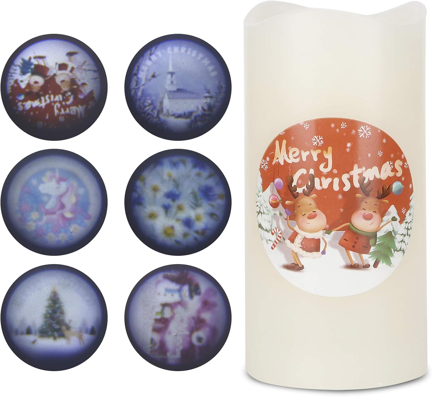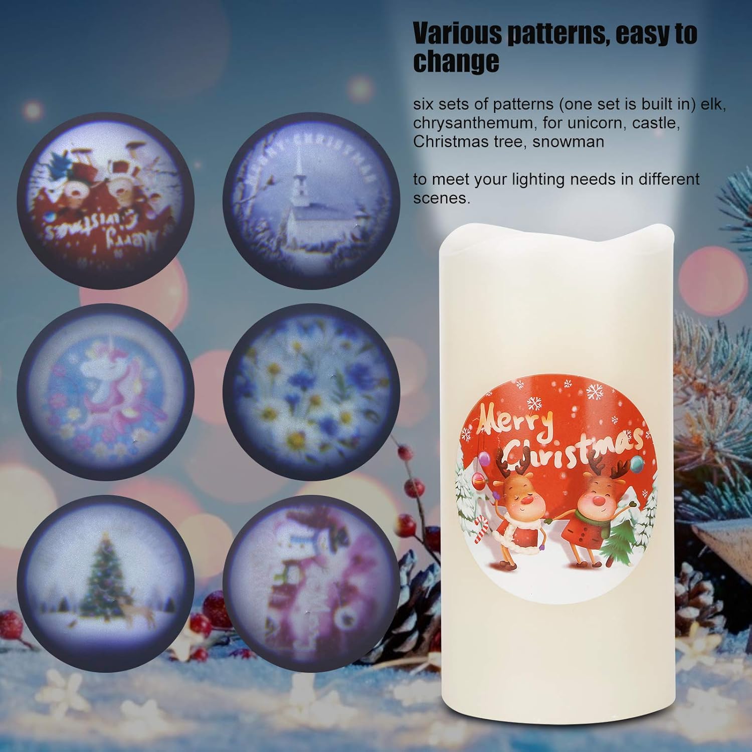 Atmosfera per la vita familiare - Questa lampada a candele a LED a misura di bambino/animali domestiche crea un illuminazione senza fiamma ideale per incontri per le vacanze (Natale/Capodanno), arredamento quotidiano in camere da letto/soggiorni e nessun ambienti di stress in cui le fiamme aperte rappresentano rischi. Candele a LED ricaricabili di lunga durata-batteria a bene efficiente dal punto di vista energetico, luci a LED durevoli e nessun design del fumo garantisce l'atmosfera interna ed ecologica. Proiezione versatile e applicazione multi -scene - Questa lampada a lume di candela progetta 6 motivi personalizzabili tra cui alce, crisantemo e temi per le vacanze (albero di Natale/pupazzo di neve/castello) attraverso coperture per lenti sostituibili. Inserisci semplicemente il disco modello desiderato, regola l'angolo di proiezione e goditi l'illuminazione ambientale per cene, decorazioni festive Ambiente familiare sicuro: la lampada a lume senza fiamma garantisce una sicurezza per bambini/animali domestici senza operazioni di fumo e zero rischio di incendio, creando atmosfera pacifica per le notti familiari mentre soddisfano severi standard di sicurezza statunitensi. Ideale per le famiglie attenti alla sicurezza: la lampada a lordo a LED senza fiamma offre un ambiente per bambini/animali domestici senza funzionamento del fumo, ottimo per le case che danno la priorità alla sicurezza antincendio durante le vacanze, le cene o l'arredamento quotidiano senza fiamme aperte.