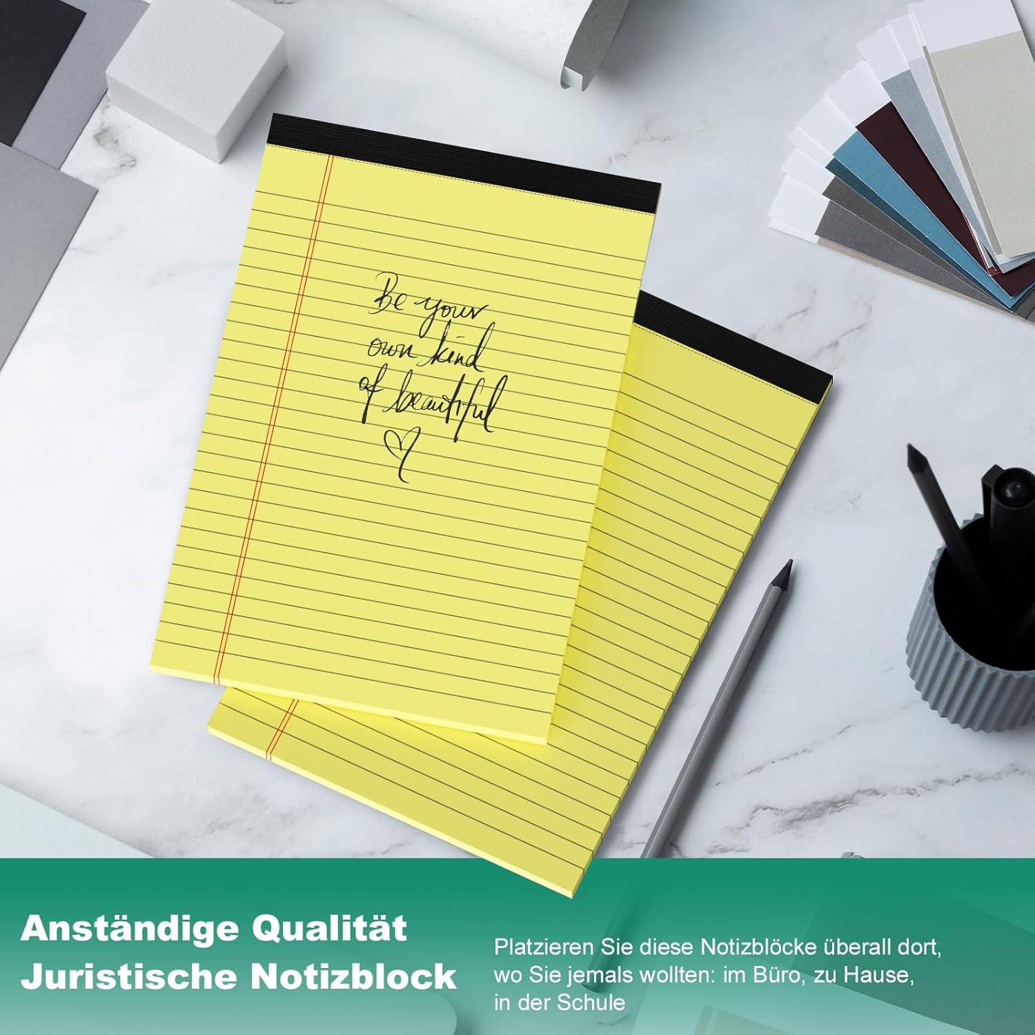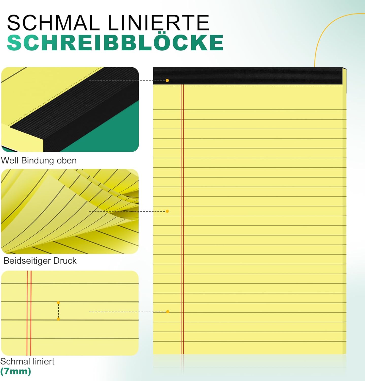 Descrizione: Questi quaderni sono gialli come la stampa di sfondo, il colore è chiaro ed elegante, ti permette anche di descrivere il buon umore ogni volta che scrivi in modo naturale il buon umore, la carta ha abbastanza spessore, non viene scritta, l'inchiostro non penetra e anche la scorrevolezza è molto buona, garantisce anche un certo grado di attrito, il che rende più facile scriverne di più. Caratteristiche: 1. Formato portatile: blocchi legali A5; ogni blocco note giallo ha 30 fogli, il blocco note dalla linea sottile ti consente di inserire più informazioni. 2. Rimozione semplice dei fogli: separare la carta dal resto del blocco note è un gioco da ragazzi. I blocchi note gialli sono perforati in modo da poter separare una pagina in modo rapido e ordinato. 3. Carta da lettere di alta qualità: i blocchi di scrittura di eccellente qualità sono uno strumento versatile per chiunque abbia bisogno di prendere appunti o descrivere idee.