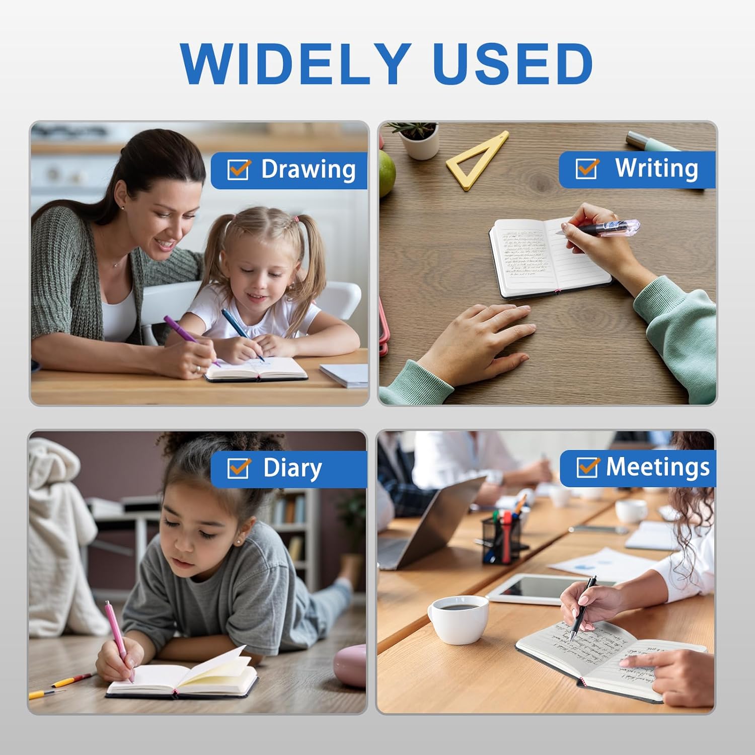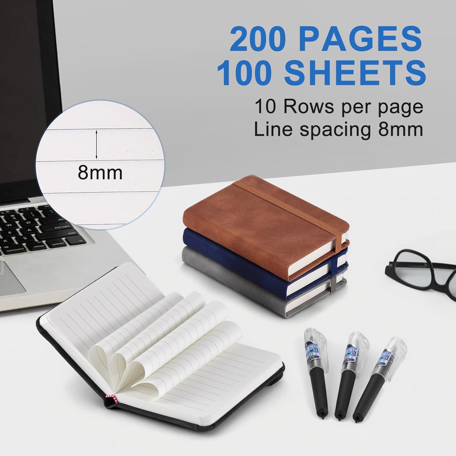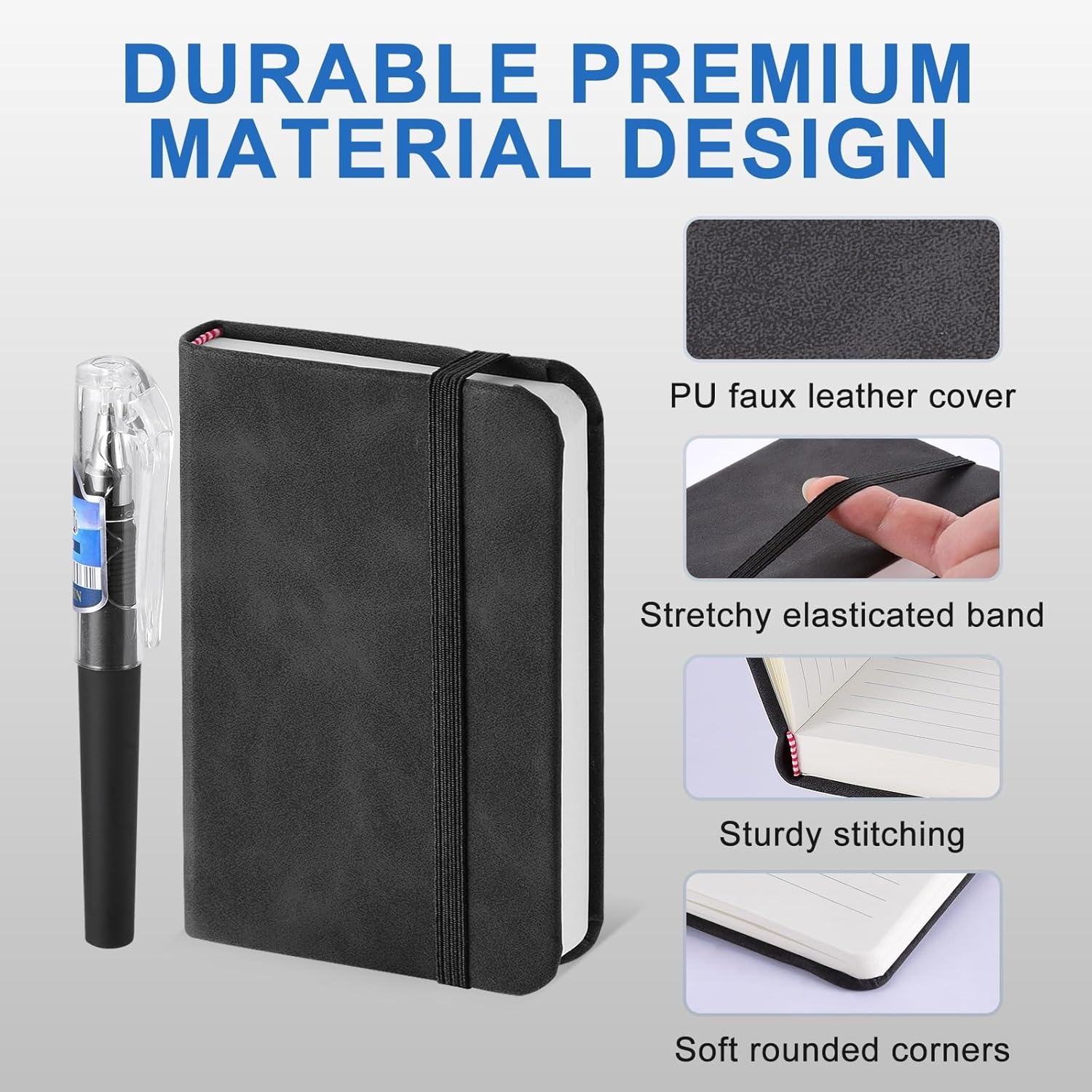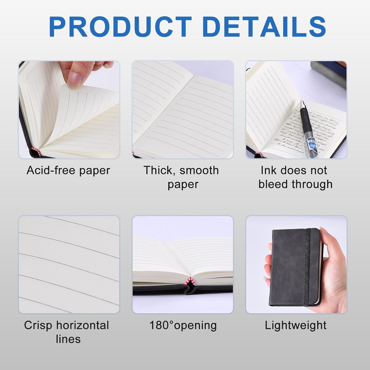 【Set di quaderni compatti】Il set comprende 4 quaderni A7 (7,5 x 1,8 x 11,7 cm/2,95 x 0,7 x 4,37 pollici) e 4 penne nere. Ogni quaderno è confezionato singolarmente, facile da trasportare, puoi metterlo in tasca o in una cartella, comodo per annotare idee e ispirazioni in qualsiasi momento. 【Copertina e carta di alta qualità】 Questa copertina per mini notebook è realizzata in pelle PU resistente all'usura, impermeabile e antimacchia e protegge efficacemente la carta interna. Le pagine interne sono realizzate in carta spessa e liscia, che garantisce un'esperienza di scrittura fluida e 0 sbavature di inchiostro, e non è facile da indossare e strappare, quindi la tua scrittura è chiaramente visibile. 【Fascia elastica e penna】 Il nostro piccolo taccuino ha una fascia elastica che mantiene il taccuino saldamente in posizione e ne impedisce l'apertura casuale durante il trasporto o la conservazione. Quando hai bisogno di prendere appunti veloci, non devi lottare per trovare le penne, sono sempre accanto al tuo taccuino per comodità. 【Design pratico】Ogni mini taccuino può essere aperto di 180 gradi per prendere facilmente appunti. Un taccuino contiene 100 fogli di carta spessa color avorio, con un design interno piatto a grana dritta, che può darti abbastanza spazio per prendere appunti. Il taccuino è resistente e durevole, con cuciture sicure e rilegatura perfetta per offrirti un'esperienza di scrittura senza problemi. 【Ampiamente usato】 Il nostro taccuino tascabile è adatto per disegnare, scrivere, diario, prendere appunti durante riunioni e molte altre occasioni. Che tu sia uno studente, un professionista o un lavoratore creativo, puoi sfruttare la sua versatilità. Può anche essere usato come regalo per amici, compagni di classe, familiari e insegnanti.