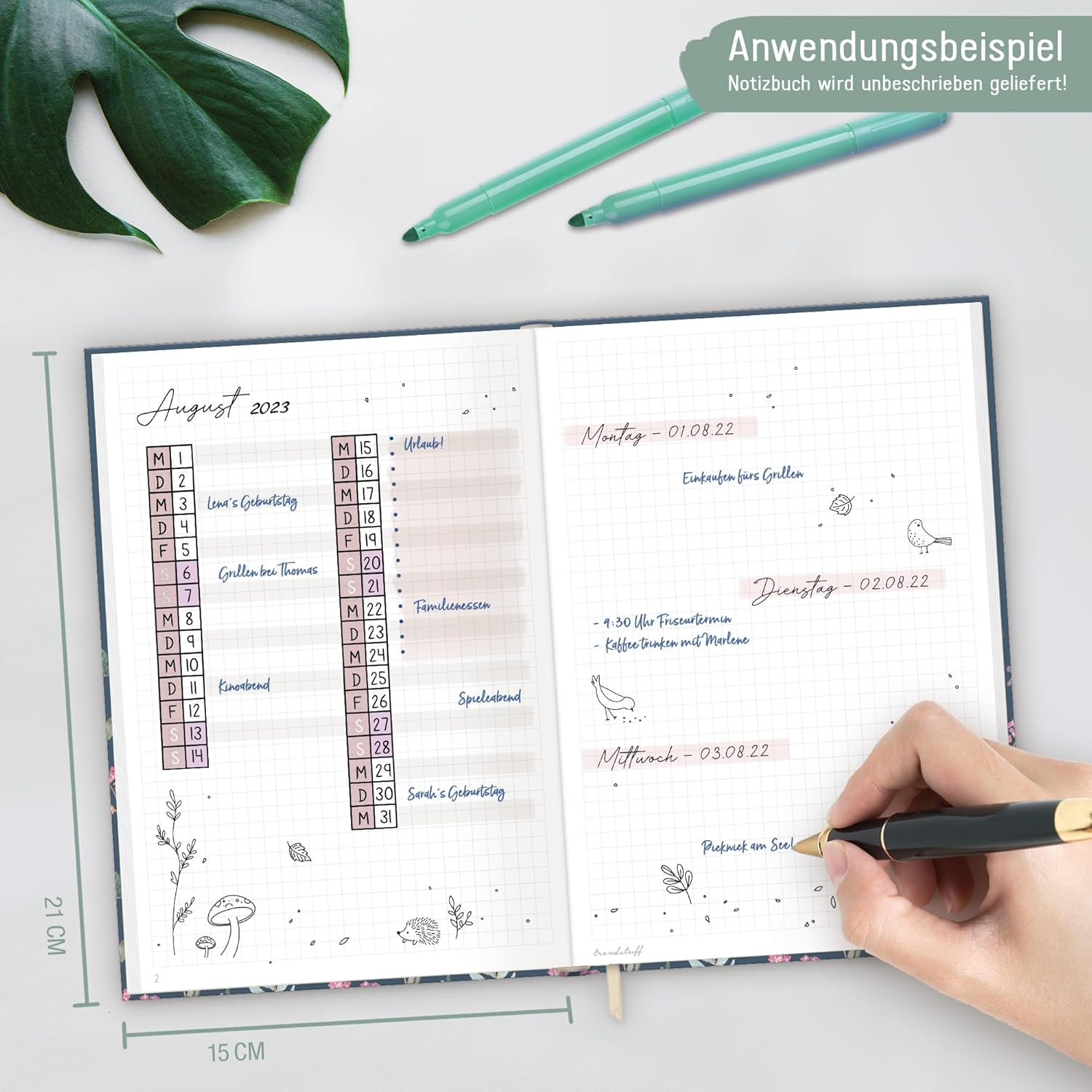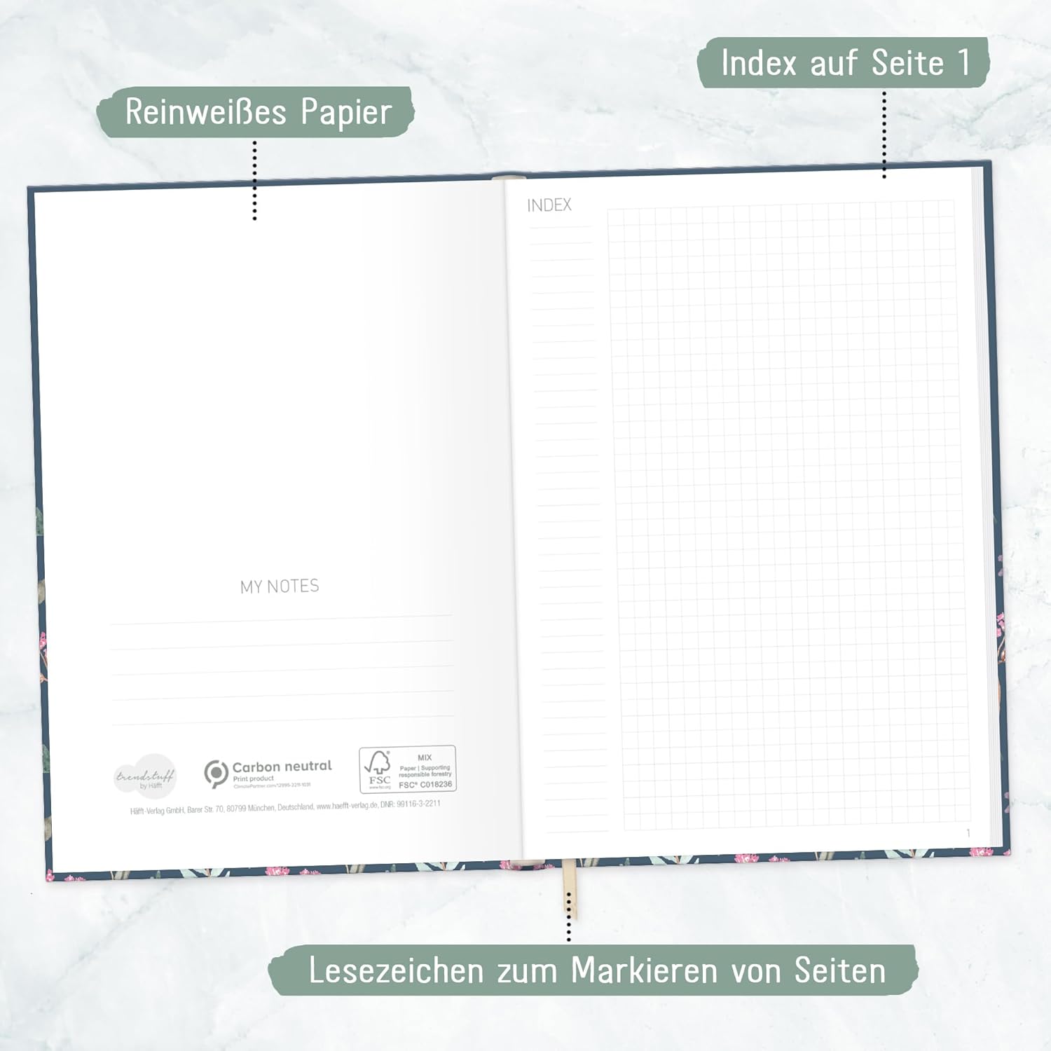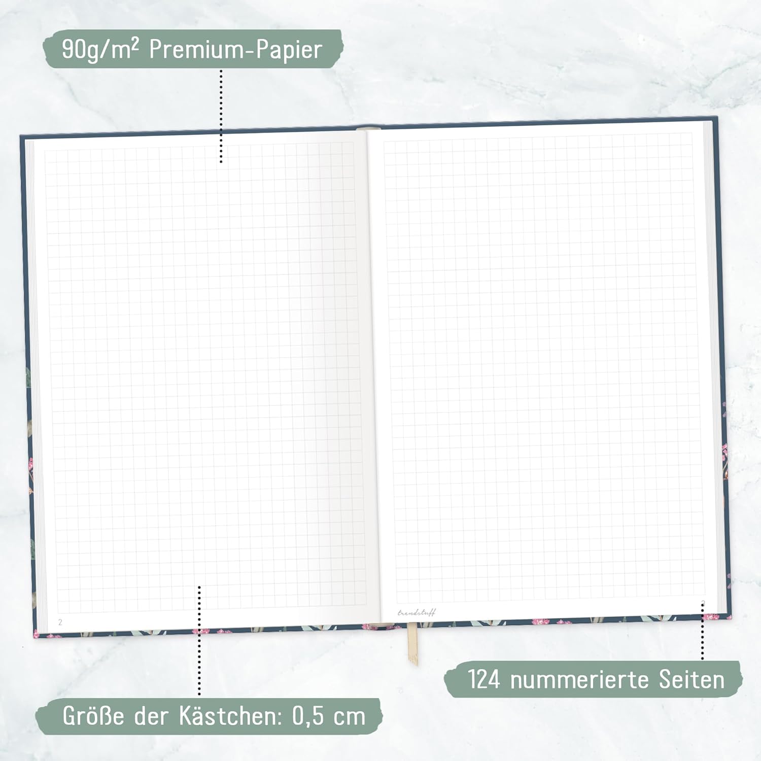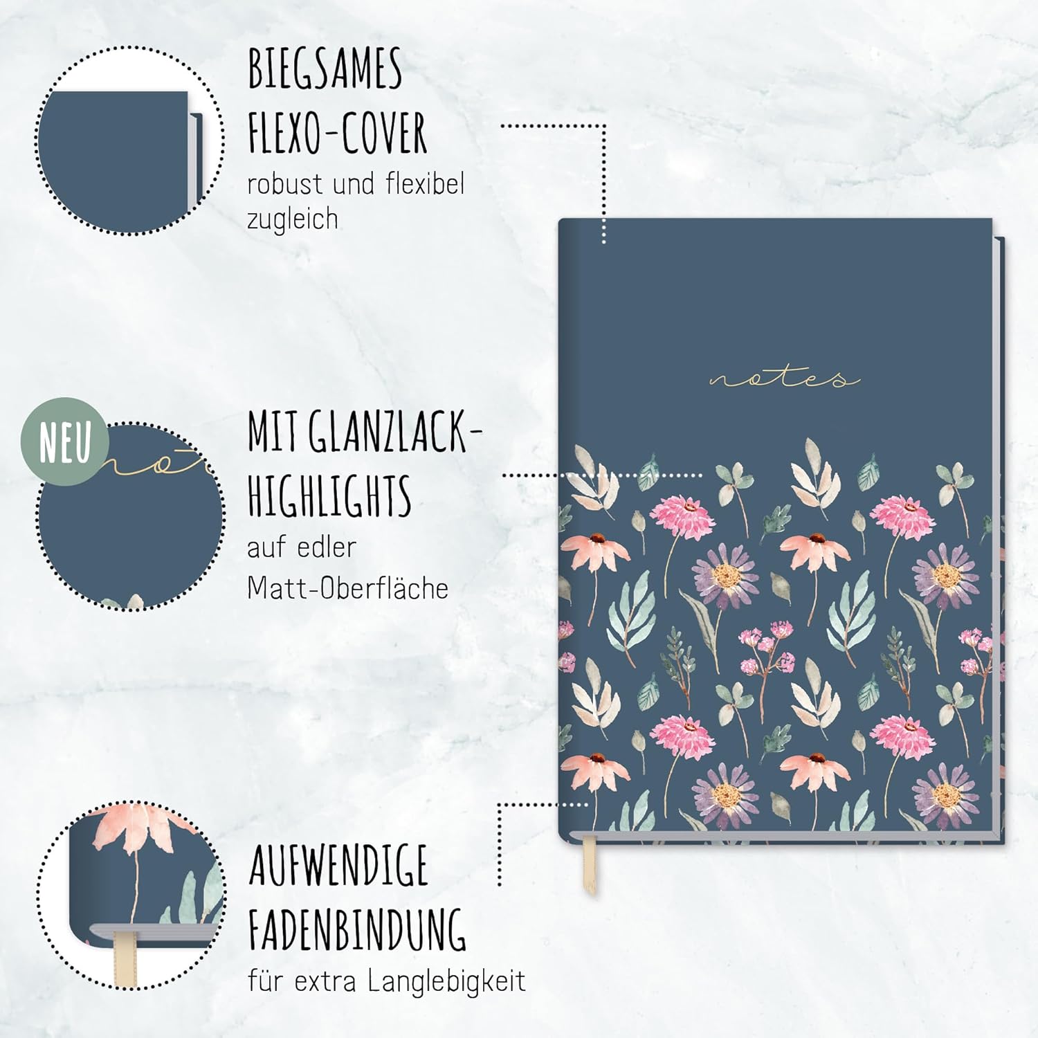 Elegante taccuino con nastro da lettura per uso universale: come diario, per obiettivi, schizzi, piani e pensieri, come diario o per bullet journaling - sempre con te e a portata di mano quando annuncia Flying Flowers! Un compagno fedele: la copertina flexo flessibile ma stabile unisce le migliori caratteristiche della copertina rigida e della copertina morbida, è inoltre resistente agli schizzi e cancellabile. La rilegatura cucita intricata e robusta impedisce che le pagine si strappino. Una carta che promuove il buon uso delle foreste: la nostra carta Premium da 90 g/m² è certificata FSC (FSC N004440). Per fare un confronto, la carta standard ha solitamente uno spessore di soli 70 g/m². Carta e penna piuttosto che smartphone: scrivere a mano i tuoi pensieri, sentimenti, idee o obiettivi può aiutarti ad essere più chiaro e ad avere più successo! Pratico quaderno formato: DIN A5 (15 x 21 x 1 cm), righe: a quadretti, pagine: 124
