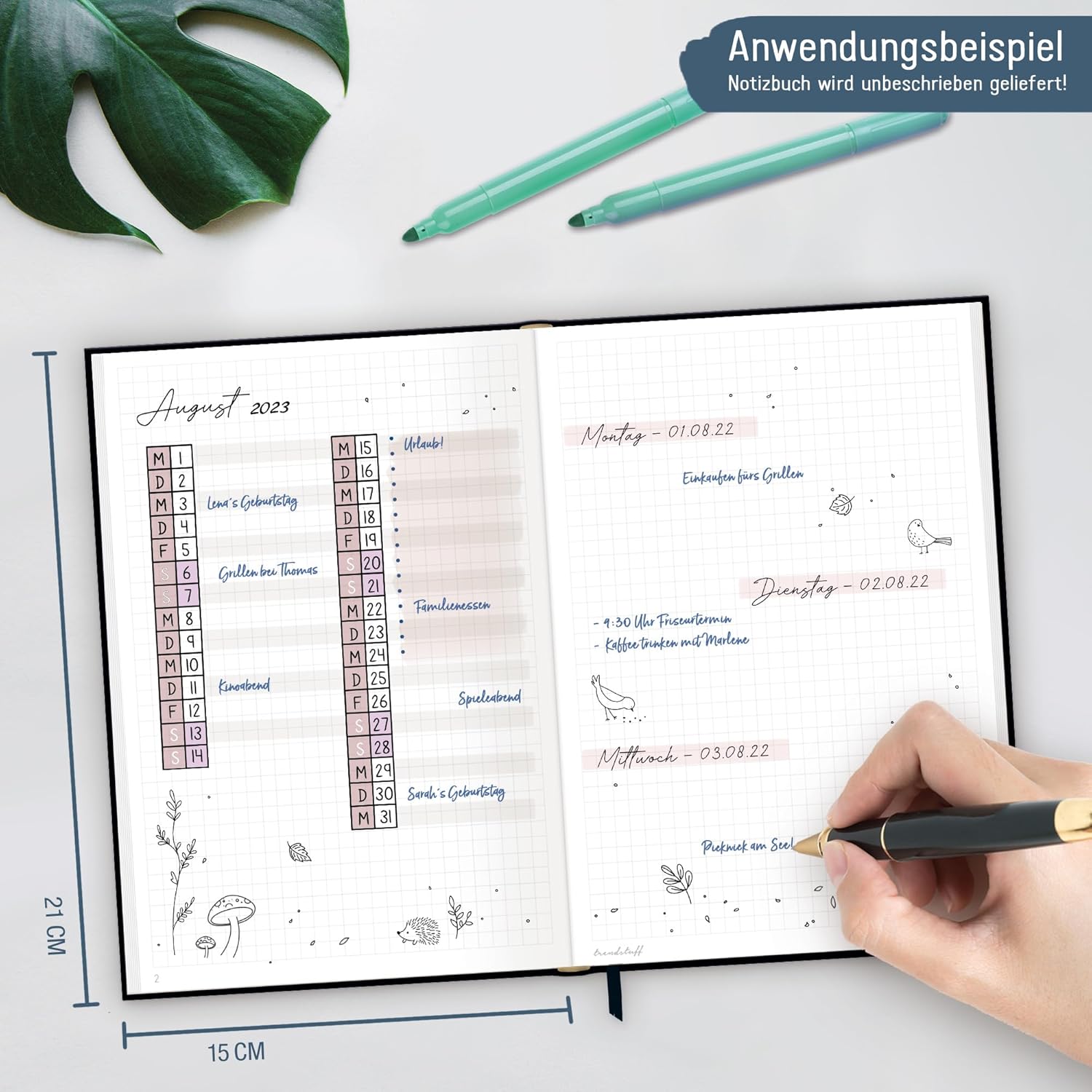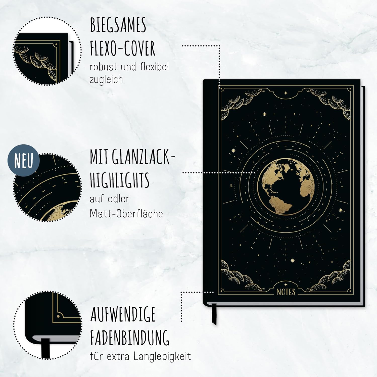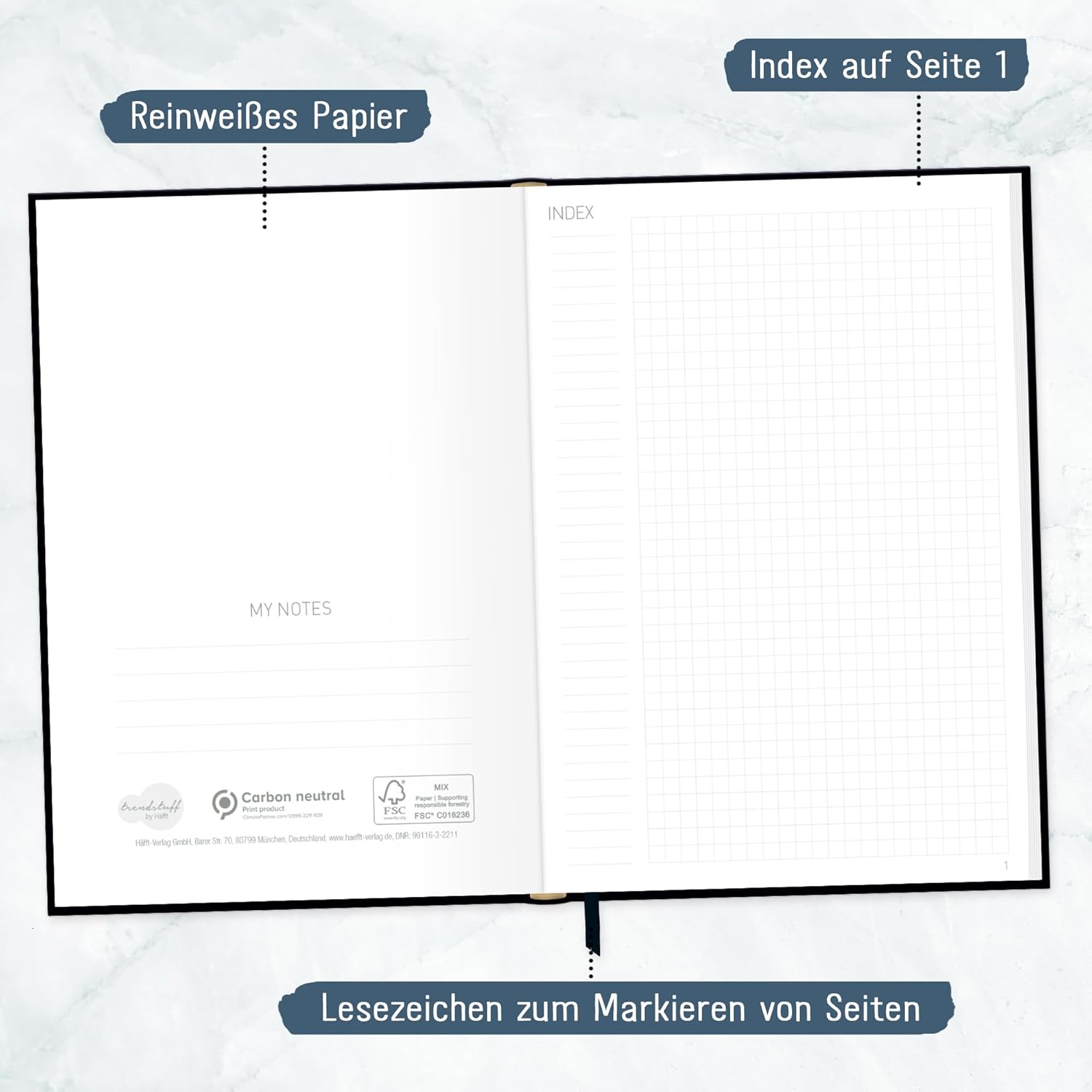 Elegante taccuino con nastro da lettura per uso universale: come diario, per obiettivi, schizzi, progetti e pensieri, come diario o per il bullet journaling - sempre con te e a portata di mano quando colpisce un lampo di genio! Un compagno fedele: la copertina flexo flessibile ma stabile unisce le migliori caratteristiche della copertina rigida e della copertina morbida, è inoltre resistente agli schizzi e cancellabile. La rilegatura cucita intricata e robusta impedisce che le pagine si strappino. Una carta che promuove il buon uso delle foreste: la nostra carta Premium da 90 g/m² è certificata FSC (FSC N004440). Per fare un confronto, la carta standard ha solitamente uno spessore di soli 70 g/m². Carta e penna piuttosto che smartphone: scrivere a mano i tuoi pensieri, sentimenti, idee o obiettivi può aiutarti ad essere più chiaro e ad avere più successo! Pratico quaderno formato: DIN A5 (15 x 21 x 1 cm), righe: a quadretti, pagine: 124