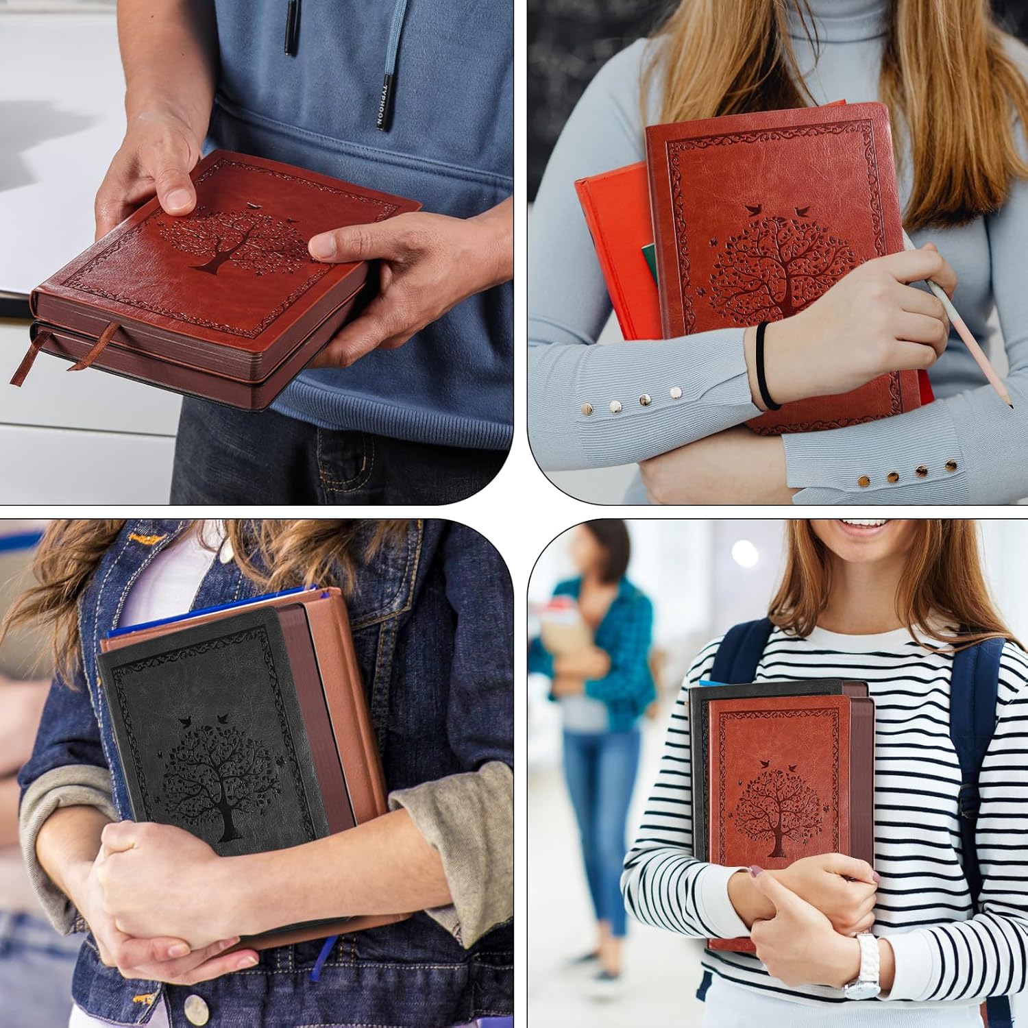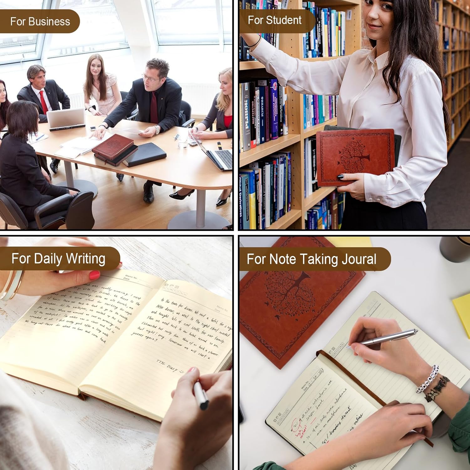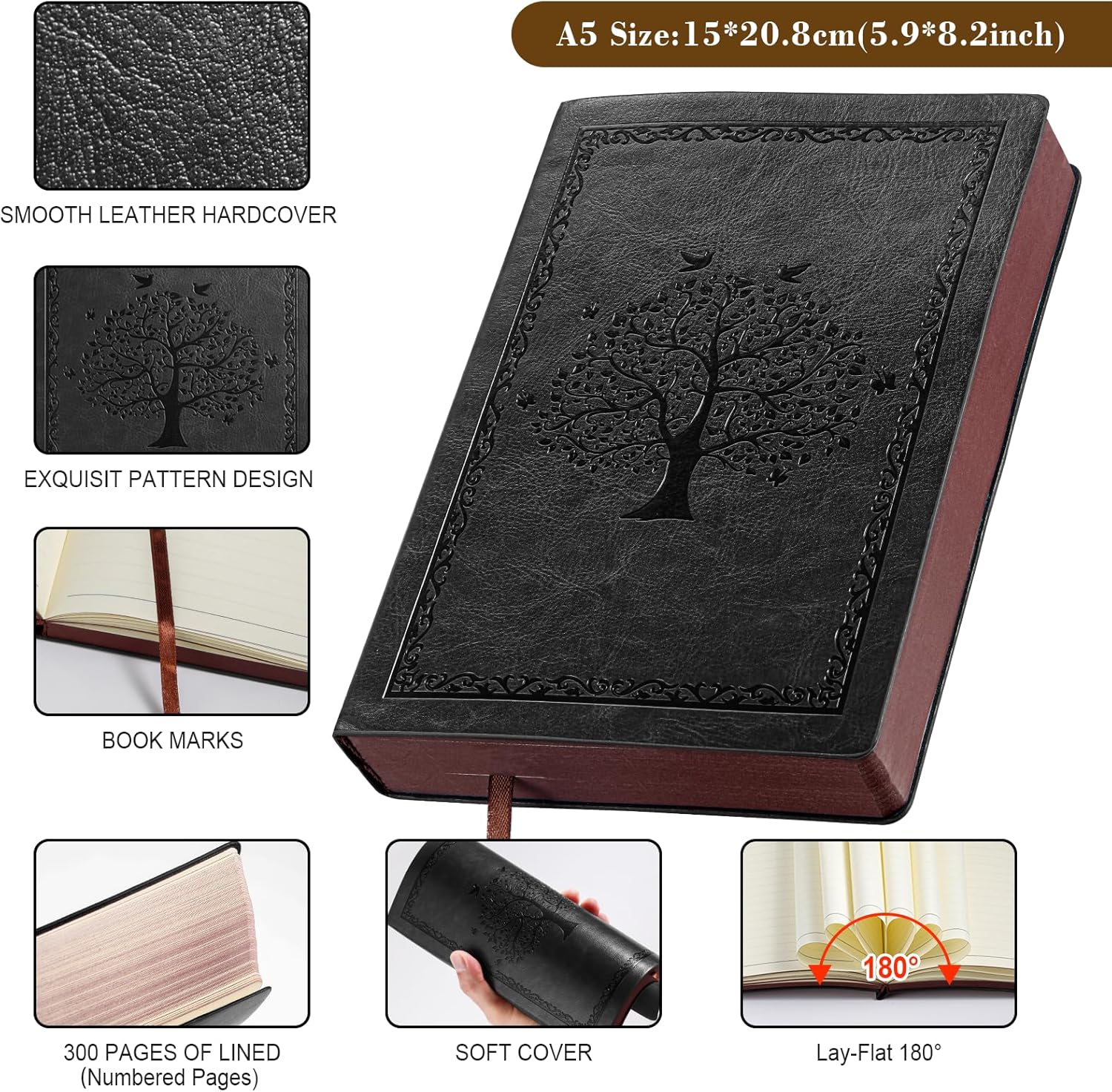 300 PAGINE E CARTA SPESSA DA 80 GM: il taccuino A5 misura 15 cm x 21,5 cm e ha 300 pagine e 150 fogli. La spessa carta color crema da 80 g/m², dotata di una tecnologia cartacea innovativa, fornisce la tela perfetta per le tue idee. Il taccuino può essere posizionato ad un angolo di 180° e offre quindi molto spazio per scrivere e leggere comodamente. ROBUSTA COPERTINA MORBIDA IN PELLE: Il look vintage della copertina morbida rilegata a mano e la goffratura di alta qualità in pelle sintetica proteggono le pagine interne dall'usura e garantiscono una lunga durata e una piacevole sensazione al tatto. Adatto per penne stilografiche, penne a sfera, matite o penne firmate. La carta spessa previene perdite di inchiostro e immagini fantasma e garantisce una scrittura pulita e chiara. DETTAGLI FUNZIONALI: i bordi della carta sono arrotolati a colori, finitura fine. Carta beige per proteggere gli occhi, scrittura lunga senza fatica, scrittura più fluida. Pratica striscia di segnalibri, comoda da contrassegnare e trovare, design intimo, ogni dettaglio da penetrare. NOTEBOOK MULTIUSO: Un notebook non è solo uno strumento pratico per scrivere, ma ha anche un valore emotivo. Può essere uno strumento importante per documentare la vita, il lavoro e gli appuntamenti, ma anche per condividere conoscenze ed esperienze. In occasioni speciali come lauree, matrimoni, ecc., i quaderni possono anche diventare meravigliosi ricordi che le persone apprezzano. MIGLIOR REGALO: questo quaderno è molto adatto per il mondo accademico e molti altri campi ed è ideale per scuole e uffici. Può essere utilizzato come diario di scrittura personale, diario di viaggio, diario di ricerca, taccuino aziendale, blocco note e molto altro!