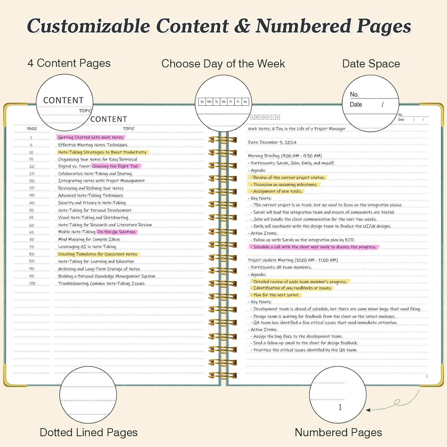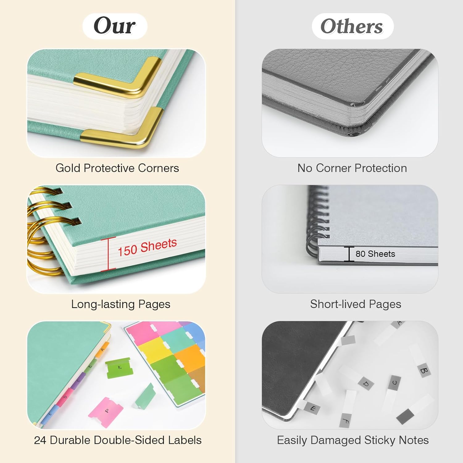 300 pagine numerate con 4 contenuti: il grosso diario ha un totale di 304 pagine, con 300 pagine numerate e 4 pagine di contenuti dedicati. Questa sezione ti consente di fare riferimento facilmente a note o sezioni importanti contrassegnandole in anticipo per un accesso rapido e organizzato. Ogni pagina include un'intestazione fronte-retro in cui è possibile specificare il giorno della settimana e inserire la data con il formato "No." ___ Data ___, per prendere appunti in modo organizzato e semplice. Ottimo per tenere traccia di attività ed eventi. COPERTURA IN PELLE PREMIUM E RILEGATURA RESISTENTE: il taccuino a spirale presenta una lussuosa copertina rigida in pelle, con protezioni angolari color oro per una maggiore durata. Il suo design professionale non è solo elegante, ma è costruito per durare. La robusta rilegatura in metallo a doppia spirale consente un design completo a 360°, rendendo la scrittura più comoda ed efficiente. Sia che si sfogli o si appoggi il taccuino in piano, questo design garantisce un'esperienza di scrittura fluida. Carta da 100 g/m² senza sbavature di inchiostro e grande formato A5: il taccuino a righe è dotato di carta bianco crema da 100 g/m² di alta qualità, più spessa rispetto alle alternative del mercato tradizionale. Ciò impedisce all'inchiostro di fuoriuscire e creare immagini fantasma, fornendo protezione per gli occhi. Con le ampie dimensioni A5 (6" x 8") e l'interlinea di 7,1 mm, avrai molto spazio per appunti, schizzi e progetti senza sentirti angusto. Taccuino accuratamente foderato: il taccuino include una fascia elastica di chiusura per mantenerlo saldamente chiuso e ha una tasca posteriore espandibile per riporre appunti o carte. Inoltre, viene fornito con 24 adesivi colorati per una facile suddivisione e classificazione delle note, perfetti per scuola, ufficio, casa, organizzazione del lavoro, università, affari, adulti. Usi versatili e scelta regalo ideale: disponibili in nero, rosa, verde menta, blu scuro e azzurro, questi diari soddisfano esigenze diverse. Servono a molteplici scopi, tra cui pianificatori personali, diari di lettura, diari di viaggio, quaderni di riunioni, pianificatori di sondaggi, taccuini ed elenchi di cose da fare. Con il suo design elegante e pratico, questo diario è un regalo premuroso per amici, familiari o colleghi, ideale per compleanni, Natale o come regalo per il rientro a scuola.