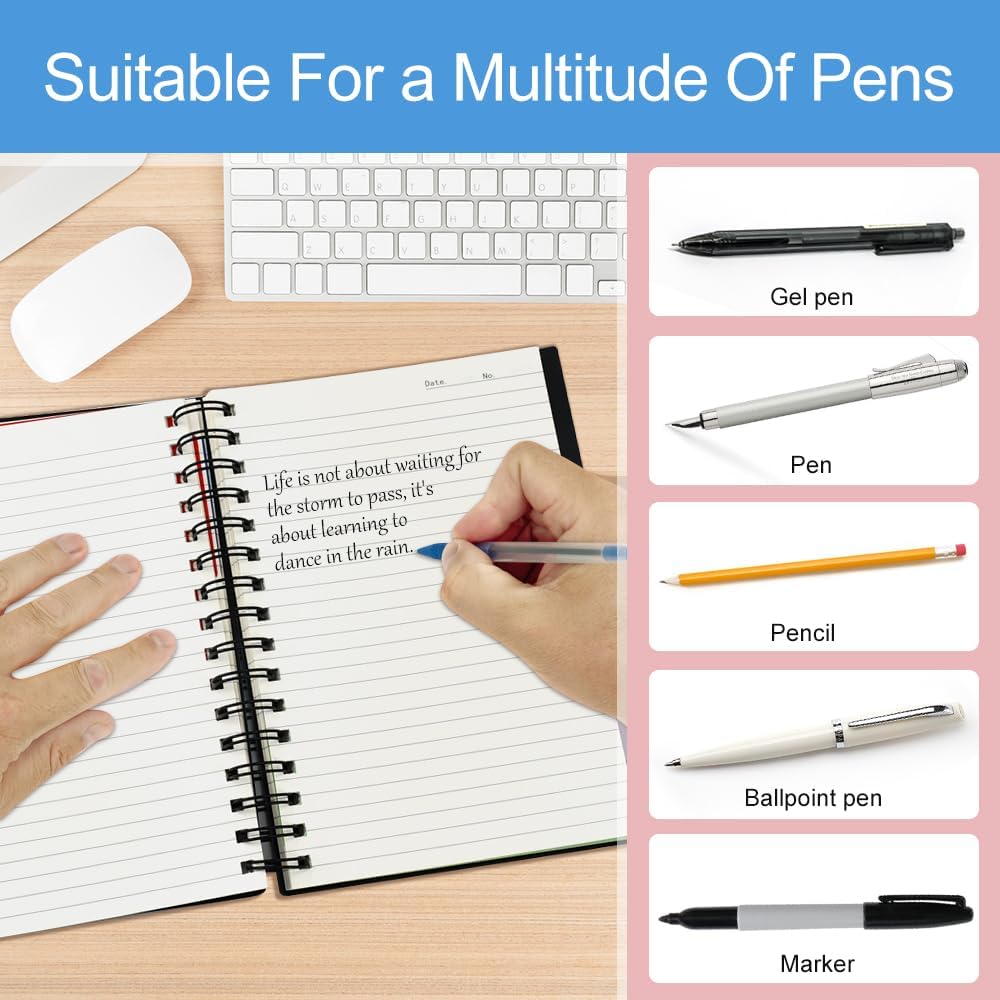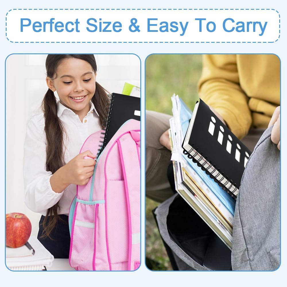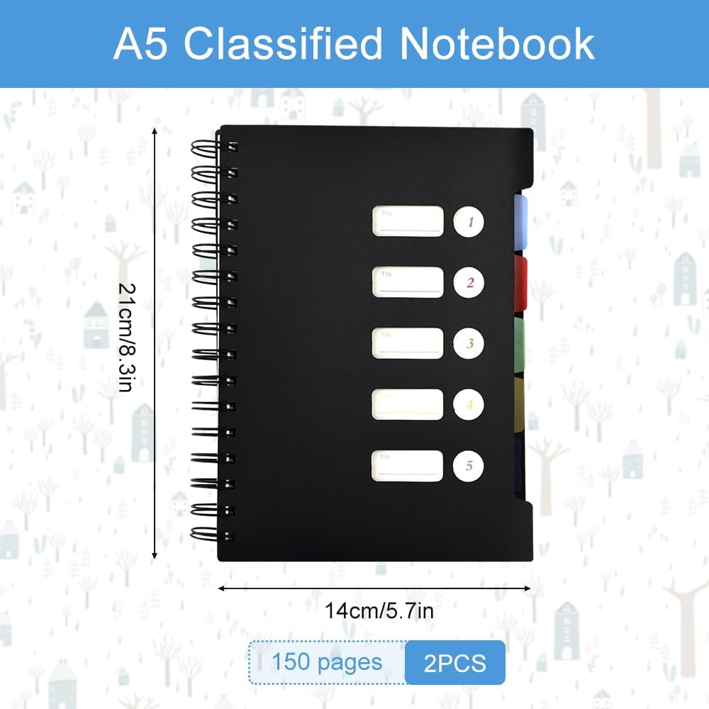 【Viene fornito con 150 fogli di carta e 5 pagine divisorie】: La confezione contiene due bellissimi quaderni a spirale A5 in nero, ogni quaderno è dotato di 150 fogli di carta di alta qualità e 5 pratiche pagine divisorie, fornendo spazio di scrittura sufficiente per soddisfare le vostre esigenze quotidiane di documentazione, pianificazione ed espressione creativa. Inoltre, questo set di quaderni ha un design semplice ed elegante, che lo rende un regalo ideale per i tuoi amici, colleghi o studenti. 【Materiale cartaceo di alta qualità, copertura impermeabile】: questo quaderno a righe A5 è realizzato con materiale cartaceo di alta qualità per garantire una scrittura fluida e il design di stampa fronte-retro sfrutta appieno ogni pagina ed evita gli sprechi. La carta ha uno spessore moderato, è adatta alla scrittura con diversi tipi di penne ed evita sbavature e macchie. 【Classificazione pratica e ricerca rapida】: il design colorato della partizione integrata del taccuino a spirale A5 nero ti consente di dividere facilmente il tuo taccuino in 5 parti per una classificazione semplice e una ricerca rapida. Ogni spartito ha un colore diverso, che ti consente di classificare e organizzare meglio le tue note. Puoi facilmente contrassegnare diverse informazioni nel documento e conservare le note in modo chiaro e organizzato. 【Design tascabile interno trasparente】: il primo divisore blu di ogni quaderno a spirale A5 ha un design con tasca a clip che ti consente di riporre facilmente foto, cartoline, biglietti da visita e altri oggetti, proteggendo efficacemente le informazioni importanti e tenendole sempre a portata di mano. Il tessuto trasparente della custodia facilita la visione del contenuto e migliora così la praticità e l'esperienza di utilizzo del laptop. Ampio utilizzo: questo quaderno A5 a spirale è ampiamente utilizzato e adatto a studenti, professionisti e famiglie. Che si tratti di scrittura personale, lettura di appunti, diari di viaggio o appunti di lavoro quotidiano, appunti di indagine e gestione delle attività, può soddisfare le tue esigenze. Puoi usarlo in base alle occasioni e alle esigenze e renderlo un potente assistente nella tua vita e nel tuo lavoro.