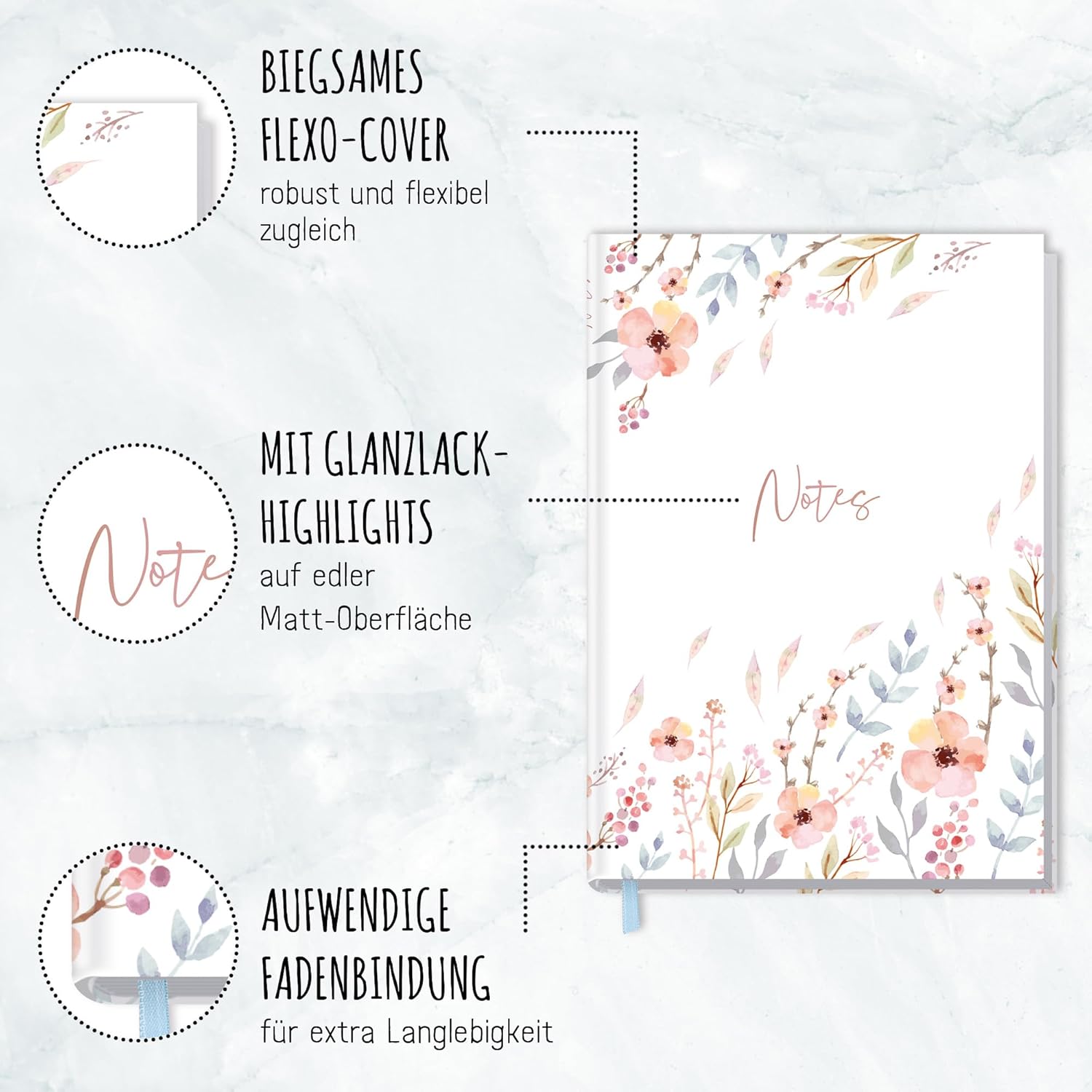 Elegante quaderno a righe con nastro da lettura per uso universale: come diario, per obiettivi, schizzi, piani e pensieri, come diario o per bullet journaling - sempre con te e a portata di mano quando annuncia Sweet Flowers! Un compagno fedele: la copertina flexo flessibile ma robusta unisce le migliori caratteristiche delle copertine rigide e morbide, è resistente agli schizzi e cancellabile. La rilegatura a filo intricata e robusta tiene insieme le pagine in modo sicuro. La carta promuove il buon uso delle foreste: la nostra carta di alta qualità da 90 g/m² è certificata FSC (FSC N004440) e stampata nel rispetto del clima. Carta e penna piuttosto che smartphone: scrivere a mano i tuoi pensieri, sentimenti, idee o obiettivi può aiutarti ad essere più chiaro e ad avere più successo! Pratico quaderno formato: DIN A5 (15 x 21 x 1 cm), righe: a righe, pagine: 124