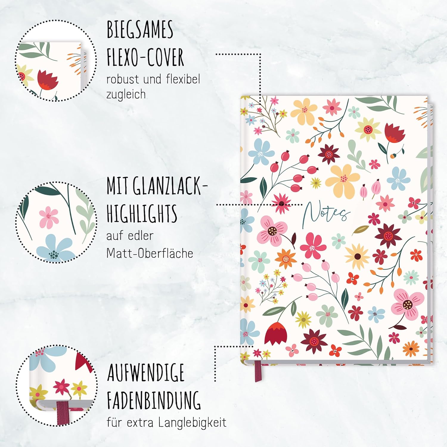 Elegante quaderno a righe con nastro da lettura per uso universale: come diario, per obiettivi, schizzi, progetti e pensieri, come diario o per bullet journaling - sempre con te e a portata di mano quando Wildflower annuncia! Un compagno fedele: la copertina flexo flessibile ma robusta unisce le migliori caratteristiche delle copertine rigide e morbide, è resistente agli schizzi e cancellabile. La rilegatura a filo intricata e robusta tiene insieme le pagine in modo sicuro. La carta promuove il buon uso delle foreste: la nostra carta di alta qualità da 90 g/m² è certificata FSC (FSC N004440) e stampata nel rispetto del clima. Carta e penna piuttosto che smartphone: scrivere a mano i tuoi pensieri, sentimenti, idee o obiettivi può aiutarti ad essere più chiaro e ad avere più successo! Pratico quaderno formato: DIN A5 (15 x 21 x 1 cm), righe: a righe, pagine: 124