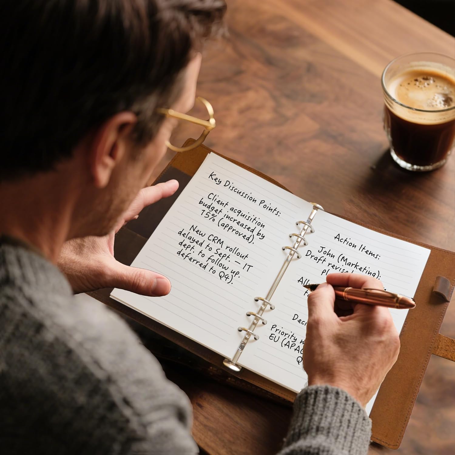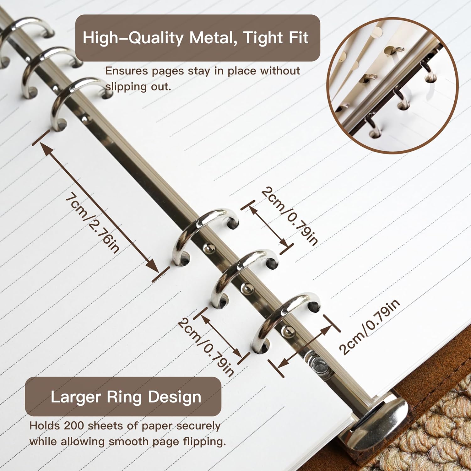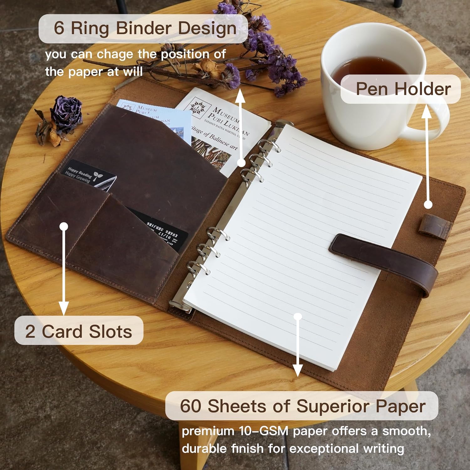 Pelle di alta qualità: taccuino A5 fatto a mano in vera pelle che sviluppa una bella patina nel tempo RICARICABILE: il sistema di raccoglitore a 6 anelli semplifica l'aggiunta o la rimozione delle pagine secondo necessità Contenuto completo: 120 pagine di scrittura di alta qualità offrono ampio spazio per appunti, schizzi e pensieri Formato pratico: il formato A5 offre una mobilità ottimale con una superficie di scrittura sufficiente Uso versatile: perfetto come diario di viaggio, diario personale o taccuino creativo per artisti. Scelta regalo per marito/moglie/padre/madre/figlio/amici.