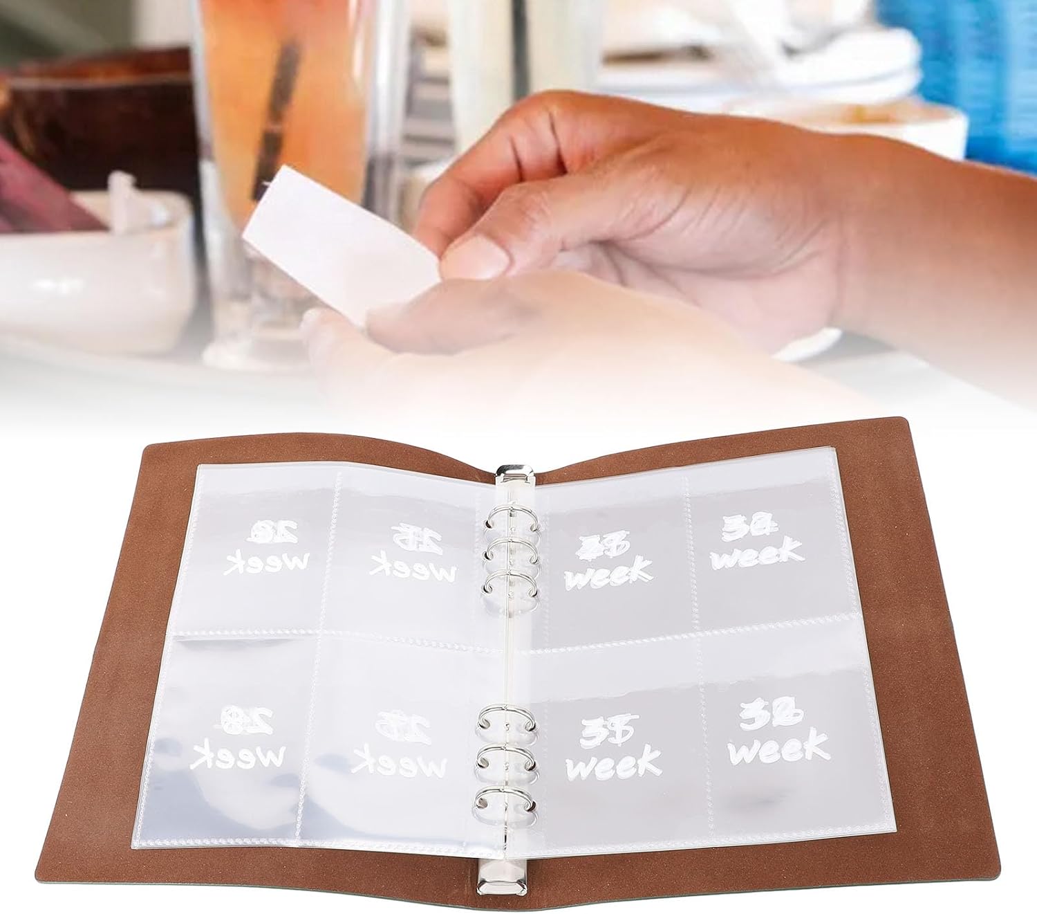 [FINITURA IN PELLE PREMIUM] Struttura in pelle morbida e resistente per un comfort e un utilizzo di lunga durata. [BUSTE TRASPARENTI] Le buste in pellicola PP forniscono una visione chiara del denaro risparmiato e ne facilitano il monitoraggio. [STRATEGIA DI RISPARMIO PROGRESSIVO] Inizia con piccoli importi settimanali e crea risparmi effettivi in 52 settimane. [RIUTILIZZABILE E CONVENIENTE] Completa la sfida e utilizza nuovamente l'agenda per obiettivi di risparmio continui. [FAMIGLIA] Risparmia denaro con i tuoi cari in modo divertente ed efficace, rendendolo un ideale.