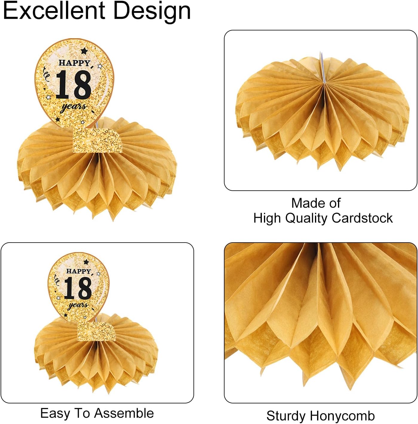 Contenuto del Pacchetto: Riceverai 1 set di centrotavola per decorazioni del 18º compleanno per tavoli, che include un manuale di istruzioni, 9 cartoncini decorati e 9 nidi d'ape di carta (4 neri e 5 tono oro). Caratteristiche: Il centrotavola per decorazioni del 18º compleanno per tavoli presenta un design che aggiunge un tocco festoso a qualsiasi celebrazione di compleanno. Il tavolo è appositamente progettato per feste di compleanno, rendendolo una decorazione perfetta per l'occasione. Funzione: Questa decorazione da tavolo serve come punto focale per la festa di compleanno, aggiungendo un elemento divertente e decorativo alla celebrazione. Aiuta a impostare il tema dell'evento, migliorando l'estetica complessiva e l'atmosfera della festa. Facile da usare: Semplicemente apri il design e posizionalo sul tavolo come centrotavola. Puoi abbinarlo ad altre decorazioni e accessori per feste per creare un tema di compleanno coerente. Utilizzo multiplo: Adatto sia per uomini che per donne che festeggiano il loro compleanno. Può essere utilizzato in diverse ambientazioni, tra cui casa, sala da pranzo o ristorante.