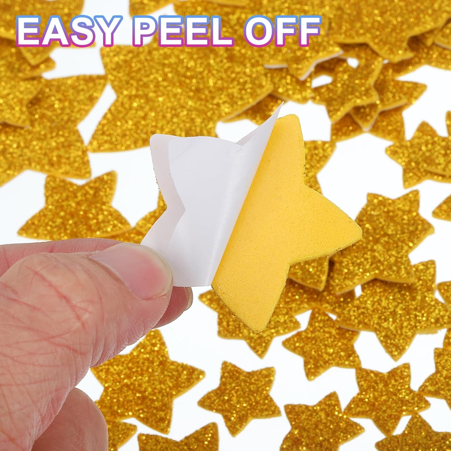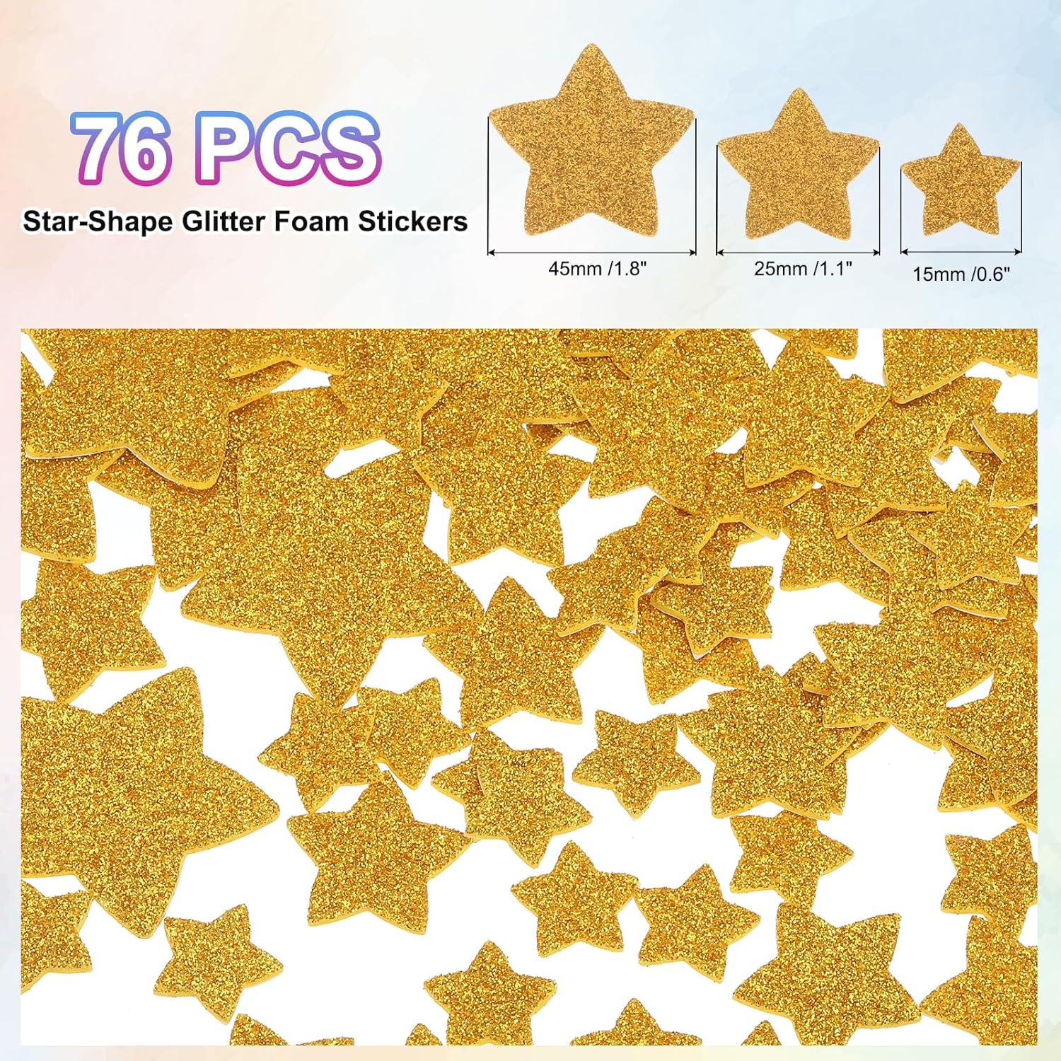 Adesivi in schiuma glitterata di diverse dimensioni con splendidi disegni a forma di stella e un effetto visivo scintillante, oltre alla consistenza tridimensionale della schiuma. Ogni adesivo è luminoso e perfetto per poster, scrapbook, biglietti d'auguri e decorazioni per feste. Gli adesivi colorati in schiuma sono ideali per biglietti d'auguri, progetti creativi, decorazioni per la classe e la casa, telefoni, lavoretti fai da te, ecc. Colore: Oro; Dimensioni Totali: 15 x 15 mm / 0,6 x 0,6 pollici; 25 x 25 mm / 1 x 1 pollice; 45 x 45 / 1,8 x 1,8 pollici; Forma: Stella Materiali in schiuma PVC EVA, morbidi al tatto. Gli adesivi in schiuma glitterata hanno un effetto tridimensionale evidente, che aumenta la profondità e l'interesse della decorazione. Questi adesivi per lavoretti sono realizzati con materiali di Buona qualità e la superficie è ricoperta da uno strato sottile di glitter, risultando non solo morbidi al tatto ma anche resistenti nel tempo, con una lucentezza duratura che non si stacca facilmente. Questi adesivi a forma di cuore sono realizzati in materiale EVA con forte adesività, resistenti e riutilizzabili, morbidi per lavoretti, leggeri e autoadesivi. Puoi attaccarli dove preferisci. Prima di incollare, assicurarsi che la superficie sia pulita e liscia per migliorare l'effetto adesivo. La superficie è ricoperta da una polvere dorata scintillante che potrebbe perdere parzialmente polvere, un fenomeno normale che non influisce sull'aspetto e sull'utilizzo.