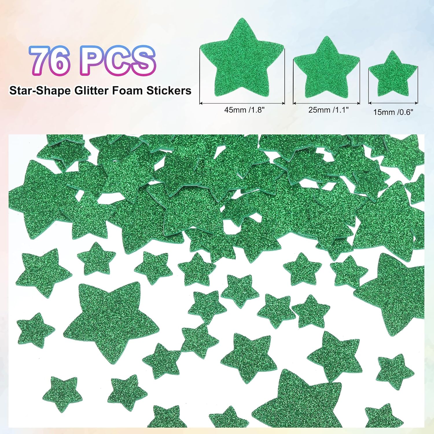 Adesivi in schiuma glitterata di diverse dimensioni con bellissimi disegni a stella e un effetto visivo scintillante e la consistenza tridimensionale della schiuma, ogni adesivo in schiuma è scintillante e perfetto per poster, album di ritagli, biglietti di auguri e decorazioni per feste. Gli adesivi in schiuma colorati sono perfetti per biglietti di auguri, progetti artigianali, decorazioni per la classe e la casa, telefoni, lavoretti DIY, ecc. Colore: Verde; Dimensioni Totali: 15 x 15 mm / 0.6 x 0.6 pollice; 25 x 25 mm / 1 x 1 pollice; 45 x 45 / 1.8 x 1.8 pollice; Forma: Stella Materiali in schiuma PVC e EVA, morbidi al tatto. Gli adesivi in schiuma glitterata hanno un notevole effetto tridimensionale, che aumenta la stratificazione e l'interesse della decorazione; Questi adesivi in schiuma per lavoretti sono realizzati con materiali di buona qualità e la superficie è ricoperta da uno strato sottile di brillantini, non solo morbidi al tatto ma anche di lunga durata nella lucentezza e non facili da staccare. Questi adesivi a forma di cuore in schiuma sono realizzati in materiale EVA con forte adesività, resistenti e riutilizzabili, morbidi per lavoretti, leggeri e autoadesivi, puoi attaccarli dove preferisci. Prima di incollare, assicurarsi che la superficie di incollaggio sia pulita e liscia per migliorare l’effetto di adesione. La superficie è ricoperta di polvere dorata, che è una polvere scintillante dorata. Potrebbe perdere parzialmente la polvere, ma è un fenomeno normale e non influenzerà il suo aspetto e utilizzo.