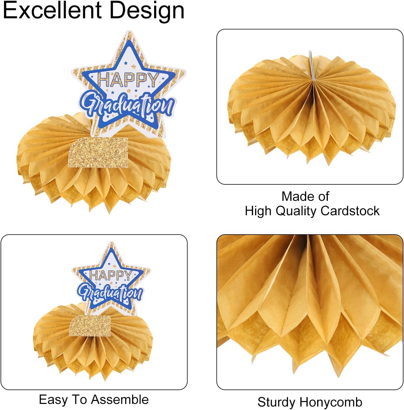 Contenuto del Pacchetto: Riceverai 1 set di centrotavola per la laurea della classe del 2024, che include un manuale di istruzioni, 9 cartoncini decorati e 9 favi di carta (4 blu e 5 tonalità oro). Caratteristiche: Il centrotavola per la decorazione del compleanno dei tavoli presenta un design che aggiunge un tocco festoso a qualsiasi celebrazione di compleanno. Il tavolo è appositamente progettato per le feste di compleanno, rendendolo una decorazione perfetta per l'occasione. Funzione: Questa decorazione da tavolo serve come punto focale per la festa di compleanno, aggiungendo un elemento divertente e decorativo alla celebrazione. Aiuta a impostare il tema dell'evento, migliorando l'estetica complessiva e l'atmosfera della festa. Facile da usare: Semplicemente apri il design e posizionalo sul tavolo come centrotavola. Puoi abbinarlo ad altre decorazioni per feste e accessori per creare un tema di festa di compleanno coerente. Utilizzo multiplo: Adatto sia per uomini che per donne che festeggiano il compleanno. Può essere utilizzato in diverse ambientazioni, tra cui a casa, in una sala da banchetti o in un ristorante.