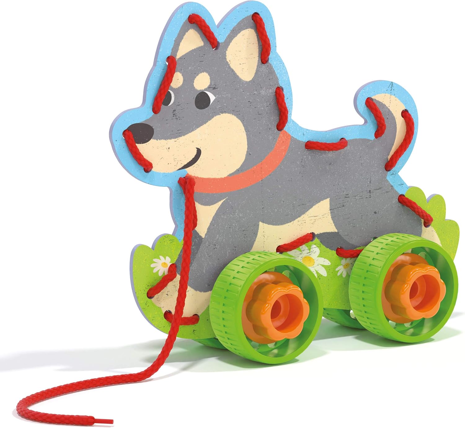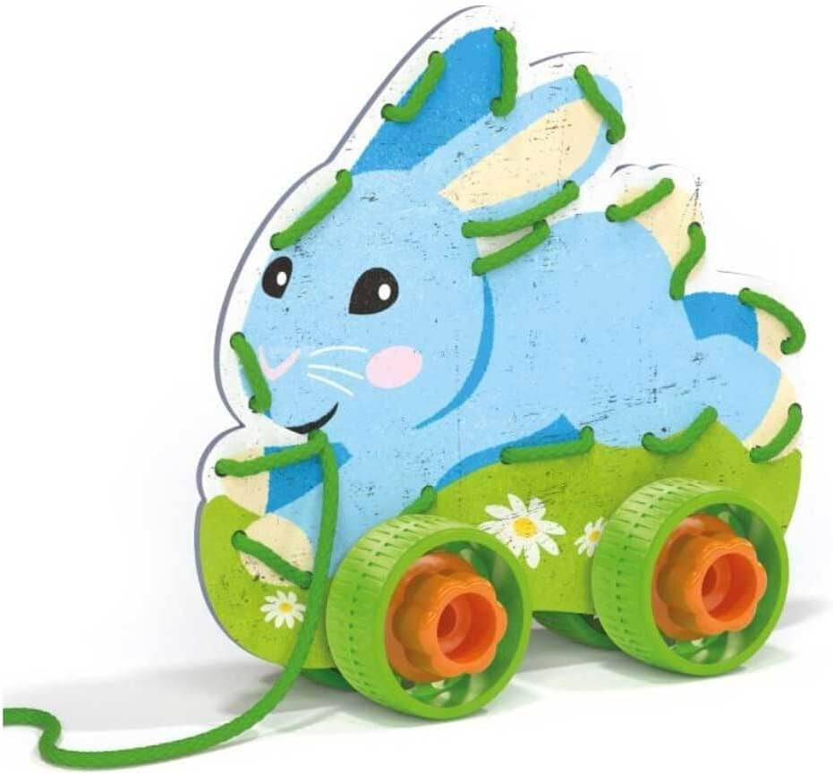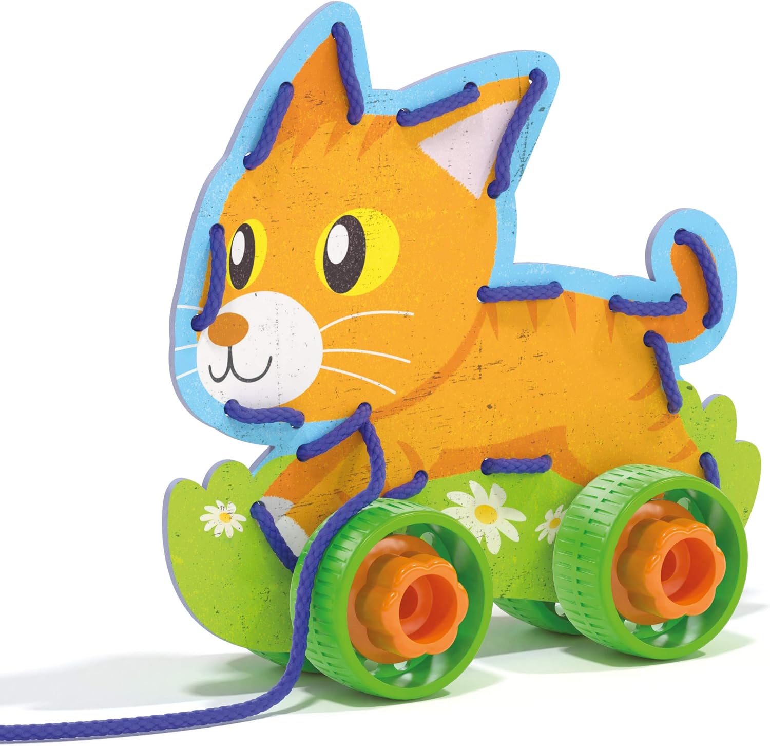 4 simpatici animali da trascinare, in robusto cartoncino Il bambino monterà le ruote con gli appositi bulloni in plastica e trascinerà il gioco grazie ai lacci colorati 4 soggetti: il cane, il gatto, il coniglio e la tartaruga Un originale gioco di cucito da costruire e mettere in movimento Include 4 animali in cartone, 4 lacci colorati. 4 ruote, viti e dadi