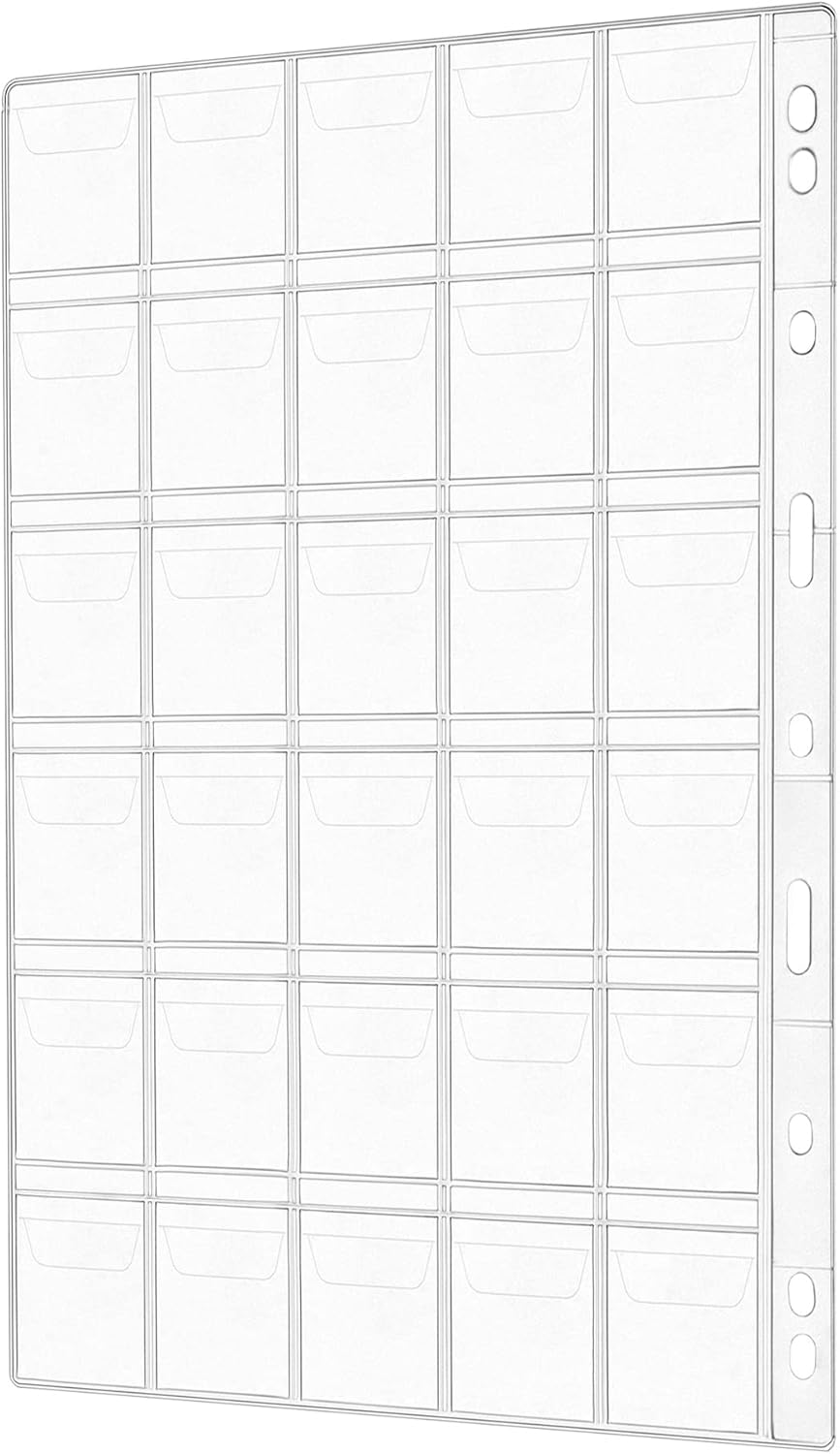 Materiale: le pagine per la raccolta delle monete sono realizzate in materiale PET di alta qualità, spesso e robusto, ben cucito, resistente alla polvere e all'acqua. Dimensioni: dimensioni del foglio: larghezza 21 cm x lunghezza 28 cm, con 30 tasche per foglio. Dimensioni borsa: 35 mm x 35 mm Contenuto della confezione: contiene 24 fogli di pagine per collezionare monete. 360 bagagli in totale. 9 fori: il design standard a 9 fori può ospitare cartelle di varie dimensioni. Design speciale: ogni borsa ha una copertura antiscivolo per evitare che le monete scivolino fuori e ridurre l'ossidazione delle monete.