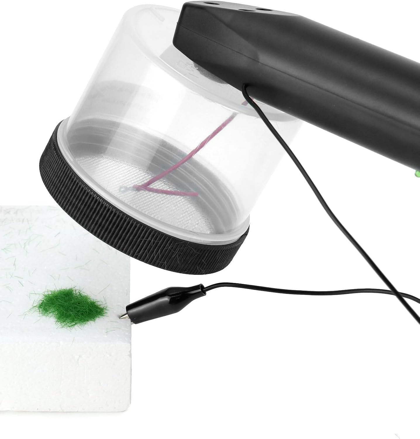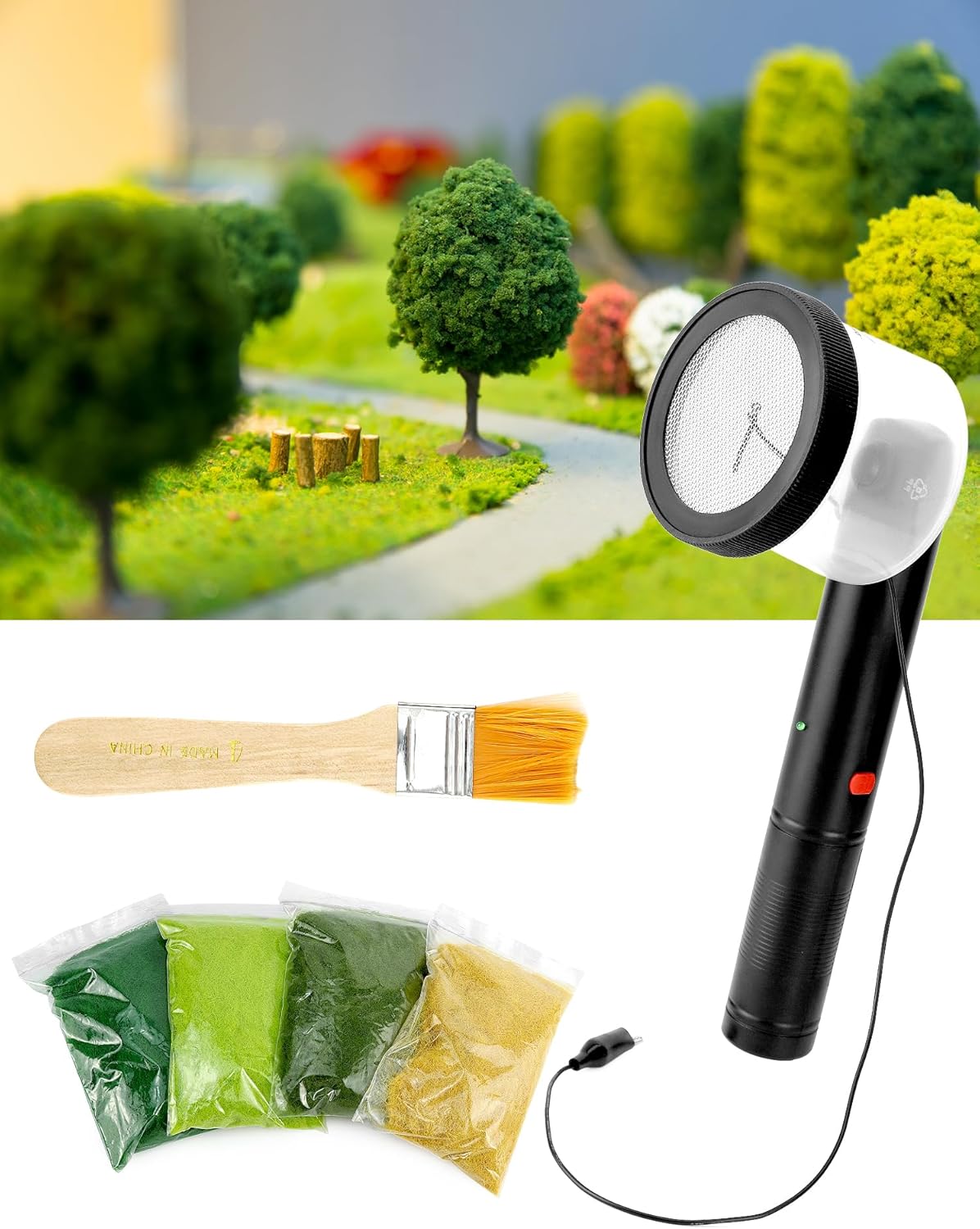 Kit applicatore di erba elettrostatica: l'applicatore di erba elettrostatica è progettato per il floccaggio dell'erba fai-da-te nelle scene del modello. perfetto per piantare modelli, modelli architettonici, modelli paesaggistici, ecc. Contenuto della confezione: 1 applicatore per erba, 4 polvere per erba artificiale (30 g per colore), 1 pennello, 1 manuale di istruzioni. Specifiche di produzione: Tensione di lavoro nominale: DC 3V. Potenza di lavoro nominale: 0,15 W. Tensione di uscita nominale: ≥DC3000V. Corrente operativa nominale: 50 mA Il basso consumo energetico e l'elevata tensione di uscita garantiscono una forte capacità di floccaggio. Utilizzo: 1. Inserire 2 batterie AA (non incluse) nel vano batterie; 2. Riempire la scatola del materiale con erba in polvere; 3. Applicare la colla sulla superficie del modello, quindi collegare la clip a coccodrillo a questa superficie; 4. Tenere premuto l'interruttore, la spia è accesa, la polvere d'erba viene sparsa attraverso la rete metallica e piantata verticalmente sulla superficie adesiva. Avvertenze: 1. Quando la spia è accesa, NON collegare la clip a coccodrillo alla rete metallica, altrimenti causerà un cortocircuito. 2. NON toccare la rete metallica esposta all'elettricità statica ad alta tensione di circa 3000 V CC durante l'uso. 3. Quando la spia si spegne, collegare il coccodrillo alla rete metallica per 5 secondi per eliminare la tensione residua del circuito interno. Pulizia: utilizzare la spazzola (inclusa) per pulire la polvere d'erba rimasta nella scatola del materiale. NON colpire la scatola del materiale, pulire con un panno umido o risciacquare con acqua. NON utilizzare o lasciare in un ambiente umido e NON conservare insieme a gas/liquidi infiammabili ed esplosivi.