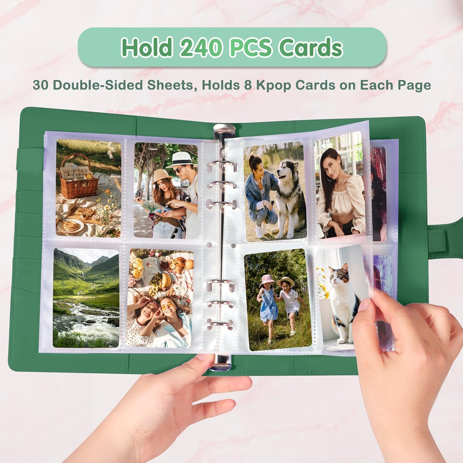 1, Raccoglitore di carte A5 Notebook – Questo organizer per carte fotografiche contiene un album in pelle PU A5 e 30 pagine di ricarica con 4 tasche. Questo può contenere 240 carte. È perfetto per raccogliere carte di dimensioni di 2,5 x 3,5 pollici o più piccoli, come carte fotografiche K-pop, carte da gioco e carte sportive 2, Materiale di alta qualità: l'esterno della cartella è realizzato in pelle PU di alta qualità, molto piacevole al tatto. Combinato con un forte magnete attraente, la fibbia può essere chiusa facilmente e molto saldamente, evitando che il contenuto interno cade. Le custodie per carte di ricarica sono realizzate in polipropilene di alta qualità durevole con tecnologia di saldatura a ultrasuoni, che le rendono resistenti agli strappi, atossiche, senza PVC, innocue per le tue carte 3, Bel colore e 6 anelli di rilegatura: il Macaron viola della copertina rendono questo album di carta legante carino e delicato. L'album a 6 anelli può essere utilizzato anche per l'organizzazione di fogli A5. Sono davvero buoni aiutanti per la memorizzazione di carte, foto e piccoli oggetti 4, Perfetto nei dettagli: le custodie per carte sono ultra trasparenti, in modo da poter vedere chiaramente le tue carte senza doverle estrarre. Gli scomparti apribili dall'alto consentono un facile inserimento e rimozione delle carte. Le tue preziose carte saranno sempre come nuove se le conserverai in questa rilegatrice impermeabile e antipolvere 5, Portatile e facile da riporre: la nostra dimensione dell'album di carte è di 7,3 x 9,2 x 1,3 pollici. Le dimensioni e il peso giusti rendono questo raccoglitore di carte più portatile. Si può facilmente mettere nel cassetto o portarlo all'aperto. È davvero un regalo di compleanno di Natale perfetto per chi ama collezionare le carte